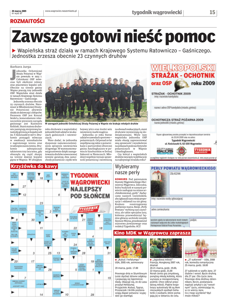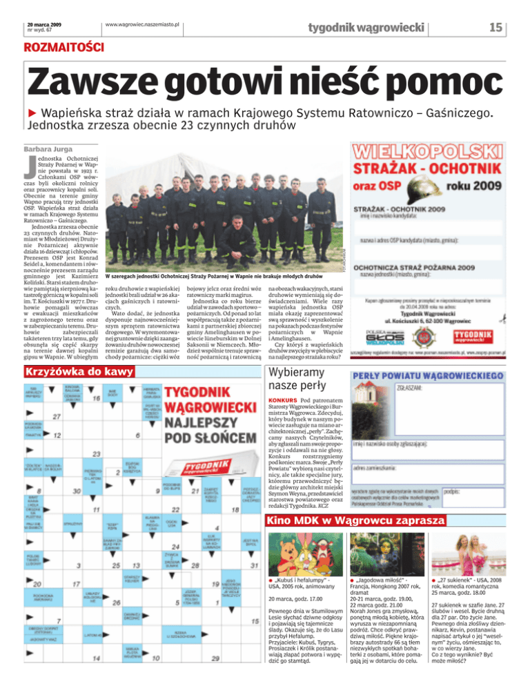 20 marca 2009 nr wyd. 67 www.wagrowiec.naszemiasto.pl 15 tygodnik wągrowiecki ROZMAITOŚCI Zawsze gotowi nieść pomoc b Wapieńska straż działa w ramach Krajowego Systemu Ratowniczo – Gaśniczego. Jednostka zrzesza obecnie 23 czynnych druhów Barbara Jurga FOT.ARCHIWUM J ednostka Ochotniczej Straży Pożarnej w Wapnie powstała w 1923 r. Członkami OSP wówczas byli okoliczni rolnicy oraz pracownicy kopalni soli. Obecnie na terenie gminy Wapno pracują trzy jednostki OSP. Wapieńska straż działa w ramach Krajowego Systemu Ratowniczo – Gaśniczego. Jednostka zrzesza obecnie 23 czynnych druhów. Natomiast w Młodzieżowej Drużynie Pożarniczej aktywnie działa 16 dziewcząt i chłopców. Prezesem OSP jest Konrad Seidel a, komendantem i równocześnie prezesem zarządu gminnego jest Kazimierz Koliński. Starsi stażem druhowie pamiętają sierpniową katastrofę górniczą w kopalni soli im. T. Kościuszki w 1977 r. Druhowie pomagali wówczas w ewakuacji mieszkańców z zagrożonego terenu oraz w zabezpieczaniu terenu. Druhowie zabezpieczali takżeteren trzy lata temu, gdy obsunęła się część skarpy na terenie dawnej kopalni gipsu w Wapnie. W ubiegłym W szeregach jednostki Ochotniczej Straży Pożarnej w Wapnie nie brakuje młodych druhów roku druhowie z wapieńskiej jednostki brali udział w 26 akacjach gaśniczych i ratowniczych. Wato dodać, że jednostka dysponuje najnowocześniejszym sprzętem ratownictwa drogowego. W wyremontowanej gruntownie dzięki zaangażowaniu druhów nowoczesnej remizie garażują dwa samochody pożarnicze: ciężki wóz Krzyżówka do kawy bojowy jelcz oraz średni wóz ratowniczy marki magirus. Jednostka co roku bierze udział w zawodach sportowo – pożarniczych. Od ponad 10 lat współpracują także z pożarnikami z partnerskiej zbiorczej gminy Amelinghausen w powiecie lüneburskim w Dolnej Saksonii w Niemczech. Młodzież wspólnie trenuje sprawność pożarniczą i ratowniczą na obozach wakacyjnych, starsi druhowie wymieniają się doświadczeniami. Wiele razy wapieńska jednostka OSP miała okazję zaprezentować swą sprawność i wyszkolenie na pokazach podczas festynów pożarniczych w Wapnie i Amelinghausen. Czy któryś z wapieńskich druhów zwycięży w plebiscycie na najlepszego strażaka roku? Wybieramy nasze perły KONKURS Pod patronatem Starosty Wągrowieckiego i Burmistrza Wągrowca. Zdecyduj, który budynek w naszym powiecie zasługuje na miano architektonicznej „perły”. Zachęcamy naszych Czytelników, aby zgłaszali nam swoje propozycje i oddawali na nie głosy. Konkurs rozstrzygniemy pod koniec marca. Swoje „Perły Powiatu” wybiorą nasi czytelnicy, ale także specjalne jury, któremu przewodniczyć będzie główny architekt miejski Szymon Weyna, przedstawiciel starostwa powiatowego oraz redakcji Tygodnika. KCZ Kino MDK w Wągrowcu zaprasza a „Kubuś i hefalumpy” USA, 2005 rok, animowany 20 marca, godz. 17.00 Pewnego dnia w Stumilowym Lesie słychać dziwne odgłosy i pojawiają się tajemnicze ślady. Okazuje się, że do Lasu przybył Hefalump. Przyjaciele: Kubuś, Tygrys, Prosiaczek i Królik postanawiają złapać potwora i wypędzić go stamtąd. a „Jagodowa miłość” Francja, Hongkong 2007 rok, dramat 20-21 marca, godz. 19.00, 22 marca godz. 21.00 Norah Jones gra zmysłową, ponętną młodą kobietę, która wyrusza w niezapomnianą podróż. Chce odkryć prawdziwą miłość. Piękne krajobrazy autostrady 66 są tłem niezwykłych spotkań bohaterki z osobami, które pomagają jej w dotarciu do celu. a „27 sukienek” - USA, 2008 rok, komedia romantyczna 25 marca, godz. 18.00 27 sukienek w szafie Jane. 27 ślubów i wesel. Bycie druhną dla 27 par. Oto życie Jane. Pewnego dnia złośliwy dziennikarz, Kevin, postanawia napisać artykuł o jej “weselnym” życiu, ośmieszając to, w co wierzy Jane. Co z tego wyniknie? Być może miłość?