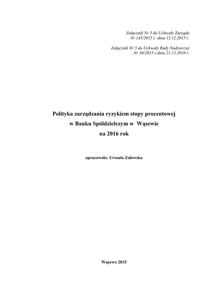Załącznik Nr 5 do Uchwały Zarządu Nr 145/2015 z dnia 15.12.2015 r. Załącznik Nr 5 do Uchwały Rady Nadzorczej Nr 36/2015 z dnia 21.12.2016 r. Polityka zarządzania ryzykiem stopy procentowej w Banku Spółdzielczym w Wąsewie na 2016 rok opracowała: Urszula Zalewska Wąsewo 2015 §1 Celem polityki zarządzania ryzykiem stopy procentowej jest minimalizacja ryzyka związanego z możliwością wystąpienia niekorzystnych zmian rynkowych stóp procentowych i negatywnym wpływem tych zmian na wynik finansowy Banku. W związku z powyższym Bank identyfikuje podstawowe zagrożenia związane z ryzykiem stopy procentowej, z jednoczesnym zastosowaniem odpowiednich metod zarządzania mających na celu eliminację zagrożeń nierównomiernej reakcji różnych pozycji bilansowych na zmiany stóp procentowych a przez to na zmiany przychodów i kosztów. §2 W celu zapewnienia realizacji wyniku z tytułu odsetek, założonego w planie ekonomicznofinansowym, Bank zmienia swoje narażenie na ryzyko stopy procentowej za pomocą określonych metod tj.: 1. inwestowania (głównie poprzez sterowanie terminami zapadalności lokat o stałym oprocentowaniu deponowanych w Banku Zrzeszającym), 2. kredytowania (ustalanie parametrów produktów kredytowych), 3. finansowania zewnętrznego (polityką depozytową), 4. ustalania oprocentowania, 5. zarządzania terminami przeszacowania stóp procentowych dla poszczególnych pozycji bilansu. §3 W procesie zarządzania ryzykiem stopy procentowej Bank podejmuje następujące działania: 1. prowadzi monitoring procentowych, kształtowania się najważniejszych rynkowych stóp 2. analizuje kształtowanie się oprocentowania własnych produktów bankowych na tle stóp rynkowych oraz oferty konkurencyjnych banków i instytucji kredytowych na lokalnym rynku usług finansowych, 3. zarządza poszczególnymi grupami aktywów i pasywów w taki sposób, aby zapewnić realizację optymalnej, w danych warunkach, wysokości marży odsetkowej Banku. 4. przeprowadza testy warunków skrajnych, tj. analizuje wpływ szokowych zmian stóp procentowych (tj. o 200 pktów bazowych) na wynik finansowy. §4 W przypadku zniżkujących rynkowych stóp procentowych Bank kształtuje rozmiar i znak niedopasowania w kierunku wielkości ujemnej, podejmując następujące działania: 1. skraca terminy pozyskiwanych środków oprocentowanych stałą stopą, 2. wydłuża terminy środków lokowanych w Banku Zrzeszającym oprocentowanych stałą stopą, 3. rozbudowuje portfel kredytów o stałym oprocentowaniu (w ramach ustanowionych limitów ograniczających ryzyko stopy procentowej), 4. dokonuje weryfikacji polityki kalkulacji cen kredytów, poprzez zwiększanie udziału marży stałej w stosunku do stóp bazowych przy ustalaniu stóp nominalnych, 5. dokonuje weryfikacji cen depozytów o stałym oprocentowaniu, poprzez preferowanie depozytów o krótszych terminach wymagalności. §5 W przypadku zwyżkujących rynkowych stóp procentowych Bank kształtuje rozmiar i znak niedopasowania w kierunku wielkości dodatniej, podejmując następujące działania: 1) wydłuża terminy pozyskiwanych środków oprocentowanych stałą stopą, 2) skraca terminy lokowanych środków w Banku Zrzeszającym oprocentowanych stałą stopą, 3) ogranicza portfel kredytów o stałym oprocentowaniu, 4) zmniejsza udział stałej marży odsetkowej w relacji do przy kalkulowaniu stóp nominalnych oprocentowania kredytów. stóp bazowych, 5) dokonuje weryfikacji cen depozytów o stałym oprocentowaniu, poprzez preferowanie depozytów o dłuższych terminach wymagalności. §6 W przypadku obniżki rynkowych stóp procentowych Bank będzie prowadził następujące działania: 1. Na bieżąco będą monitorowane stopy procentowe oferowane przez banki konkurencyjne, 2. Bank będzie dążył do nie zwiększania udziału aktywów, których oprocentowanie jest indeksowane do rynkowych stóp procentowych, 3. Bank będzie dbał o zmniejszanie udziału lokat średnio i długoterminowych o stałym oprocentowaniu. 4. W przypadku konieczności obniżenia oprocentowania lokat Bank będzie proponował klientom alternatywne, atrakcyjne produkty, do których będą stosowane bonusy, nagrody itp. §7 Niniejsza Polityka podlega okresowym przeglądom, zgodnie z zapisami Instrukcji sporządzania informacji zarządczej. Polityka zarządzania ryzykiem stopy procentowej oraz jej zmiany wchodzą w życie z dniem podjęcia uchwały przez Radę Nadzorczą Banku.