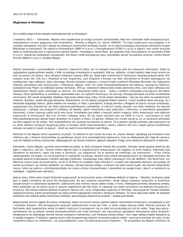 2012-07-31 09:45:23 Wyprawa w Himalaje Zza urzędniczego biurka zdobyła sześciotysięcznik w Himalajach 1 kwietnia 2012 r. – Katmandu. Wąskie ulice wypełnione po brzegi sznurem samochodów. Nad nimi dziesiątki kabli energetycznych, rozpostartych niczym pajęczyna nad mrowiskiem. Witamy w Nepalu na „Dachu ŚWIATA”. To tutaj rozpoczyna się przygoda, a w zasadzie sprawdzian siły woli i okazja do ciekawych przemyśleń dla Beaty Kusiak, na co dzień piastującej stanowisko sekretarza Urzędu Miejskiego w Koluszkach. Po zdobyciu Kilimandżaro (5895 m n.p.m.) i Glossglocknera (3798 m n.p.m) w Alpach, tym razem przyszła kolej na sześciotysięcznik w najwyższych górach świata – Himalajach. Island Peak (po nepalsku Imja Tse) położony na wysokości 6189 m n.p.m. okazał się niezwykłym wyzwaniem. Ale która z osób kochających góry, potrafiłaby oprzeć się pokusie ujrzenia z bliska Mount Everest (8848 m n.p.m.), siedziby Bogów. Podróż samolotem z przesiadkami w Rzymie i katarskim Doha, już na wstępie stworzyła pole do ciekawych obserwacji. Katar to najbogatsze społeczeństwo świata, z PKB na jednego mieszkańca w wysokości 106 tys. dolarów. Liczbę ludności tego kraju ocenia się dziś na ponad 1,6 miliona, choć oficjalne statystyki mówią o 800 tys. Skąd takie rozbieżności? Katarczycy stanowią jedynie około 15% ludności kraju (ok. 250 tys.). Pozostali to tzw. expatriots, czyli imigranci z Europy czy USA, zatrudnieni w firmach zajmujących się wydobyciem ropy naftowej i gazu ziemnego. Resztę stanowią imigranci z innych krajów arabskich Bliskiego Wschodu (np. Egipcjanie masowo zatrudniani jako nauczyciele), z Pakistanu, Nepalu, Indii i Sri Lanki (niewykwalifikowana siła robocza, najczęściej robotnicy budowlani) oraz Filipin czy Indonezji (pomoc domowa). 250 tys. rodowitych Katarczyków dzięki płynnemu złotu, czyli ropie naftowej oraz największym złożom gazu ziemnego na świecie, ma stosunkowo łatwe życie. – Jedna z polskich stewardes pracujących dla Qatar Airways, którą spotkaliśmy w samolocie, opowiadała nam, że rodowici Katarczycy nie pracują. Dostają pieniądze od króla na dostatnie utrzymanie. Był nawet przypadek młodego mężczyzny Katarczyka, który chciał zostać stewardem, i tak jak one latać na powietrznych szlakach. Niestety, dostał decyzję odmowną. Stwierdzono, że nie będzie usługiwał białym ludziom. I teraz wyobraź sobie sytuację, że z niezwykle bogatego Kataru, gdzie władze nie wiedząc co robić z pieniędzmi, budują lotniska z drogami na płycie niczym autostrady, wyposażają linie powietrzne we flotę najnowocześniejszych samolotów, w których każdy pasażer ma mały telewizor do własnej dyspozycji, z takiego oto przepychu trafiamy do Nepalu, gdzie mieszkańcy żyją właściwie z rolnictwa, w warunkach gospodarki naturalnej, a dzieci pracują ciężko od 8 roku życia. Przykładem jest jeden z naszych dwóch tragarzy, który towarzyszył nam podczas wspinaczki w Himalajach. Był nim 15-letni chłopak, który 30 kg ciężar doniósł nam na 5400 m n.p.m., tymczasem ja swój kilkunastokilogramowy plecak ledwo wniosłam na 4 piętro w bloku. Co gorsze, chłopiec ten trudził się po to, by za zarobione pieniądze na kilka tygodni iść do szkoły. Tam wykształcenie nie uzyskuje się bowiem za darmo. To w pewien sposób przeraża, gdy spojrzymy na to, jakim startem życiowym dysponują dzieci w Europie, które mają komputery, rowery, kolonie. Dla nich, często sporym problemem okazuje się wyjście z psem na spacer – dzieli się swoimi przemyśleniami pani Beata. Kwiecień to dla Nepalu okres ożywionej turystyki. To właśnie w tym czasie do kraju na „Dachu Świata” zjeżdżają się himalaiści oraz miłośnicy gór z różnych kontynentów, by spróbować swych sił w wysokogórskiej wspinaczce. Czas na zdobywanie gór mają do czerwca, czyli do nadejścia okresu monsunów, objawiających się silnymi wiatrami, gęstymi opadami śniegu oraz ulewnymi deszczami w dolinach. Katmandu, stolica Nepalu, pomimo wszechobecnej biedy, to dość przyjazne miasto dla turystów. Posiada nawet typową dzielnicę dla gości z zagranicy. Na tzw. Tamelu można dobrze zjeść w zagranicznych restauracjach (ze względu na brak miejsca, większość jest lokowana na dachach), napić się kawy w Starbuck, czy zaopatrzyć się w ubrania do trekkingu czy wspinaczki. – Przez chwilę zastanawiałam się nawet, czy nie przyjechać tu specjalnie na zakupy, bowiem ceny ubrań specjalistycznych są naprawdę śmieszne. Na przykład spodnie trekkingowe z bardzo dobrego materiału, chłodzącego nogi, takich markowych firm jak Wolfskin, The Nord Face, czy Mammut można kupić po przeliczeniu, za 40 zł. W Polsce to wydatek rzędu kilkuset zł. A wybór jest naprawdę olbrzymi, poczynając od kurtek puchowych, po cienkie spodenki. Co ciekawe, istnieją również sklepy, w których nie tylko można kupić, ale również odsprzedać rzeczy, które po zejściu z ośmiotysięczników nie mamy ochoty transportować z powrotem do swego kraju i płacić w samolocie za nadbagaż – wyjaśnia pani sekretarz. Jedyna rzecz, która może zmącić beztroski wypoczynek, to konieczność wręcz chorobliwej dbałości o higienę. – Niestety, tamtejsza woda jest w ogóle niezdatna do picia dla Europejczyka. By być pewnym zawartości, wodę należy kupować wyłącznie w butelkach zaopatrzonych w plastikowe banderolki. Zabronione jest również mycie zębów wodą z kranu. Niebezpieczeństwo zakażenia amebą, która pozostaje już do końca życia w naszym organizmie jest tak duże, iż nakazuje się nawet zaciskanie ust podczas korzystania z prysznica. Nie można również dotykać brudnymi rękoma ust i oczu. Organizator wyprawy w Himalaje, mój przyjaciel Tomasz Kobielski (zdobywca Korony Ziemi) przestrzegał nas także przed kupowaniem owoców z lokalnych sklepów. To samo dotyczyło lodów. W zasadzie wskazano nam jedyni