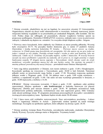 WRÓBEL 2 lipca 2009 * Dzisiaj czwartek, obudziliście się juŜ na legalnej, bo uroczyście otwartej 25 Uniwersjadzie. Organizatorzy okazali się dosyć mało zdeterminowani w tworzeniu kolumny marszowej, przeto miejscami bardziej wyglądało to na przechadzkę po estakadach Belgradu, albo kondukt. Jak kto woli. Polska ekipa nie odbiegała od pozostałych, chociaŜ wyjątkowo byliśmy oporni na propozycje podbiegania. Dominika CHORĄśYNA wzorowa, zniknęła nam z oczu na pierwszym zakręcie, i odnalazła się dopiero na estradzie. I to wszystko dzięki klapkom szybko - biegom. * Pierwszy mecz koszykarek, które odpłaciły się Chinkom za nasza poraŜkę piłkarską. Wczoraj było zwycięstwo 83:73. Na początku bardzo skuteczna gra, w sumie 27 punktów Justyny śurowskiej i trochę nerwowa końcówka IV kwarty. – Pierwsze mecze zawsze są trudne, zwłaszcza, Ŝe Chinki grają inną koszykówkę niŜ europejska. Ich siła opiera się na grze jeden na jeden i rzutach za trzy punkty. Potrafią seriami trafiać i trzeba je mieć pod kontrolą, Ŝeby nie odskoczyły. Udało się to. Graliśmy od początku mądrze, szybko i skutecznie. W trzeciej kwarcie zaczęło się nieco problemów i pojawiła się zadyszka, ale to przez to, Ŝe ciągle jesteśmy w etapie budowania zespołu. W drugim meczu zagramy z Turczynkami. JeŜeli chcemy wejść do strefy medalowej, wszystkie spotkania muszą być dla nas bardzo waŜne. Nie moŜemy się pomylić i musimy pokazać prawdziwą siłę naszej druŜyny – powiedział trener Dariusz Maciejewski. * Jutro ciąg dalszy pojedynków z Chinami, tym razem siatkarze o godz. 13.00 z Hongkongiem. Koszykarki spotkają się wieczorem z Turczynkami, godz. 20.00 w hali śeleŜnik. Natomiast piłkarki noŜne za przeciwniczki mają Serbię, o godz. 17.30. Wcześniej rozpoczną spotkanie piłkarze wodni z Węgrami, godz. 15.40. Na plansze rano o godz. 9.00 wyjdą szermierze – szabliści, a szpadzistki od godz. 11.00. Tak samo od rana wystartuje gimnastyka w druŜynie, o godz. 10.00 męŜczyźni, a kobiety o 14.30. UWAGA! Dzisiaj wieczorem (czwartek, 2 lipca) o godz. 21.00 spotkanie całej polskiej reprezentacji. Miejsce spotkania - sala konferencyjna w budynku biurowym (za placem flagowym). Zbiórka pod naszym domem o godz. 20.45. W spotkaniu uczestniczyć będą przedstawiciele polskiej ambasady, wolontariusze oraz inni zaproszeni goście. Mile widziany mały akcent polskiego stroju. W programie prezentacja poszczególnych dyscyplin i zawodników tworzących uniwersjadowy team. Spotkanie będzie trwało około 30-40 minut. * Od 3 lipca rusza cykl wykładów motywacyjnych. Nasz universjadowy psycholog – Łukasz Bujok z organizacji Athletes in Action – poprowadzi siedem spotkań na temat treningu mentalnego. Szczegóły na spottkaniu ogólnym, które odbędzie się dzisiaj o godz. 20.30. * Dzisiaj urodziny świętuje Beata Przewłocka, zawodniczka taekwondo, studentka Olsztyńskiej Szkoły WyŜszej. śyczymy udanego startu w Belgradzie. Trzymamy kciuki!
