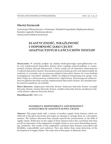 STUDIA OECONOMICA POSNANIENSIA 2015, vol. 3, no. 6 Maciej Szymczak Uniwersytet Ekonomiczny w Poznaniu, Wydział Gospodarki Międzynarodowej, Katedra Logistyki Międzynarodowej [email protected] ELASTYCZNOŚĆ, WRAŹLIWOŚĆ I ODPORNOŚĆ JAKO CECHY ADAPTACYJNYCH ŁAŃCUCHÓW DOSTAW Streszczenie: W artykule podjęto się zadania deskryptywnego uporządkowania wielu cech współczesnych łańcuchów dostaw, które znajdują odzwierciedlenie w wymienionych poniżej słowach kluczowych, a które weszły już do kanonów mianownictwa w zakresie łańcuchów dostaw. Rozważania nad proweniencją tych cech doprowadziły do ustalenia, że wszystkie one są wyrazem adaptacji łańcuchów dostaw do coraz bardziej wymagających warunków działania. Efekty tej adaptacji konstytuują trzy grupy cech, które wiążą się z elastycznością, wrażliwością i odpornością. Wyznaczają one jednocześnie trzy główne kierunki rozwoju współczesnych łańcuchów dostaw. Ich charakterystyka stanowi zasadniczy cel artykułu. Słowa kluczowe: adaptacyjne łańcuchy dostaw, elastyczne łańcuchy dostaw, szczupłe łańcuchy dostaw, zwinne łańcuchy dostaw, wrażliwe łańcuchy dostaw, proaktywne łańcuchy dostaw, odporne łańcuchy dostaw. Klasyfikacja JEL: D02, L14. FLEXIBILITY, RESPONSIBILITY AND RESILIENCY AS FEATURES OF ADAPTIVE SUPPLY CHAINS Abstract: This paper deals with a variety of modern supply chain features which are reflected in the given keywords and makes an attempt to arrange them in a descriptive manner. The features discussed have already entered the nomenclature in the field of supply chains. Reflection on the origin of these features led to the conclusion that they are all an expression of the adaptation of supply chains to ever more demanding operating conditions. The results of this adaptation constitute three features associated with flexibility, responsibility and resiliency. They also define three main directions of the development of supply chains. The main aim of this paper to illustrate these. 40 Maciej Szymczak Keywords: adaptive supply chains, flexible supply chains, lean supply chains, agile supply chains, responsive supply chains, proactive supply chains, resilient supply chains. Wstęp Nie ma przesady w stwierdzeniu, że obecnie najważniejszym megatrendem rozwojowym łańcuchów dostaw jest zdolność przystosowywania się. Według D. Ivanova, B. Sokolova i J. Kaeschela [2010, s. 411] łańcuch dostaw można nazwać adaptacyjnym (adaptive supply chain), jeśli potrafi dostosować się do: –– zmian w otoczeniu rynkowym i funkcjonowania w warunkach niepewności, –– zmian w środowisku wykonawczym poszczególnych działań, –– oraz wewnętrznych zmian w samym łańcuchu dostaw poprzez wykorzystanie rezerw strukturalno-funkcjonalnych i lepszą koordynację wynikającą z zakrojonego na szeroką skalę zastosowania technologii teleinformatycznych, w szczególności internetowych. Ze zdolności przystosowania się wywodzą się główne kierunki ewolucji współczesnych łańcuchów dostaw. Dotyczą one zwiększania: –– elastyczności działania, –– wrażliwości na potrzeby odbiorcy, –– odporności na zakłócenia. Te kierunki dostrzegane są już od dłuższego czasu. Można powiedzieć, że utrwaliły się w praktyce biznesowej. Przede wszystkim jednak zakładają one jasno określony cel w postaci efektu dokonywanych zmian w łańcuchach dostaw. Rozpatrywać je należy długookresowo, ale nie oznacza to, że należy je traktować w kategorii chronicznych, permanentnych trendów. Nie jest to możliwe przy obecnym tempie zmian, jakie zachodzą w sferze gospodarczej. Niewątpliwie warunkiem koniecznym do odnoszenia sukcesów w ramach któregokolwiek z wymienionych kierunków rozwoju jest współpraca w łańcuchu dostaw. Musi to być szeroka i wielowątkowa współpraca zarówno zewnętrzna, jak i wewnętrzna, najlepiej multilateralna, która osadzona jest na solidnych podstawach zasobowych i procesowych, jasno określonych celach oraz solidnym zaangażowaniu i wzajemnym zobowiązaniu1. Co więcej, powinna wykraczać poza zwyczajową, standardową współpracę, dlatego 1 Chodzi o najwyższy poziom współpracy w systematyce D. Colemana [2012], który rozróżnił aż pięć poziomów współpracy w odniesieniu do stosowanych pojęć utożsamianych kontekstualnie z takim działaniem. Elastyczność, wraźliwość i odporność jako cechy adaptacyjnych łańcuchów41 można ją nazwać współpracą czterowymiarową (4D collaboration) [Gilmore 2014], której fundament wyznacza struktura złożona z czterech elementów: danych, ludzi, narzędzi i procesów. Kanwą tej współpracy są wspólne procesy, których przebieg określają przyjęte metodologie wykorzystania zasobów oraz role przypisane ludziom i zadania, za które są oni odpowiedzialni. Celem artykułu jest charakterystyka wymienionych wyżej trzech głównych kierunków rozwoju łańcuchów dostaw we współczesnej gospodarce światowej, które znamienne są dla adaptacyjnych łańcuchów dostaw. 1. Elastyczne łańcuchy dostaw Elastyczność polega na umiejętności przystosowania się do zmiennych warunków funkcjonowania. Pozwala ona wyjść obronną ręką z różnych niespodziewanych sytuacji przy zachowaniu ciągłości działania, a czasem nawet niepogorszonych efektów działania. Elastyczność pozwala wykorzystać te sytuacje, ujawniając atuty firmy i zdobywając przewagę nad innymi. Z perspektywy uzyskiwanych wyników, odnosząc się do klasycznych wyznaczników efektywności, elastycznością można określić szybkość, z jaką łańcuch dostaw może osiągnąć satysfakcjonujące wyniki w zakresie poziomu obsługi (jakości), czasu i kosztów. Wdrożenie rozwiązań zapewniających elastyczność jest uzasadnione, w przypadku kiedy [Simchi-Levi, Kaminsky i Simchi-Levi 2003, s. 199]: –– odczuwalna jest wysoka zmienność warunków działania; –– korzyści dyslokacji
