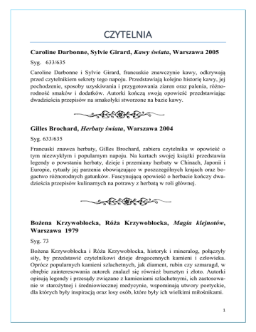 CZYTELNIA Caroline Darbonne, Sylvie Girard, Kawy świata, Warszawa 2005 Syg. 633/635 Caroline Darbonne i Sylvie Girard, francuskie znawczynie kawy, odkrywają przed czytelnikiem sekrety tego napoju. Przedstawiają kolejno historię kawy, jej pochodzenie, sposoby uzyskiwania i przygotowania ziaren oraz palenia, różnorodność smaków i dodatków. Autorki kończą swoją opowieść przedstawiając dwadzieścia przepisów na smakołyki stworzone na bazie kawy. Gilles Brochard, Herbaty świata, Warszawa 2004 Syg. 633/635 Francuski znawca herbaty, Gilles Brochard, zabiera czytelnika w opowieść o tym niezwykłym i popularnym napoju. Na kartach swojej książki przedstawia legendy o powstaniu herbaty, dzieje i przemiany herbaty w Chinach, Japonii i Europie, rytuały jej parzenia obowiązujące w poszczególnych krajach oraz bogactwo różnorodnych gatunków. Fascynującą opowieść o herbacie kończy dwadzieścia przepisów kulinarnych na potrawy z herbatą w roli głównej. Bożena Krzywobłocka, Róża Krzywobłocka, Magia klejnotów, Warszawa 1979 Syg. 73 Bożena Krzywobłocka i Róża Krzywobłocka, historyk i mineralog, połączyły siły, by przedstawić czytelnikowi dzieje drogocennych kamieni i człowieka. Oprócz popularnych kamieni szlachetnych, jak diament, rubin czy szmaragd, w obrębie zainteresowania autorek znalazł się również bursztyn i złoto. Autorki opisują legendy i przesądy związane z kamieniami szlachetnymi, ich zastosowanie w starożytnej i średniowiecznej medycynie, wspominają utwory poetyckie, dla których były inspiracją oraz losy osób, które były ich wielkimi miłośnikami. 1 Rośliny kosmetyczne, tekst Bohumír Hlava, František Starý, František Pospišil, tablice barwne Zdenka Krejčová, Warszawa 1984 Syg.64 Rośliny kosmetyczne rozpoczyna krótki wstęp dotyczący zastosowania roślin w pielęgnacji urody i tworzeniu kosmetyków oraz perfum. Następnie autorzy prezentują opisy poszczególnych gatunków roślin stosowanych w kosmetyce, ich pochodzenie i zasięg, zbiór i przygotowanie surowca, składniki oraz zastosowanie. Anna Huete, Aromaterapia. Praktyczny przewodnik po olejkach eterycznych, Kielce 2015 Syg. 66/69 Autorka zapoznaje czytelnika ze sposobami produkcji olejków eterycznych, zarówno w przeszłości, jak i współcześnie, ich dobroczynnego działania na zdrowie człowieka i różnorodnego zastosowania. Tłumaczy, czym jest aromaterapia oraz jak można samodzielnie wykorzystywać ją w domu. Przedstawia najpowszechniej stosowane olejki eteryczne wraz z ich zastosowaniem terapeutycznym i kosmetycznym. Barbara Włodarczyk, Zdrowie od kuchni, Białystok 2008 Syg. 61 Barbara Włodarczyk, wychodząc z założenia, że przyczyną wielu dolegliwości zdrowotnych jest nieodpowiednio dobrana dieta, doradza jak skomponować codzienne menu by zapobiec chorobom lub je wyeliminować. Przedstawia jak składniki żywności i wybrane pokarmy wpływają na zdrowie człowieka. Opisuje również wpływ diety na psychikę. Ostatni rozdział zawiera porady jak ułożyć dietę, by zapobiegać lub leczyć szesnaście różnych chorób czy zaburzeń, jak na przykład nadciśnienie czy osteoporoza. 2 Helmut Jantra, Tajemniczy świat ziół. Rośliny przyprawowe i lecznicze. Sekrety uprawy i przechowywania. Zastosowanie kulinarne, Warszawa 1996 Syg. 633/635 Autor rozpoczyna Tajemniczy świat ziół krótkim wstępem o znaczeniu ziół w mitach i wierzeniach ludowych oraz o historii wykorzystania ziół przez człowieka. W dalszej części swojej pracy pomaga w wybraniu najlepszego miejsca dla ziół w ogrodzie, przedstawia również gotowe kompozycje ziołowe. Uczy jak pielęgnować, rozmnażać, zbierać i przechowywać zioła. Pracę kończą opisy najpopularniejszych gatunków ziół i roślin przyprawowych, zapoznające czytelnika ze sposobami ich uprawy, zbioru i zastosowania. Joëlle Godefroid, Bernard Barbier, Zdobienie przedmiotów. Malowanie. Postarzanie. Złocenie, Warszawa 2010 Syg. 74 Artyści Joëlle Godefroid i Bernard Barbier uczą jak ozdobić skromne przedmioty codziennego użytku, by uczynić z nich niezwykłą ozdobę. Doradzają, jak zorganizować warsztat pracy oraz jakie przybory mogą okazać się przydatne. Przedstawiają podstawowe techniki zdobienia, na przykład jak uzyskać imitację płatków złota czy laki chińskiej. Samodzielne wykonanie poszczególnych projektów ułatwiają szczegółowe opisy oraz ilustracje ukazujące kolejne etapy pracy. J. Stephan Jellinek, Perfumy - marzenie we flakonie. Istota perfum, ich działanie, dobór i zastosowanie zapachów klasycznych i nowoczesnych, Warszawa 1994 Syg. 66/69 Perfumy – marzenie we flakonie uczy jak wybierać i nosić perfumy. Porusza takie zagadnienia jak sztuka noszenia zapachu, właściwe dozowanie perfum, 3 schemat działania zapachu, powstawanie perfum, flakony jako dzieła sztuki. Książkę kończy rozdział Zapachy dla mężczyzny. WYPOŻYCZALNIA Beata Pawlikowska, Moje zdrowe przepisy, Warszawa 2014 Syg. 641 Beata Pawlikowska w swojej książce promuje zdrowe odżywianie i samodzielne gotowanie posiłków oraz przestrzega przed wysoko przetworzoną żywnością. Przedstawia przepisy zebrane według wcześniej wybranego kryterium: szybkie i łatwe do przygotowania oraz zdrowe. Helga Vollmer, Zdrowe serce. 100 wskazówek na długie życie, Berlin 1998 Syg. 61 Helgy Vollmer w swojej książce wyjaśnia jak funkcjonuje serce i układ krążenia oraz mózg i centralny układ nerwowy. Tłumaczy, czym jest zawał serca i udar mózgu oraz jakie czynności należy podjąć w przypadku ich wystąpienia. Analizuje czynniki zagrożenia, których nie można uniknąć jak wiek, płeć, predyspozycje genetyczne, rasa, jak również czynniki, na które mamy wpływ, jak tryb życia i sposób odżywiania się. Håkan Nesser, Jedenaście dni w Berlinie, Warszawa 2016 Syg. 821.113.3/.6-3 powieść szwedzka XXI w. Autorem powieści jest szwedzki pisarz Håkan Nesser (ur. 1950), jede