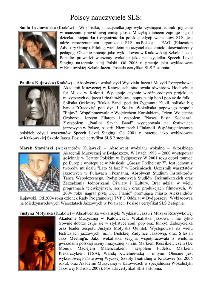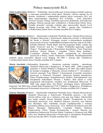 Polscy nauczyciele SLS: Sonia Lachowolska (Kraków) – Wokalistka, nauczycielka jogi wykorzystująca techniki jogiczne w nauczaniu prawidłowej emisji głosu. Muzyką i tańcem zajmuje się od dziecka. Inicjatorka i organizatorka polskiej edycji warsztatów SLS, jest takŜe reprezentantem organizacji SLS na Polskę – EAG (Education Advisory Group). Filolog, wieloletni nauczyciel akademicki, doświadczony pedagog. Obecnie pracuje jako wykładowca w Krakowskiej Szkole Jazzu. Ponadto prowadzi warsztaty wokalne jako nauczycielka Speech Level Singing na terenie całej Polski. Od 2008 r. pracuje jako wykładowca w Krakowskiej Szkole Jazzu. Posiada certyfikat SLS 2 stopnia. Paulina Kujawska (Kraków) – Absolwentka wokalistyki Wydziału Jazzu i Muzyki Rozrywkowej Akademii Muzycznej w Katowicach, studiowała równieŜ w Hochschule fur Musik w Kolonii. Występuje czynnie w róŜnorodnych projektach muzycznych od jazzu i rhythm&bluesa poprzez hip hop i pop aŜ do folku. Solistka Orkiestry "Kukla Band" pod dyr.Zygmunta Kukli, solistka big bandu "Cracovia" pod dyr. I. Stojka. Wokalistka popowego zespołu "Enjoy". Współpracowała z Wojciechem Karolakiem, Triem Wojciecha Groborza. Jerzym Filarem i zespołem "Nasza Basia Kochana". Z zespołem „Paulina Savah Band” występowała na festiwalach jazzowych w Polsce, Austrii, Niemczech i Finlandii. Współorganizatorka polskich edycji warsztatów Speech Level Singing. Od 2001 r. pracuje jako wykładowca w Krakowskiej Szkole Jazzu. Posiada certyfikat SLS 2 stopnia. Marek Stawiński (Aleksandrów Kujawski) – Absolwent wydziału wokalno – aktorskiego Akademii Muzycznej w Bydgoszczy. W latach 1998 – 2000 występował gościnnie w Teatrze Polskim w Bydgoszczy W 2001 roku odbył tournée po Europie występując w Musicalu „Grosse Freiheit nr 7”. Jest jednym z twórców musicalu "Lato Miłości" w Kozienicach. Uczestnik warsztatów jazzowych w Puławach i Poznaniu. Absolwent Studium Instruktorów Tańca Współczesnego, Podyplomowych Studiów Dziennikarskich oraz Zarządzania Jednostkami Oświaty i Kultury. Brał udział w wielu programach telewizyjnych, serialach oraz produkcjach filmowych. W 2004 roku nagrał płytę „Ku Planie” promującą miasto Aleksandrów Kujawski. Od 2004 roku członek Rady Programowej TVP 3 Oddział w Bydgoszczy. Wykładowca na Międzynarodowych Warsztatach Jazzowych w Puławach. Posiada certyfikat SLS 2 stopnia. Justyna Motylska (Kraków) – Absolwentka wokalistyki Wydziału Jazzu i Muzyki Rozrywkowej Akademii Muzycznej w Katowicach. Wokalistka jazzowa i nie tylko (równie dobrze czuje się w stylistyce soul, pop oraz funky). ZałoŜycielka oraz leader zespołu Justyna Motylska Quintet. Występowała na wielu festiwalach jazzowych, m.in. Bielskiej Zadymce Jazzowej, oraz Silesian Jazz Meeting'u. Jako wokalistka sesyjna współpracowała z wieloma gwiazdami polskiej sceny muzycznej - m.in. Markiem Kościkiewiczem (De Mono), Maciejem Maleńczukiem i zespołem Pudelsi, Markiem Piekarczykiem (TSA), Wandą Kwietniewską i innymi. Obecnie jest wykładowcą Państwowej WyŜszej Szkoły Teatralnej w Krakowie (od 2006 roku), oraz Akademii Muzycznej w Katowicach w specjalności Wokalistyki Jazzowej (od roku 2007). Posiada certyfikat SLS 1 stopnia. Bartek Caboń (Lublin - Warszawa). Absolwent wokalistyki Wydziału Jazzu i Muzyki Estradowej na Uniwersytecie Marii Curie - Skłodowskiej w Lublinie. Prowadzi studio wokalne w Warszawie i w Lublinie. Współpracował z m.in Budką Suflera, Basią Szade, Gosią Stępień, Urszulą, Izabelą Trojanowską, Marcinem Maliszewskim, grupą Press. Do jego uczniów naleŜeli bądź naleŜą: My-Key (finalista Coke Life Festival), Wiktoria Trynkiewicz (polska wersja High School Musical, laureatka Szansy na Sukces), Marika, Magda Osińska (Teatr Roma), Agata Grzesiuk (Buffo), Łukasz Szadujko (Press- zwyciezca Przebojem na Antene) i wielu innych. Posiada certyfikat SLS 1 stopnia Dominika Płonka (Gliwice) – Absolwentka Akademii Muzycznej w Katowicach i studium reŜyserii dźwięku w Krakowie, studiowała ponadto filologię francuską w Gliwicach. Laureatka festiwali piosenki studenckiej, uczestniczyła w warsztatach wokalnych i jazzowych w ChodzieŜy i Świnoujściu. Wokalistka i flecistka zespołu folkowo-szantowego "Sąsiedzi" (zdobywcy Grand Prix międzynarodowego festiwalu Shanties 2008), współpracuje m.in. z Teatrem "A". Koncertuje na terenie całej Europy. Pracuje w MłodzieŜowym Domu Kultury w Gliwicach jako instruktor zespołów wokalnych oraz śpiewu solowego. Jej uczniowie zdobywają laury na ogólnopolskich festiwalach młodzieŜowych. Prowadzi warsztaty wokalne na terenie całego kraju. Przygotowuje się do certyfikatu SLS 1 stopnia. Katarzyna Godzisz–Antonik (Dębica) – Absolwentka wokalistyki Wydziału Jazzu i Muzyki Rozrywkowej Akademii Muzycznej w Katowicach. Nauczycielka śpiewu współpracująca z Ośrodkami Kultury w Dębicy i Opatowie, z Kolegium Nauczycielskim Języków Obcych(emisja głosu mówionego), prowadzi własne Studio Piosenki w Dębicy, a jej uczniowie zdobywają nagrody na ogólnopolskich i międzynarodowych festiwalach wokalnych. Jest współtwórcą musicalu "Cudowne Marzenia" w Nowym Sączu oraz reŜyserem wielu koncertów. Koncertuje wraz ze swoim zespołem, a takŜe udziela głosu jako wokalistka sesyjna. Przygotowuje się do certyfikatu SLS 1 stopnia. Piotr Markowski (Radom), muzyk, pianista, aranŜer. Pre-certyfikowany nauczyciel śpiewu metodą Speech Level Singing. Absolwent Akademii Muzycznej im. Feliksa Nowowiejskiego w Bydgoszczy oraz Wydziału Artystycznego Uniwersytetu Marii-Curie Skłodowskiej w Lublinie. Swoje umiejętności doskonalił bądź doskonali pod okiem prof. Jadwigi Gałęskiej-Tritt, Kathy Kennedy, prof. ElŜbiety Wtorkowskiej i Soni Lachowolskiej. Obecnie z pasją i zaangaŜowaniem oddaje się pedagogice wokalnej, zgłębiając naturę, fizjologię oraz funkcjonowanie głosu ludzkiego. Prowadzi studio piosenki. AngaŜuje si