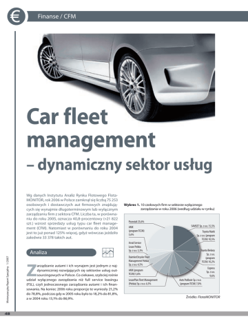 Finanse Technologie / CFM Car fleet management – dynamiczny sektor usług Wg danych Instytutu Analiz Rynku Flotowego FlotaMONITOR, rok 2006 w Polsce zamknął się liczbą 75 253 osobowych i dostawczych aut firmowych znajdujących się wynajmie długoterminowym lub wyłącznym zarządzaniu firm z sektora CFM. Liczba ta, w porównaniu do roku 2005, oznacza 40,8-procentowy (+21 822 szt.) wzrost sprzedaży usług typu car fleet management (CFM). Natomiast w porównaniu do roku 2004 jest to już ponad 125% więcej, gdyż wówczas jeździło zaledwie 33 378 takich aut. Motoryzacyjny Raport Specjalny 1/2007 Analiza 48 Z arządzanie autami i ich wynajem jest jednym z najdynamiczniej rozwijających się sektorów usług outsourcingowych w Polsce. Co ciekawe, szybciej rośnie udział wyłącznego zarządzania niż full service leasingu (FSL), czyli jednoczesnego zarządzania autami i ich finansowania. Na koniec 2006 roku proporcje te wyniosły 21,2% do 78,8%, podczas gdy w 2005 roku było to 18,2% do 81,8%, a w 2004 roku 13,1% do 86,9%. Wykres 1. 1 0 czołowych firm w sektorze wyłącznego zarządzania w roku 2006 (według udziału w rynku) Pozostali 23,6% AMX (program TCCM) 5,6% Arval Service Lease Polska Sp. z o.o. 3,3% DaimlerChrysler Fleet Management Polska Sp. z o.o. 4,5% SAMSET Sp. z o.o. 15,5% Toyota Marki Sp. z o.o. (program TCCM) 10,5% Toyota Bielany Sp. z o.o. (program TCCM) 10,2% Express Sp. z o.o. 9,6% AMX (program TCCM) 5,6% LeasePlan Fleet Management (Polska) Sp. z o.o. 6,5% Auto Podlasie Sp. z o.o. (program TCCM) 7,0% Źródło: FlotaMONITOR Motoryzacyjny Raport Specjalny za 2006 rok Usługą wyłącznego zarządzania samochodami (bez ich finansowania) objętych zostało 15 967 aut, to 21,2% wszystkich aut jeżdżących pod opieką firm CFM-owych. Dynamika wzrostu tego rynku jest nieco wyższa niż całego sektora CFM i w porównaniu do roku 2005 wyniosła 64,2% (+6 241 aut), natomiast w porównaniu do końca 2004 roku aż 265% (+11 591 aut). Liderem wyłącznego zarządzania pozostaje firma SAMSET Sp. z o.o. Ma ona 15,5-procentowy udział w tym rynku, a liczba zarządzanych przez nią pojazdów wynosi 2 439. W porównaniu do roku 2005 spółka odnotowała ponad 54-procentowy wzrost (+868 aut). Drugą i trzecią pozycję zajmują spółki obsługujące program Toyoty Corpo- Wykres 2. Polski rynek CFM (narastająco) w latach: 2004, 2005, 2006 liczba aut w szt. 70 000 60 000 50 000 40 000 30 000 20 000 10 000 0 2004 2005 2006 rok Źródło: FlotaMONITOR Cars Management (TCCM): Toyota Marki Sp. z o.o. i Toyota Bielany Sp. z o.o. Zarządzają one odpowiednio 10,5% oraz 10,2% samochodów na tym rynku. Toyota Marki Sp. z o.o. całą flotę, jaką wyłącznie zarządza, pozyskała w 2006 roku i na koniec roku obejmowała ona już 1 674 auta. Natomiast park Toyoty Bielany Sp. z o.o. objęty wyłącznym zarządzaniem zwiększył się w ciągu zeszłego roku o 1 407 aut i na koniec roku wyniósł 1 629 samochodów. Komentarze Ireneusz Tymiński, business development director, Fleet Logistics Poland Dynamiczny rozwój CFM w ostatnich latach na poziomie 20-40% nie zadowala właścicieli tych firm, ponieważ to wciąż tylko kilka procent całej polskiej floty. Prawo w 2007 roku istotnie się nie zmieni – wszelkie ważne zmiany są spychane na kolejne lata, a o niektórych kwestiach (np. definicja samochodu w działalności gospodarczej) po prostu się nie mówi. Stopniowo rośnie zainteresowanie rodzimych polskich firm zewnętrznym finansowaniem i zarządzaniem, choć wiele z nich wciąż traktuje zakup pojazdów jako inwestycję. Dotychczasowi dostawcy po okresie wielu grzechów poprawiają standardy jakości usług, terminowość. Pojawia się także nowe spojrzenie na fleet managera, który wciąż ma swoją – aczkolwiek nową – rolę we flocie oddanej do CFM, wbrew obawom i fobiom panującym na rynku. W końcu pojawi się także któryś z nieobecnych jeszcze graczy europejskich lub też nowy gracz lokalny i wywoła trochę pozytywnego (dla klienta) zamieszania. Robi się ciekawie. Jerzy Kobyliński, prezes Masterlease SA Według raportu Instytutu FlotaMONITOR, branża CFM osiągnęła w ubiegłym roku ponad 40-procentowy wzrost. Źródłem tak dobrych rezultatów jest niewątpliwie wzrost gospodarczy, jaki obserwujemy w Polsce od kilku lat. Szczególnie efektownie rozwija się w Polsce usługa full service leasing. Od 2004 roku ten segment usług wzrósł o ponad 100%, co wyraźnie wskazuje na kierunek rozwoju branży car fleet management w naszym kraju. W moim przekonaniu obecny rok będzie równie dobry jak poprzedni. Obserwujemy bardzo duży popyt, szczególnie w zakresie wynajmu długoterminowego. Wydaje mi się, że branża skieruje tę właśnie usługę do sektora małych i średnich przedsiębiorstw. W Polsce rynek CFM był przez wiele lat zarezerwowany dla dużych podmiotów. Dziś ta tendencja ulega zmianie. Motoryzacyjny Raport Specjalny 1/2007 Na rynku usług CFM 38 spółek specjalizujących się w wyłącznym zarządzaniu i długoterminowym wynajmie łącznie na koniec zeszłego roku obsługiwało flotę liczącą 75 253 pojazdy, to o 21 822 auta (40,8%) więcej niż w roku 2005. Dla porównania: firmy leasingowe sfinansowały w minionym roku zakup ponad 112 tys. pojazdów osobowych, dostawczych i ciężarowych, natomiast banki pożyczyły ok. 5,4 mld zł na zakup ponad 194 tys. aut. Jednak zarówno firmy leasingowe, jak i banki finansowały zakup samochodów nowych i używanych, natomiast firmy z branży CFM wynajmują wyłącznie nowe pojazdy. W tym sektorze usług outsourcingowych ogółem (czyli łącznie, zarówno wyłącznego zarządzania, jak i zarządzania i finansowania) liderem jest Masterlease Polska. Spółka ta z kwartału na kwartał umacniała swoją pozycję, zamykając 2006 rok łączną liczbą 9 289 obsługiwanych aut, co przekłada się na 12,3-procentowy udział w rynku. Wiceliderem, obsługującym 7 348 aut, z 9,8-procentowym udziałem w rynku j