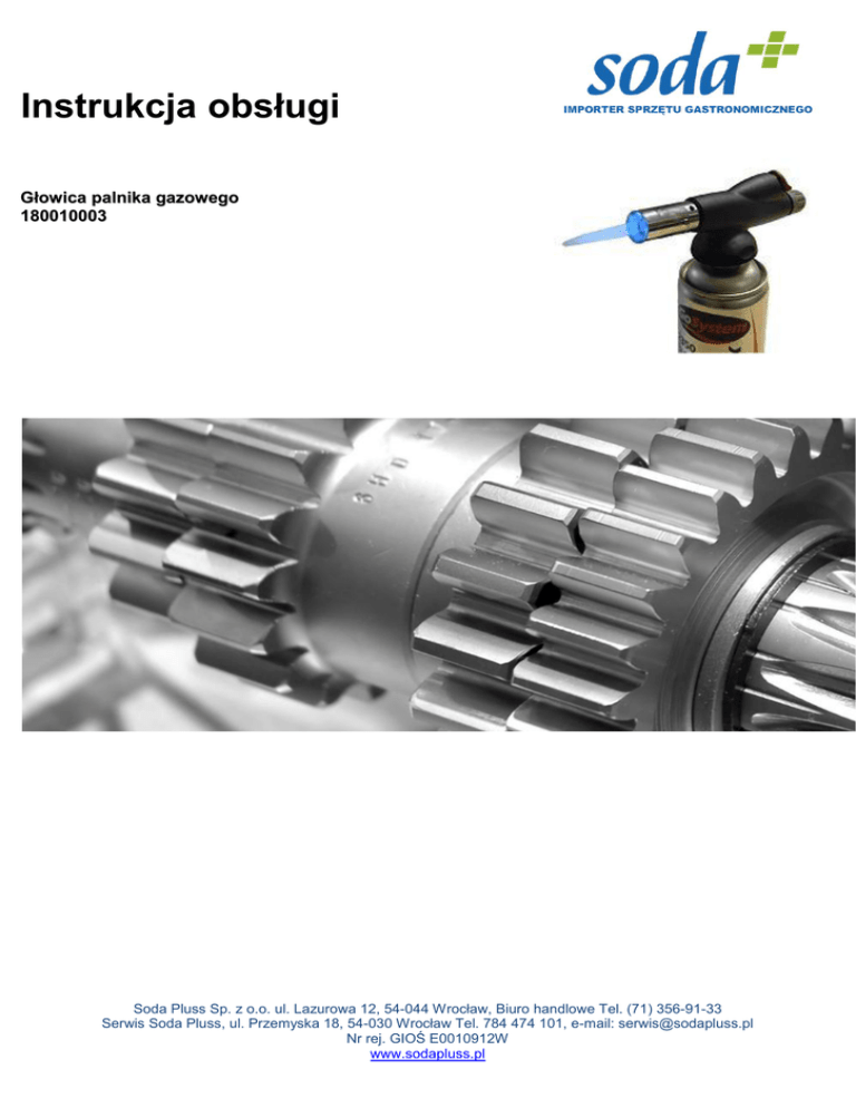 Instrukcja obsługi Głowica palnika gazowego 180010003 Soda Pluss Sp. z o.o. ul. Lazurowa 12, 54-044 Wrocław, Biuro handlowe Tel. (71) 356-91-33 Serwis Soda Pluss, ul. Przemyska 18, 54-030 Wrocław Tel. 784 474 101, e-mail: [email protected] Nr rej. GIOŚ E0010912W www.sodapluss.pl Instrukcja obsługi PRZED PIERWSZYM UŻYCIEM URZĄDZENIA NALEŻY DOKŁADNIE ZAPOZNAĆ SIĘ Z INSTRUKCJĄ OBSŁUGI. INSTUKCJĘ POWINNO SIĘ PRZECHOWYWAĆ W BEZPIECZNYM ORAZ W DOSTĘPNYM DLA KAŻDEGO UŻYTKOWNIKA MIEJSCU. WSKAZÓWKI BEZPIECZEŃSTWA ZABRANIA SIĘ zanurzania urządzenia w wodzie. Niektóre powierzchnie nagrzewają się podczas pracy – należy zachować ostrożność podczas korzystania z urządzenia. Urządzenie może być używane wyłącznie do celu, do którego zostało zaprojektowane Nieprawidłowa obsługa urządzenia i niewłaściwe użytkowanie może spowodować poważne uszkodzenia urządzenia lub zagrożenie życia Należy kontrolować funkcjonowanie urządzenia podczas użytkowania Należy chronić dysze palnika przed zabrudzeniami i upadkami, gdyż jest to najczęstsza przyczyna późniejszego nieprawidłowego funkcjonowania. Palnika nie wolno przechowywać w pobliżu otwartego ognia, ani bezpośrednio na słońcu. Temperatura pomieszczenia, w którym przechowywany jest palnik nie powinna przekraczać 40oC. Nie wolno dotykać wylotu palnika natychmiast po użyciu, kiedy jest jeszcze gorący. Butan jest gazem łatwopalnym, więc należy obchodzić się z nim z zachowaniem szczególnej ostrożności. Montowanie pojemnika gazu i korzystanie z palnika powinno odbywać się w dobrze wentylowanych pomieszczeniach. Należy się upewnić, że wokół palnika, lub płomienia jest dość wolnej przestrzeni aby nikomu nie wyrządzić krzywdy ani nie zniszczyć żadnego przedmiotu lub wywołać pożaru. W czasie instalowania zbiornika z gazem do palnika zabrania się palenia papierosów. Czynność tę należy wykonywać z dala od źródła ognia. Podczas zapalania i operowania palnikiem jego wylot nie może być skierowany w kierunku osób. Konieczne jest posługiwanie się urządzeniem z dużą ostrożnością, ponieważ płomień nie zawsze jest widoczny. Po zakończeniu pracy z palnikiem należy upewnić się, że dopływ gazu został całkowicie odcięty, a płomień wygaszony. Palnik zostawić do całkowitego wystudzenia w bezpiecznym miejscu. Głowica palnika powinna być zawsze wymontowana gdy palnik nie jest używany. Opakowanie należy przechowywać w miejscu niedostępnym dla dzieci. ZASTOSOWANIE: wykonywanie aplikacji piekarskich i cukierniczych karmelizacja cukru roztapianie sera na potrawach uzyskiwanie chrupkiej skórki potraw mięsnych zdejmowanie skórki z pomidorów lutowanie miedzianych rurek odmrażanie zamrożonych rur naprawa starych mebli usuwanie lakierów i farb rozpalanie kominków, grilli naprawa niewielkich przedmiotów i zabawek Soda Pluss Sp. z o.o. ul. Lazurowa 12, 54-044 Wrocław, Biuro handlowe Tel. (71) 356-91-33 Serwis Soda Pluss, ul. Przemyska 18, 54-030 Wrocław Tel. 784 474 101, e-mail: [email protected] Nr rej. GIOŚ E0010912W www.sodapluss.pl Instrukcja obsługi INSTRUKCJA OBSŁUGI Montaż I zapalanie palnika 1. Przed przykręceniem głowicy do butli należy się upewnić, że pokrętło zaworu gazu (3) jest mocno dokręcone (zgodnie z ruchem wskazówek zegara). 2. Głowicę palnika należy przykręcić do zbiornika z gazem, trzymając zbiornik zaworem do góry (4). Nie należy używać zbyt dużo siły do przykręcenia głowicy gdyż grozi to zerwaniem gwintu butli lub palnika bądź uszkodzeniem zaworu gazu. 3. Po zamontowaniu głowicy na butli należy kilkakrotnie wstrząsnąć pojemnikiem z gazem w celu rozgrzania paliwa. 4. Należy minimalnie przekręcić regulator dopływu gazu, o 2/3 obrotu w stronę przeciwną do ruchu wskazówek zegara. Gaz z sykiem zacznie wydostawać się z palnika. Należy wcisnąć przycisk zapłonu (2), co spowoduje zapalenie się płomienia. 5. Wielkość płomienia regulowana jest pokrętłem zaworu gazu. Rekomendowana wielkość płomienia waha się w granicach 1,20cm – 1,9cm. Dłuższy płomień będzie powodował stratę gazu. Będzie również niestabilny.. Używanie palnika w niskich temperaturach W niskich temperaturach płomień palnika będzie krótszy. Aby uzyskać większy płomień należy rozgrzać cylinder do temperatury pokojowej przed jego użyciem. Jest bardzo prawdopodobne, że płomień w niskich temperaturach będzie gasł, szczególnie gdy palnik i butla będą skierowane zaworem do dołu. Wyłączanie 1. Po zakończeniu pracy z palnikiem należy zakręcić pokrętło regulatora gazu aż do oporu i całkowitego zgaśnięcia płomienia. 2. Gdy palnik ostygnie, należy odkręcić głowicę w kierunku odwrotnym od kierunku ruchu wskazówek zegara. Palnik i butlę z gazem należy składować w miejscu niedostępnym dla dzieci, bezpiecznym, nie narażonym na wysokie temperatury. Rozmontowywanie, lub samodzielne próby naprawy palnika są niedozwolone! Soda Pluss Sp. z o.o. ul. Lazurowa 12, 54-044 Wrocław, Biuro handlowe Tel. (71) 356-91-33 Serwis Soda Pluss, ul. Przemyska 18, 54-030 Wrocław Tel. 784 474 101, e-mail: [email protected] Nr rej. GIOŚ E0010912W www.sodapluss.pl Instrukcja obsługi USUWANIE ZUŻYTYCH URZĄDZEŃ Zgodnie z ustawą o zużytym sprzęcie elektrycznym i elektronicznym (ZSEE) z dnia 29 lipca 2005 oraz ustawą o Utrzymaniu Czystości i Porządku w Gminach z dnia 13 września 1996r konsument : Zobowiązany jest oddawać zużyty sprzęt elektryczny i elektroniczny zbierającemu taki sprzęt. (art.35 ustawy ZSEE) Konsument nie może wyrzucać zużytego sprzętu łącznie z innymi odpadami. (art.36 ustawy ZSEE) Za pozostawienie tego typu sprzętu w miejscu do tego nie przeznaczonym (np. wyrzucenie do śmietnika, wystawienie przed blok czy porzucenie w lesie) grozi kara grzywny od 20 do 5000 zł. (art. 74 ustawy ZSEE) Od 1 lipca 2006 r. konsument ma prawo do nieodpłatnego oddania swojego