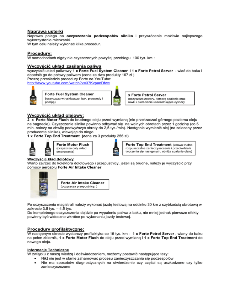 Naprawa usterki Naprawa polega na oczyszczeniu podzespołów silnika i przywrócenie możliwie najlepszego wykorzystania mieszanki. W tym celu należy wykonać kilka procedur. Procedury: W samochodach nigdy nie czyszczonych powyżej przebiegu 100 tys. km : Wyczyścić układ zasilania paliwa wyczyścić układ paliwowy 1 x Forte Fuel System Cleaner i 1 x Forte Petrol Server - wlać do baku i dopełnić go do połowy paliwem (cena za dwa produkty 167 zł ) Proszę prześledzić procedury Forte na YouTube: http://www.youtube.com/watch?v=37KvpanDfwc Forte Fuel System Cleaner (oczyszcza wtryskiwacze, bak, przewody i pompę) x Forte Petrol Server (oczyszcza zawory, komorę spalania oraz rowki i pierścienie uszczelniające cylindry Wyczyścić układ olejowy: 2 x Forte Motor Flush do brudnego oleju przed wymianą (nie przekraczać górnego poziomu oleju na bagnecie). Czyszczenie silnika powinno odbywać się na wolnych obrotach przez 1 godzinę (co 5 min. należy na chwilę podwyższyć obroty do 2,5 tys./min). Następnie wymienić olej (na zalecany przez producenta silnika), wlewając do niego 1 x Forte Top End Treatment (cena za 3 produkty 256 zł) Forte Motor Flush Forte Top End Treatment (usuwa trudno (oczyszcza cały układ smarowania) rozpuszczalne zanieczyszczenia i przeciwdziała tworzeniu się następnych, obniża spalanie oleju) Wyczyścić kład dolotowy Warto zajrzeć do kolektora dolotowego i przepustnicy, jeżeli są brudne, należy je wyczyścić przy pomocy aerozolu Forte Air Intake Cleaner Forte Air Intake Cleaner (oczyszcza przepustnicę, ) Po oczyszczeniu magistrali należy wykonać jazdę testową na odcinku 30 km z szybkością obrotową w zakresie 3,5 tys. – 4,5 tys. Do kompletnego oczyszczenia dojdzie po wypaleniu paliwa z baku, nie mniej jednak pierwsze efekty powinny być widoczne wkrótce po wykonaniu jazdy testowej. Procedury profilaktyczne: W następnym okresie wystarczy profilaktyka co 15 tys. km - 1 x Forte Petrol Server , wlany do baku na pełen zbiornik, 1 x Forte Motor Flush do oleju przed wymianą i 1 x Forte Top End Treatment do nowego oleju. Informacje Techniczne W związku z naszą wiedzą i doświadczeniem, możemy postawić następujące tezy: Nikt nie jest w stanie zahamować procesu zanieczyszczania się podzespołów Nie ma sposobów diagnostycznych na stwierdzenie czy części są uszkodzone czy tylko zanieczyszczone 70% wszystkich problemów z pracą silnika jest związane bezpośrednio z zanieczyszczonymi podzespołami Wymiana zużytych części, bez wcześniejszego oczyszczenia silnika(przyczyna usterki), jest najdroższą formą naprawy. Ponadto taki sposób nie wykorzystuje szansy na to, że części są tylko zanieczyszczone. W powszechnej praktyce warsztatowej wymienia się wiele części zupełnie niepotrzebnie ! Proces zanieczyszczania się silnika benzynowego Wszystkie problemy z silnikiem benzynowym rozpoczynają się od układu paliwowego. Zanieczyszczone wtryskiwacze, wtryskują paliwo (w składzie paliwa jest do 10% bioetanolu)w nieodpowiedni sposób, które łącząc się z powietrzem tworzy mieszankę paliwowo - powietrzną o złym składzie Mieszanka spala się w komorze w ograniczonym stopniu, co tworzy nagar Nagar osadza się na zaworach, w komorze spalania, w rowkach i pierścieniach uszczelniających tłoki To powoduje stopniowe obniżanie się kompresji (zły start, mniejsza moc) i zanieczyszczanie układu olejowego. Olej gęstnieje, zanieczyszczenia blokują części w środku Brudne opary olejowe przedostają się do kolektora ssącego (system wentylacji skrzyni korbowej), blokując go i zanieczyszczając przepustnicę, co często skutkuje złą pracą na wolnych obrotach. Powietrze dochodzi do komory spalania w niewłaściwych dawkach oraz w silnikach DI (wtrysk bezpośredni) bez niezbędnego zawirowania. To powoduje w tych silnikach częste usterki, taki jak: wypadanie zapłonów, przerwy w zapewnieniu całej mocy, nierówne obroty na zanieczyszczone wtryskiwacze i kolektor ssący, to dwa główne powody tworzenia się mieszanki, o złym składzie. W wyniku jej spalania spaliny posiadają nadmierne ilości zanieczyszczeń. Zanieczyszczone sondy lambda w układzie wydechowym, wysyłają złe sygnały do systemu sterowania, co w konsekwencji doprowadza do złego składu mieszanki i niepełnego jej spalania i zanieczyszczenia zaworów W spalinach wydalane jest coraz więcej zanieczyszczeń, co doprowadza do złej pracy a na końcu zablokowania zaworu EGR (zaworu systemu recyrkulacji spalin) W związku z powyższym niezbędne jest oczyszczenie podzespołów, zanim zdecydujemy się na ich wymianę. Najlepsze efekty osiąga się gdy wykonuje się pełne czyszczenie silnika, które składa się z kilku procedur (1,2,3). Po oczyszczeniu magistrali należy wykonać jazdę testową na odcinku 30 km z szybkością obrotową w zakresie 3,5 tys. – 4,5 tys. Do kompletnego oczyszczenia dojdzie po wypaleniu paliwa z baku, nie mniej jednak pierwsze efekty powinny być widoczne wkrótce po wykonaniu jazdy testowej. Korzyści: Znaczny wzrost mocy i wydajności silnika (szczególnie widoczne na wyższych biegach) Silnik bardzo szybko wkręca się w obroty Dobrze działające czujniki odbierające sygnały z całego silnika O wiele cichsza praca Mniejsze wydatki na paliwo (auto mniej spala) Kompletna czystość w turbosprężarce przedłuża jej sprawne działanie Oczyszczony katalizator i sondy lambda, starcza na dużo dłuższy czas. Nasmarowana instalacja wtrysku jest trwała i odporna na korozję. Rozumiem, że idea czyszczenia części zamiast ich wymiany jest niekonwencjonalnym rozwiązaniem, proszę jednak nam zaufać. Preparaty Forte na rynkach zachodnich znane są dobrze. Myślę, że w interesie każdego rozsądnego kierowcy lub mechanika jest otwarcie się na nowe technologie, które są szybsze, skuteczniejsze, bardziej ekonomiczne i oszczędzające środowisko. Dla szerszego rozeznania warto też zasięgnąć opinii tych, którz