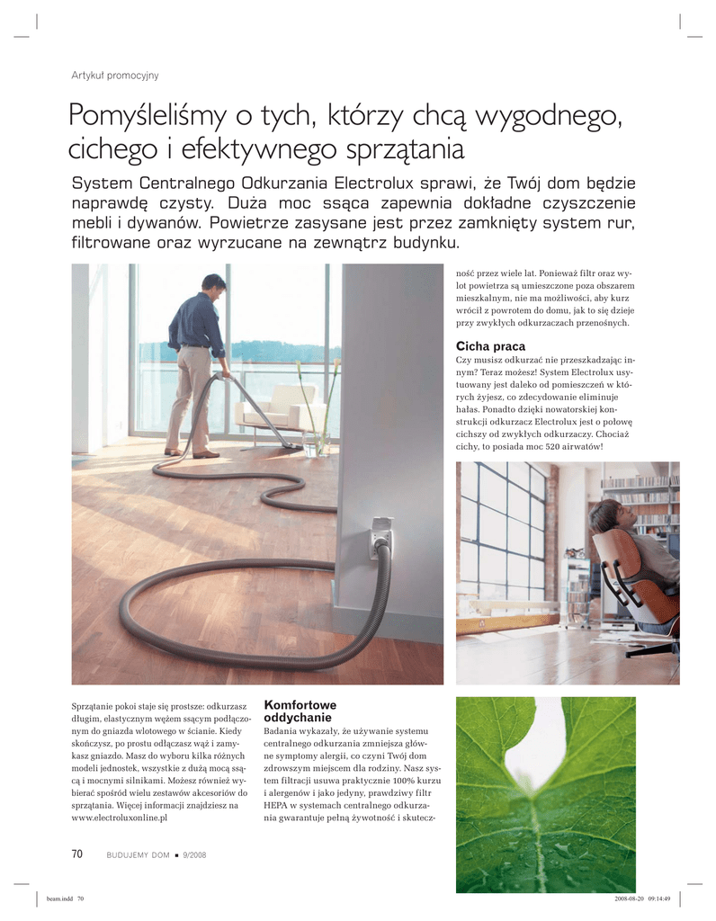 Artykuï promocyjny PomyĂleliĂmy o tych, którzy chcÈ wygodnego, cichego i efektywnego sprzÈtania System Centralnego Odkurzania Electrolux sprawi, ĝe Twój dom bÚdzie naprawdÚ czysty. Duĝa moc ssÈca zapewnia dokïadne czyszczenie mebli i dywanów. Powietrze zasysane jest przez zamkniÚty system rur, filtrowane oraz wyrzucane na zewnÈtrz budynku. noĂÊ przez wiele lat. Poniewaĝ filtr oraz wylot powietrza sÈ umieszczone poza obszarem mieszkalnym, nie ma moĝliwoĂci, aby kurz wróciï z powrotem do domu, jak to siÚ dzieje przy zwykïych odkurzaczach przenoĂnych. Cicha praca Czy musisz odkurzaÊ nie przeszkadzajÈc innym? Teraz moĝesz! System Electrolux usytuowany jest daleko od pomieszczeñ w których ĝyjesz, co zdecydowanie eliminuje haïas. Ponadto dziÚki nowatorskiej konstrukcji odkurzacz Electrolux jest o poïowÚ cichszy od zwykïych odkurzaczy. Chociaĝ cichy, to posiada moc 520 airwatów! SprzÈtanie pokoi staje siÚ prostsze: odkurzasz dïugim, elastycznym wÚĝem ssÈcym podïÈczonym do gniazda wlotowego w Ăcianie. Kiedy skoñczysz, po prostu odïÈczasz wÈĝ i zamykasz gniazdo. Masz do wyboru kilka róĝnych modeli jednostek, wszystkie z duĝÈ mocÈ ssÈcÈ i mocnymi silnikami. Moĝesz równieĝ wybieraÊ spoĂród wielu zestawów akcesoriów do sprzÈtania. WiÚcej informacji znajdziesz na www.electroluxonline.pl 70 beam.indd 70 BUDUJEMY DOM Komfortowe oddychanie Badania wykazaïy, ĝe uĝywanie systemu centralnego odkurzania zmniejsza gïówne symptomy alergii, co czyni Twój dom zdrowszym miejscem dla rodziny. Nasz system filtracji usuwa praktycznie 100% kurzu i alergenów i jako jedyny, prawdziwy filtr HEPA w systemach centralnego odkurzania gwarantuje peïnÈ ĝywotnoĂÊ i skutecz- 9/2008 2008-08-20 09:14:49