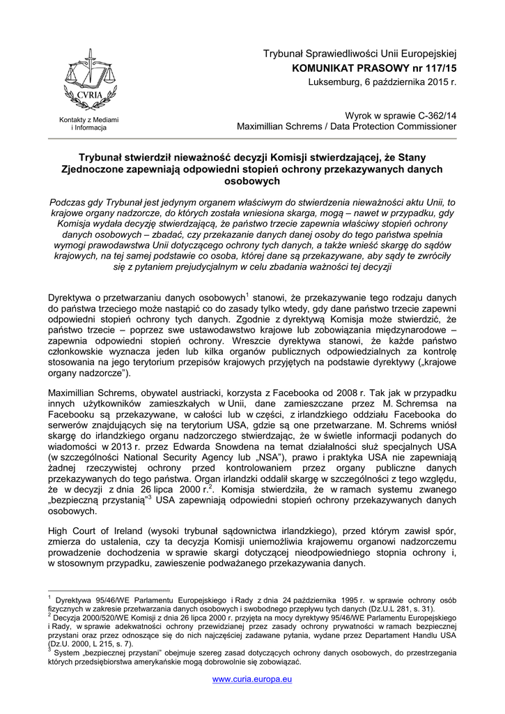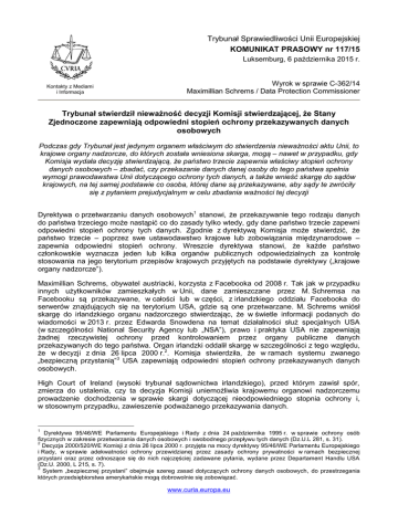 Trybunał Sprawiedliwości Unii Europejskiej KOMUNIKAT PRASOWY nr 117/15 Luksemburg, 6 października 2015 r. Kontakty z Mediami i Informacja Wyrok w sprawie C-362/14 Maximillian Schrems / Data Protection Commissioner Trybunał stwierdził nieważność decyzji Komisji stwierdzającej, że Stany Zjednoczone zapewniają odpowiedni stopień ochrony przekazywanych danych osobowych Podczas gdy Trybunał jest jedynym organem właściwym do stwierdzenia nieważności aktu Unii, to krajowe organy nadzorcze, do których została wniesiona skarga, mogą – nawet w przypadku, gdy Komisja wydała decyzję stwierdzającą, że państwo trzecie zapewnia właściwy stopień ochrony danych osobowych – zbadać, czy przekazanie danych danej osoby do tego państwa spełnia wymogi prawodawstwa Unii dotyczącego ochrony tych danych, a także wnieść skargę do sądów krajowych, na tej samej podstawie co osoba, której dane są przekazywane, aby sądy te zwróciły się z pytaniem prejudycjalnym w celu zbadania ważności tej decyzji Dyrektywa o przetwarzaniu danych osobowych1 stanowi, że przekazywanie tego rodzaju danych do państwa trzeciego może nastąpić co do zasady tylko wtedy, gdy dane państwo trzecie zapewni odpowiedni stopień ochrony tych danych. Zgodnie z dyrektywą Komisja może stwierdzić, że państwo trzecie – poprzez swe ustawodawstwo krajowe lub zobowiązania międzynarodowe – zapewnia odpowiedni stopień ochrony. Wreszcie dyrektywa stanowi, że każde państwo członkowskie wyznacza jeden lub kilka organów publicznych odpowiedzialnych za kontrolę stosowania na jego terytorium przepisów krajowych przyjętych na podstawie dyrektywy („krajowe organy nadzorcze”). Maximillian Schrems, obywatel austriacki, korzysta z Facebooka od 2008 r. Tak jak w przypadku innych użytkowników zamieszkałych w Unii, dane zamieszczane przez M. Schremsa na Facebooku są przekazywane, w całości lub w części, z irlandzkiego oddziału Facebooka do serwerów znajdujących się na terytorium USA, gdzie są one przetwarzane. M. Schrems wniósł skargę do irlandzkiego organu nadzorczego stwierdzając, że w świetle informacji podanych do wiadomości w 2013 r. przez Edwarda Snowdena na temat działalności służ specjalnych USA (w szczególności National Security Agency lub „NSA”), prawo i praktyka USA nie zapewniają żadnej rzeczywistej ochrony przed kontrolowaniem przez organy publiczne danych przekazywanych do tego państwa. Organ irlandzki oddalił skargę w szczególności z tego względu, że w decyzji z dnia 26 lipca 2000 r.2. Komisja stwierdziła, że w ramach systemu zwanego „bezpieczną przystanią”3 USA zapewniają odpowiedni stopień ochrony przekazywanych danych osobowych. High Court of Ireland (wysoki trybunał sądownictwa irlandzkiego), przed którym zawisł spór, zmierza do ustalenia, czy ta decyzja Komisji uniemożliwia krajowemu organowi nadzorczemu prowadzenie dochodzenia w sprawie skargi dotyczącej nieodpowiedniego stopnia ochrony i, w stosownym przypadku, zawieszenie podważanego przekazywania danych. 1 Dyrektywa 95/46/WE Parlamentu Europejskiego i Rady z dnia 24 października 1995 r. w sprawie ochrony osób fizycznych w zakresie przetwarzania danych osobowych i swobodnego przepływu tych danych (Dz.U.L 281, s. 31). 2 Decyzja 2000/520/WE Komisji z dnia 26 lipca 2000 r. przyjęta na mocy dyrektywy 95/46/WE Parlamentu Europejskiego i Rady, w sprawie adekwatności ochrony przewidzianej przez zasady ochrony prywatności w ramach bezpiecznej przystani oraz przez odnoszące się do nich najczęściej zadawane pytania, wydane przez Departament Handlu USA (Dz.U. 2000, L 215, s. 7). 3 System „bezpiecznej przystani” obejmuje szereg zasad dotyczących ochrony danych osobowych, do przestrzegania których przedsiębiorstwa amerykańskie mogą dobrowolnie się zobowiązać. www.curia.europa.eu W ogłoszonym dzisiaj wyroku Trybunał orzekł, że istnienie decyzji Komisji stwierdzającej, że państwo trzecie zapewnia odpowiedni stopień ochrony przekazywanych danych osobowych, nie może zniweczyć, ani nawet ograniczyć, uprawnień, jakie przysługują krajowym organom nadzorczym na mocy Karty praw podstawowych Unii Europejskiej i dyrektywy. Trybunał podkreślił w tym zakresie prawo do ochrony danych osobowych gwarantowane w Karcie, a także misję, jaką pełnią krajowe organy nadzorcze na mocy wspomnianej Karty. Trybunał stwierdził najpierw, że żaden przepis dyrektywy nie uniemożliwia krajowym organom nadzorczym kontrolowania przekazywania danych osobowych do państw trzecich, w odniesieniu do których Komisja wydała decyzję. Tak więc, nawet w przypadku gdy istnieje decyzja Komisji, krajowe organy nadzorcze, do których została wniesiona skarga, muszą mieć możliwość zbadania w sposób całkowicie niezależny, czy przekazywanie danych dotyczących danej osoby do państwa trzeciego spełnia wymogi ustanowione w dyrektywie. Niemniej jednak Trybunał przypomniał, że jest jedynym organem właściwym do stwierdzenia nieważności aktu Unii, takiego jak decyzja Komisji. W konsekwencji, w przypadku gdy organ krajowy lub osoba, która wniosła skargę do organu krajowego, twierdzi, że decyzja Komisji jest nieważna, organ ten lub ta osoba muszą mieć możliwość zwrócenia się do sądów krajowych, aby sądy te, jeśli także mają wątpliwości co do ważności decyzji Komisji, mogły zwrócić się do Trybunału Sprawiedliwości z pytaniem prejudycjalnym. Tak więc ostatecznie to Trybunał orzeka, czy decyzja Komisji jest ważna, czy też nieważna. Trybunał zbadał zatem ważność decyzji Komisji z dnia 26 lipca 2000 r. W tym zakresie przypomniał, że Komisja była zobowiązana do stwierdzenia, że USA zapewniają rzeczywiście, poprzez swe ustawodawstwo krajowe lub zobowiązania międzynarodowe, stopień ochrony praw podstawowych zasadniczo równoważny do stopnia ochrony gwarantowanego w ramach Unii na mocy dyrektywy intepretowanej w świetle Karty