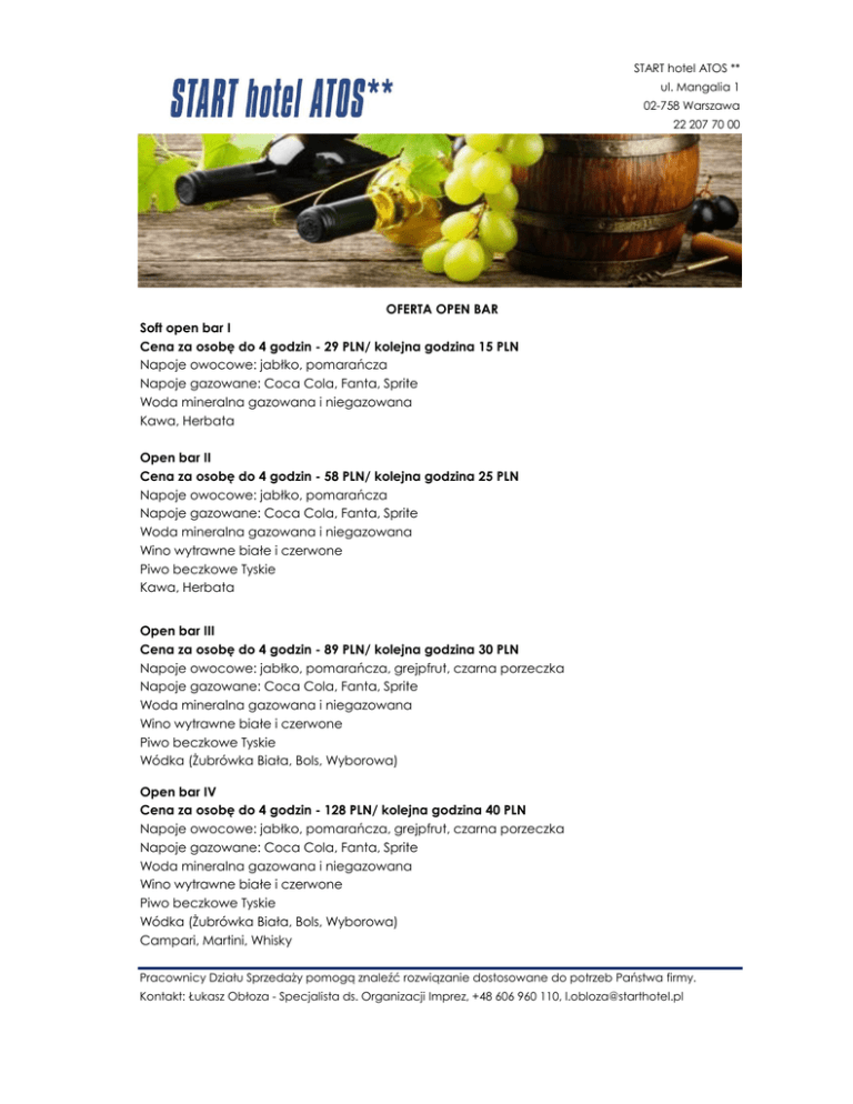 START hotel ATOS ** ul. Mangalia 1 02-758 Warszawa 22 207 70 00 OFERTA OPEN BAR Soft open bar I Cena za osobę do 4 godzin - 29 PLN/ kolejna godzina 15 PLN Napoje owocowe: jabłko, pomarańcza Napoje gazowane: Coca Cola, Fanta, Sprite Woda mineralna gazowana i niegazowana Kawa, Herbata Open bar II Cena za osobę do 4 godzin - 58 PLN/ kolejna godzina 25 PLN Napoje owocowe: jabłko, pomarańcza Napoje gazowane: Coca Cola, Fanta, Sprite Woda mineralna gazowana i niegazowana Wino wytrawne białe i czerwone Piwo beczkowe Tyskie Kawa, Herbata Open bar III Cena za osobę do 4 godzin - 89 PLN/ kolejna godzina 30 PLN Napoje owocowe: jabłko, pomarańcza, grejpfrut, czarna porzeczka Napoje gazowane: Coca Cola, Fanta, Sprite Woda mineralna gazowana i niegazowana Wino wytrawne białe i czerwone Piwo beczkowe Tyskie Wódka (Żubrówka Biała, Bols, Wyborowa) Open bar IV Cena za osobę do 4 godzin - 128 PLN/ kolejna godzina 40 PLN Napoje owocowe: jabłko, pomarańcza, grejpfrut, czarna porzeczka Napoje gazowane: Coca Cola, Fanta, Sprite Woda mineralna gazowana i niegazowana Wino wytrawne białe i czerwone Piwo beczkowe Tyskie Wódka (Żubrówka Biała, Bols, Wyborowa) Campari, Martini, Whisky Pracownicy Działu Sprzedaży pomogą znaleźć rozwiązanie dostosowane do potrzeb Państwa firmy. Kontakt: Łukasz Obłoza - Specjalista ds. Organizacji Imprez, +48 606 960 110, [email protected]