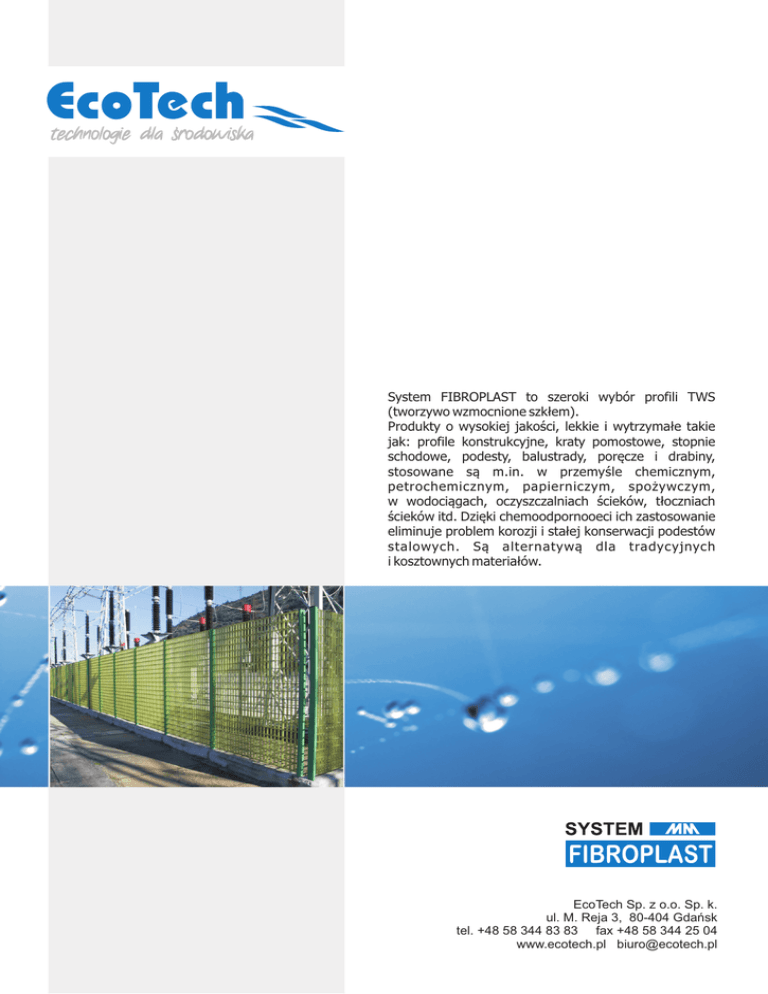 System FIBROPLAST to szeroki wybór profili TWS (tworzywo wzmocnione szk³em). Produkty o wysokiej jakoœci, lekkie i wytrzyma³e takie jak: profile konstrukcyjne, kraty pomostowe, stopnie schodowe, podesty, balustrady, porêcze i drabiny, stosowane s¹ m.in. w przemyœle chemicznym, petrochemicznym, papierniczym, spo¿ywczym, w wodoci¹gach, oczyszczalniach œcieków, t³oczniach œcieków itd. Dziêki chemoodpornooeci ich zastosowanie eliminuje problem korozji i sta³ej konserwacji podestów stalowych. S¹ alternatyw¹ dla tradycyjnych i kosztownych materia³ów. EcoTech Sp. z o.o. Sp. k. ul. M. Reja 3, 80-404 Gdañsk tel. +48 58 344 83 83 fax +48 58 344 25 04 www.ecotech.pl [email protected] 4. MATERIA£Y 4.1 OGRODZENIA Nasze ogrodzenia budowane s¹ z krat i prêtów typu SCH30/28 lub SCH60/28 (na ¿yczenie moga byæ u¿yte inne typy krat). Odleg³oœæ pomiêdzy prêtami zmienia siê w zale¿noœci od rodzaju u¿ytych krat. Prêty s¹ mocowane bezpoœrednio do betonu lub do stali nierdzewnej. Prêty Prostok¹tne profile typu “R8525” wykonywane s¹ w procesie pultruzji z uzyciem poliestrowych w³ókien izoftalowych i wzmocnionych w³ókien szklanych. Sekcja prostok¹tna: 85x25mm, gruboœæ: 3mm Kraty Kraty TWS wykonywane s¹ w technologii RTM przy u¿yciu izoftalowych w³ókien poliestrowych wzmocnionych w³óknem szklanym, typ SCH30/28 lub SCH60/28. 4.2 OPIS TECHNICZNY PROFILI PROFIL OPIS WYMIARY mm D£UGOŒÆ m MASA Kg/m KOLOR Prêt 58x25x3 6 0.805 szary Prêt standardowy 85x25x3 6 1.168 Szary/ zielony Prêt Kwadratowy 50x50x5 6 1.53 ¯ó³ty/szary WYMIARY mm MATERIA£ MASA Kg/m KOLOR 4.3 OPIS TECHNICZNY ZACISKÓW PROFIL OPIS pionowy prêt podstawa PQ5050 100x100x250 S.S. AISI 304 0.805 * pionowy prêt podstawa PR8525 100X100X250 S.S. AISI 304 1.168 * k¹towy pionowy prêt z podstaw¹ PR8525 Square 100x150x250 S.S. AISI 304 1.53 * Akcesoria - œruby M6 x 55 samoblokuj¹ce siê nakrêtki M6 EcoTech Sp. z o.o. Sp. k. ul. M. Reja 3, 80-404 Gdañsk tel. +48 58 344 83 83 fax +48 58 344 25 04 www.ecotech.pl [email protected] 6. INSTRUKCJE £¥CZENIA 6.1 MOCOWANIE OGRODZENIA O Dostarczamy ogrodzenia ró¿nej wysokoœci, kolorze i gêstoœci siatki (zobacz opis techniczny). Prêt mog¹ byæ zakotwiczane w podstawie bezpoœrednio w betonie lub przy uzyciu pionowych wsporników (Fig. 1 i 2), górne koñce zamykane s¹ pokrywkami (Fig. 3). Krata jest mocowane do prêtów za pomoc¹ œrub i samoblokuj¹cych siê sworzni lub nakrêtek blokuj¹cych ze stali nierdzewnej AISI 316 (Fig. 4). O Fig. 1 Mocowanie w betonie Fig. 2 Zakotwiczanie pionowych wsporników w stali nierdzewnej WKRÊT ŒRUBA Fig. 3 Pokrywki Fig. 4 EcoTech Sp. z o.o. Sp. k. ul. M. Reja 3, 80-404 Gdañsk tel. +48 58 344 83 83 fax +48 58 344 25 04 www.ecotech.pl [email protected]