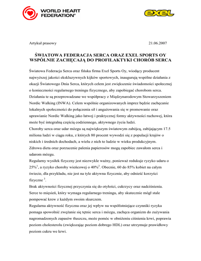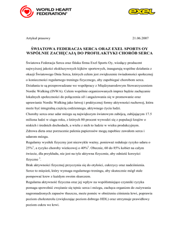 Artykuł prasowy 21.06.2007 ŚWIATOWA FEDERACJA SERCA ORAZ EXEL SPORTS OY WSPÓLNIE ZACHĘCAJĄ DO PROFILAKTYKI CHORÓB SERCA Światowa Federacja Serca oraz fińska firma Exel Sports Oy, wiodący producent najwyŜszej jakości ekskluzywnych kijków sportowych, inaugurują wspólne działania z okazji Światowego Dnia Serca, których celem jest zwiększenie świadomości społecznej o konieczności regularnego treningu fizycznego, aby zapobiegać chorobom serca. Działania te są przeprowadzane we współpracy z Międzynarodowym Stowarzyszeniem Nordic Walking (INWA). Celem wspólnie organizowanych imprez będzie zachęcanie lokalnych społeczności do połączenia sił i angaŜowania się w promowanie oraz uprawianie Nordic Walking jako łatwej i praktycznej formy aktywności ruchowej, która moŜe być integralną częścią codziennego, aktywnego Ŝycia ludzi. Choroby serca oraz udar mózgu są największym światowym zabójcą, zabijającym 17.5 miliona ludzi w ciągu roku, z których 80 procent wywodzi się z populacji krajów o niskich i średnich dochodach, a wielu z nich to ludzie w wieku produkcyjnym. Zdrowa dieta oraz porzucenie palenia papierosów mogą zapobiec zawałom serca i udarom mózgu. Regularny wysiłek fizyczny jest niezwykle waŜny, poniewaŜ redukuje ryzyko udaru o 25%1, a ryzyko choroby wieńcowej o 40%2. Obecnie, 60 do 85% kobiet na całym świecie, dla przykładu, nie jest na tyle aktywna fizycznie, aby odnieść korzyści fizyczne 3. Brak aktywności fizycznej przyczynia się do otyłości, cukrzycy oraz nadciśnienia. Serce to mięsień, który wymaga regularnego treningu, aby skutecznie mógł stale pompować krew z kaŜdym swoim skurczem. Regularna aktywność fizyczna oraz jej wpływ na współistniejące czynniki ryzyka pomaga spowolnić zwęŜanie się tętnic serca i mózgu, zachęca organizm do zuŜywania nagromadzonych zapasów tłuszczu, moŜe pomóc w obniŜeniu ciśnienia krwi, poprawia poziom cholesterolu (zwiększając poziom dobrego HDL) oraz utrzymuje prawidłowy poziom cukru we krwi. Nordic Walking był początkowo stosowany jako letnia metoda treningowa narciarzy biegowych w Finlandii. Następnie został przekształcony w aktywność fizyczną ze specyficzną techniką marszu i wykorzystaniem sprzętu treningowego we współpracy z fińskim producentem Exel Sports Oy, naukowcami ze świata sportu i medycyny, oraz innymi profesjonalistami z kręgów fitness. Nordic Walking jest efektywniejszym sposobem normalnego chodzenia dzięki wykorzystaniu specjalnie zaprojektowanych kijkow, aby zaangaŜować górną połowę ciała i tym samym stworzyć idealny trening całego organizmu. Jest to naturalna, bezpieczna i skuteczna forma aktywności fizycznej, odpowiednia dla wszystkich. Nordic Walking zwiększa tętno od 5 do 17 uderzeń/min ( podczas normalnego marszu, tętno wynosi 130 uderzeń /min, a w Nordic Walking,147 uderzeń/min, wzrost o 13%), a konsumpcja energii wzrasta o średnio 20% w porównaniu ze zwykłym marszem bez kijków1. Nordic Walking był zapoczątkowany w Finlandii w 1997 roku. Jego popularność szybko wzrosła i jest obecnie jedną z najszybciej rozwijających się aktywności fitness na świeŜym powietrzu. Światowy Dzień Serca, teraz juŜ ósmy rok z rzędu, jest przeprowadzany przez organizacje Światowej Federacji Serca w ponad 100 krajach. Tegoroczny Światowy Dzień Serca, odbywający się 30 września pod nazwą „Zjednoczmy siły w walce o Zdrowe Serce” zachęca ludzi do wspólnych działań na rzecz tworzenia społeczności zdrowych serc. Te społeczności - wywodzące się z rodzin, szkół, grup społecznych, kręgów zawodowych i religijnych – mogą zachęcać do tworzenia się środowiska wolnego od dymu tytoniowego, dokonywania prozdrowotnych wyborów w zakresie aktywności fizycznej i odŜywiania. NiezaleŜnie od imprez Nordic Walking, inne działania w ramach Światowego Dnia Serca obejmą: badania lekarskie, zorganizowane spacery, biegi, seminaria fitness, przemówienia publiczne, pokazy i występy sceniczne, fora naukowe, wystawy, koncerty, karnawały i turnieje sportowe. Odwiedźcie stronę www.worldheartday.com O Exel Sports Oy Exel Sports Oy, usytuowana w Finlandii, jest jednym z wiodących producentów kompozytowych ekskluzywnych takich produktów jak: kijki do Nordic Walking, narciarstwa biegowego, alpejskiego, trekkingu, oraz akcesoriów sportowych Exel Sports jest filią Grupy Exel Spółka Akcyjna, która zatrudnia 600 pracowników w wielu krajach i posiada obrót 112,4 miliona Euro (2006). W celu uzyskania dalszych informacji proszę odwiedzić stronę: www.exelsports.net O Międzynarodowym Stowarzyszeniu Nordic Walking (INWA) Międzynarodowe Stowarzyszenie Nordic Walking (INWA) powstało w Finlandii w 2000 roku. INWA jest jedyną międzynarodową organizacją autoryzowaną przez twórców Nordic Walking do promowania, rozwijania, i ochrony cech charakterystycznych oraz zasad Nordic Walking na całym świecie. We współpracy z profesjonalistami z dziedziny sportu, medycyny i fitness, INWA rozwija innowacyjne metody treningowe oraz programy szkoleniowe dotyczące Nordic Walking. INWA takŜe współpracuje z organizacjami naukowymi i medycznymi, oferującymi zalecenia treningowe w oparciu o badania naukowe. Pod koniec 2006 roku, INWA ma 17 oficjalnych organizacji członkowskich, a instruktorzy INWA zostali certyfikowani w prawie 40 krajach na świecie. W celu uzyskania dalszych informacji proszę odwiedzić stronę: www.inwa.nordicwalking.com O Światowej Federacji Serca Światowa Organizacja Serca jest organizacją pozarządową mieszczącą się w Genewie, w Szwajcarii, która poświęca się zapobieganiu i kontroli chorób serca oraz udarów, szczególnie skupiając swoją uwagę na krajach o niskim i przeciętnym dochodzie. Składa się ona ze 195 organizacji członkowskich obejmujących fundacje kardiologiczne, na rzecz zdrowego serca, z ponad 100 krajów regionu Azji I Pacyfiku, Europy, Daleki