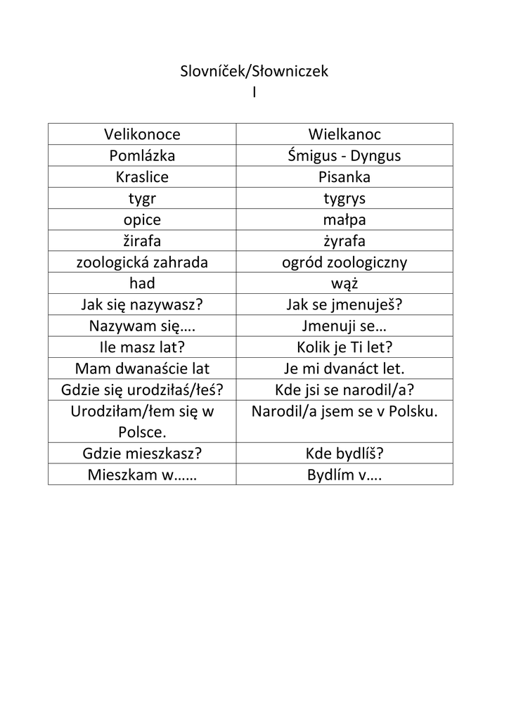 Slovníček/Słowniczek I Velikonoce Pomlázka Kraslice tygr opice žirafa zoologická zahrada had Jak się nazywasz? Nazywam się…. Ile masz lat? Mam dwanaście lat Gdzie się urodziłaś/łeś? Urodziłam/łem się w Polsce. Gdzie mieszkasz? Mieszkam w…… Wielkanoc Śmigus - Dyngus Pisanka tygrys małpa żyrafa ogród zoologiczny wąż Jak se jmenuješ? Jmenuji se… Kolik je Ti let? Je mi dvanáct let. Kde jsi se narodil/a? Narodil/a jsem se v Polsku. Kde bydlíš? Bydlím v…. Slovníček/Słowniczek II uzeniny čokoláda bombóny vejce šelmy dravci procházka plazi obojživelníci savci pozdrawiam Cię Która godzina? Jest wpół do piątej. Kiedy się spotkamy? Kiedy się znów zobaczymy? Lubię Cię. wędliny czekolada cukierki jajka ssaki drapieżne ptaki drapieżne spacer gady płazy ssaki zdravím Tě Kolik je hodin? Je půl páté. Kdy se sejdeme? Kdy se zase uvidíme? Mám Tě rád. Slovníček/Słowniczek III svátky vyučovací den prázdniny slon hroch dětské hřiště houpačka skluzavka zvíře Skąd przyjechałaś/łeś? Przyjechałam/łem z Polski. Co lubisz robić? Lubię malować. Lubię czytać. Lubię grać w piłkę. Lubię leniuchować. święta dzień nauki wakacje, ferie słoń hipopotam plac zabaw huśtawka ślizgawka zwierzę Odkud jsi přijel/a? Přijel/a jsem z Polska. Co rád/a děláš? Rád/a maluji. Rád/a čtu. Rád/a hraju fotbal. Rád/a lenoším. Slovníček/Słowniczek IV houska čaj džus kostel hostina ptáci orel žirafa krysa, potkan krajta hroznýš Zobaczymy się jutro. Podobasz mi się. Zapraszam Cię na lody. Chętnie Cię odwiedzę. Miło było Cię poznać. bułka herbata sok kościół uczta ptaki orzeł żyrafa szczur pyton boa (dusiciel) Uvidíme se zítra. Líbíš se mi. Zvu Tě na zmrzlinu. Rád/a Tě navštívím. Rád/a jsem Tě poznal/a.