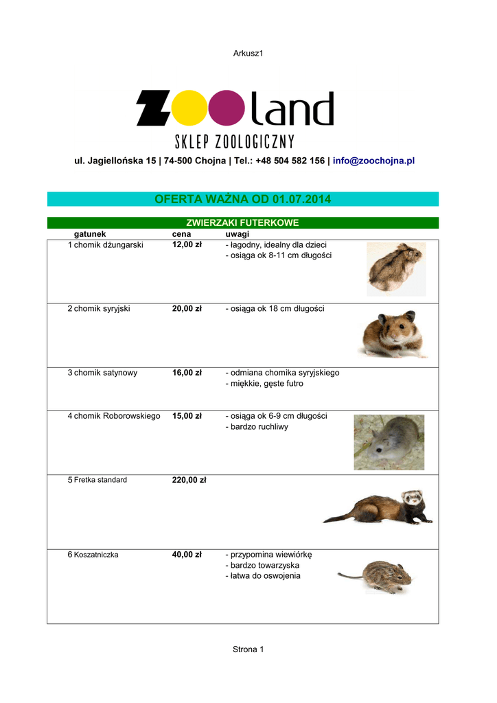 Arkusz1 OFERTA WAŻNA OD 01.07.2014 ZWIERZAKI FUTERKOWE gatunek 1 chomik dżungarski cena 12,00 zł uwagi - łagodny, idealny dla dzieci - osiąga ok 8-11 cm długości 2 chomik syryjski 20,00 zł - osiąga ok 18 cm długości 3 chomik satynowy 16,00 zł - odmiana chomika syryjskiego - miękkie, gęste futro 4 chomik Roborowskiego 15,00 zł - osiąga ok 6-9 cm długości - bardzo ruchliwy 5 Fretka standard 220,00 zł 6 Koszatniczka 40,00 zł - przypomina wiewiórkę - bardzo towarzyska - łatwa do oswojenia Strona 1 Arkusz1 7 Królik baranek 80,00 zł 8 Królik gładki 70,00 zł 9 Królik angorka 75,00 zł 10 Mastomysz 8,00 zł 11 Mysz biała 8,00 zł 12 Myszoskoczek 26,00 zł - żyje ok 5 lat 13 Suseł richardsona 500,00 zł 14 Szczur 12,00 zł 15 Szynszyla standard 120,00 zł Strona 2 Arkusz1 16 Świnka gładka 50,00 zł 17 Świnka skinny 200,00 zł 18 Świnka sheltie 65,00 zł Nie znalazłeś zwierzaka który Cię interesuje? Zapytaj nas o dostępność! Strona 3