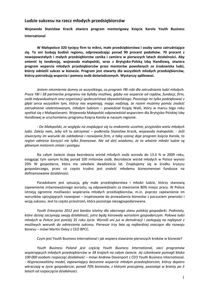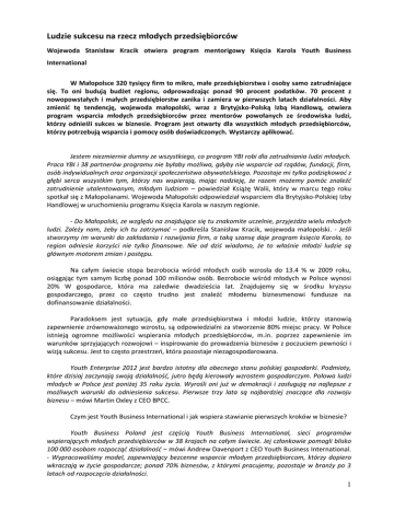 Ludzie sukcesu na rzecz młodych przedsiębiorców Wojewoda Stanisław Kracik otwiera program mentorigowy Księcia Karola Youth Business International W Małopolsce 320 tysięcy firm to mikro, małe przedsiębiorstwa i osoby samo zatrudniające się. To oni budują budżet regionu, odprowadzając ponad 90 procent podatków. 70 procent z nowopowstałych i małych przedsiębiorstw zanika i zamiera w pierwszych latach działalności. Aby zmienid tę tendencję, wojewoda małopolski, wraz z Brytyjsko-Polską Izbą Handlową, otwiera program wsparcia młodych przedsiębiorców przez mentorów powołanych ze środowiska ludzi, którzy odnieśli sukces w biznesie. Program jest otwarty dla wszystkich młodych przedsiębiorców, którzy potrzebują wsparcia i pomocy osób doświadczonych. Wystarczy aplikowad. Jestem niezmiernie dumny ze wszystkiego, co program YBI robi dla zatrudniania ludzi młodych. Praca YBI i 38 partnerów programu nie byłaby możliwa, gdyby nie wsparcie od rządów, fundacji, firm, osób indywidualnych oraz organizacji społeczeostwa obywatelskiego. Pozostaje mi tylko podziękowad z głębi serca wszystkim tym, którzy nas wspierają, mając nadzieję, że razem możemy pomóc znaleźd zatrudnienie utalentowanym, młodym ludziom – powiedział Książę Walii, który w marcu tego roku spotkał się z Małopolanami. Wojewoda Małopolski odpowiedział wsparciem dla Brytyjsko-Polskiej Izby Handlowej w uruchomieniu programu Księcia Karola w naszym regionie. - Do Małopolski, ze względu na znajdujące się tu znakomite uczelnie, przyjeżdża wielu młodych ludzi. Zależy nam, żeby ich tu zatrzymad – podkreśla Stanisław Kracik, wojewoda małopolski. - Jeśli stworzymy im warunki do zakładania i rozwijania firm, a taką szansę daje program księcia Karola, to region odniesie korzyści nie tylko finansowe. Nie od dziś wiadomo, że to właśnie młodzi ludzie są głównym motorem zmian i postępu. Na całym świecie stopa bezrobocia wśród młodych osób wzrosła do 13.4 % w 2009 roku, osiągając tym samym liczbę ponad 100 milionów osób. Bezrobocie wśród młodych w Polsce wynosi 20% W gospodarce, która ma zaledwie dwadzieścia lat. Znajdujemy się w środku kryzysu gospodarczego, przez co często trudno jest znaleźd młodemu biznesmenowi fundusze na dofinansowanie działalności. Paradoksem jest sytuacja, gdy małe przedsiębiorstwa i młodzi ludzie, którzy stanowią zapewnienie zrównoważonego wzrostu, są odpowiedzialni za stworzenie 80% miejsc pracy. W Polsce istnieją ogromne możliwości wspierania młodych przedsiębiorców, m.in. poprzez zapewnienie im warunków sprzyjających rozwojowi – inspirowanie do prowadzenia biznesów z poczuciem pewności i wizją sukcesu. Jest to często przestrzeo, która pozostaje niezagospodarowana. Youth Enterprise 2012 jest bardzo istotny dla obecnego stanu polskiej gospodarki. Podmioty, które dzisiaj zaczynają swoją działalnośd, jutro będą kierowały wzrostem gospodarczym. Połowa ludzi młodych w Polsce jest poniżej 35 roku życia. Wyrośli oni już w demokracji i zasługują na najlepsze z możliwych warunki do odniesienia sukcesu. Pierwsze trzy lata są najbardziej znaczące dla rozwoju biznesu – mówi Martin Oxley z CEO BPCC. Czym jest Youth Business International i jak wspiera stawianie pierwszych kroków w biznesie? Youth Business Poland jest częścią Youth Business International, sieci programów wspierających młodych przedsiębiorców w 38 krajach na całym świecie. Jej członkowie pomogli blisko 100 000 osobom rozpocząd działalnośd – mówi Andrew Davenport z CEO Youth Business International. - Wypracowaliśmy model, zapewniający bezcenne wsparcie młodym przedsiębiorcom, którzy dopiero wkraczają w życie gospodarcze; ponad 70% biznesów, z którymi pracujemy, pozostaje w branży po 3 latach od rozpoczęcia działalności. 1 Jego Wysokośd Książę Walii odwiedził w marcu tego roku Warszawę, inaugurując program Youth Enterprise 2012, który jest inicjatywą prowadzoną przez Youth Business Poland i BrytyjskoPolską Izbę Handlową. W spotkaniu tym uczestniczyli także przedsiębiorcy z Małopolski. Pokłosiem tego spotkania jest otwarcie loży małopolskiej Youth Business International, w której doświadczeni biznesmeni małopolscy będą dzielid się wiedzą i doświadczeniem z kilkudziesięcioma młodymi przedsiębiorcami z naszego regionu. Projektodawcy i wojewoda Stanisław Kracik zapraszają wszystkie młode przedsiębiorstwa z Małopolski do wzięcia udziału w projekcie i do skorzystania z pomocy. Co o programie sądzą sami mentorzy, dlaczego zdecydowali się wziąd w nim udział? Marek Dworak, prezes RMF FM Myślę, że przyszły teraz takie czasy, że to nie tylko młodzi przedsiębiorcy mogą uczyd się od bardziej doświadczonych, ale my też możemy się nauczyd innego postrzegania wirtualnego świata biznesu przez młode pokolenie. Krzysztof Kołomyjki, Prezes, Elektrotermia Ltd Po pierwsze, bardzo lubię pracowad z młodymi ludźmi. Wnoszą bardzo dużo entuzjazmu, zapału i energii. Szczególnie te osoby, które decydują się na pójście ścieżką własnego biznesu. Oni są naprawdę świetni. Po drugie, sam pamiętam, ile razy w chwili podejmowania różnych czasem strategicznych decyzji potrzebowałem z kimś o tym porozmawiad, przedyskutowad pewne sprawy. To naprawdę bardzo istotne. Jest jeszcze jedna rzecz. Ci młodzi ludzie są świetnie wykształceni, ale żaden uniwersytet nie daje czegoś, co potocznie nazywamy szkołą życia. Ja przebrnąłem w życiu przez wiele mielizn i jakoś dalej płynę. Wiem, gdzie te niebezpieczne miejsca mogą byd i chcę się tą wiedzą podzielid po to, żeby ci młodzi ludzie chociaż paru z tych mielizn uniknęli. A wtedy pozostanie im większa radośd z budowania i tworzenia czegoś nowego. I to jest największa satysfakcja. O to tu chodzi. Moja droga do sukcesu biznesowego – oczami młodych przedsiębiorców Historia B
