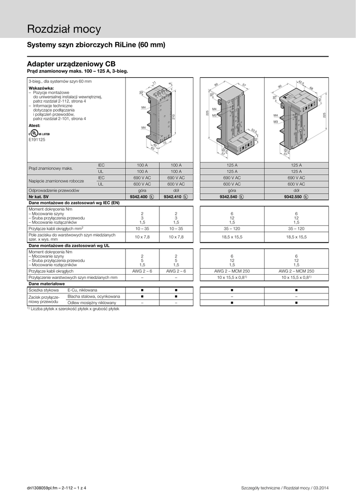 Rozdział mocy Systemy szyn zbiorczych RiLine (60 mm) Adapter urządzeniowy CB Prąd znamionowy maks. 100 – 125 A, 3-bieg. 3-bieg., dla systemów szyn 60 mm Wskazówka: – Pozycje montażowe do uniwersalnej instalacji wewnętrznej, patrz rozdział 2-112, strona 4 – Informacje techniczne dotyczące podłączania i połączeń przewodów, patrz rozdział 2-101, strona 4 Atest: E191125 Prąd znamionowy maks. Napięcie znamionowe robocze IEC 100 A 100 A 125 A UL 100 A 100 A 125 A 125 A IEC 690 V AC 690 V AC 690 V AC 690 V AC UL 600 V AC 600 V AC 600 V AC 600 V AC góra dół góra Odprowadzenie przewodów Nr kat. SV 9342.400 9342.410 125 A dół 9342.540 9342.550 Dane montażowe do zastosowań wg IEC (EN) Moment dokręcenia Nm – Mocowanie szyny – Śruba przyłączenia przewodu – Mocowanie rozłączników 2 3 1,5 2 3 1,5 6 12 1,5 6 12 1,5 Przyłącze kabli okrągłych mm2 10 – 35 10 – 35 35 – 120 35 – 120 Pole zacisku do warstwowych szyn miedzianych szer. x wys. mm 10 x 7,8 10 x 7,8 18,5 x 15,5 18,5 x 15,5 2 5 1,5 2 5 1,5 6 12 1,5 6 12 1,5 AWG 2 – 6 AWG 2 – 6 AWG 2 – MCM 250 AWG 2 – MCM 250 – – 10 x 15,5 x 0,81) 10 x 15,5 x 0,81) ◾ Dane montażowe dla zastosowań wg UL Moment dokręcenia Nm – Mocowanie szyny – Śruba przyłączenia przewodu – Mocowanie rozłączników Przyłącze kabli okrągłych Przyłączenie warstwowych szyn miedzianych mm Dane materiałowe Ścieżka stykowa E-Cu, niklowana ◾ ◾ ◾ Zacisk przyłączeniowy przewodu Blacha stalowa, ocynkowana ◾ ◾ – – Odlew mosiężny niklowany – – ◾ ◾ 1) Liczba płytek x szerokość płytek x grubość płytek dri1308059pl.fm – 2-112 – 1 z 4 Szczegóły techniczne / Rozdział mocy / 03.2014 Rozdział mocy Systemy szyn zbiorczych RiLine (60 mm) Adapter urządzeniowy CB Prąd znamionowy maks. 160 – 250 A, 3-bieg. 3-bieg., dla systemów szyn 60 mm Wskazówka: – Pozycje montażowe do uniwersalnej instalacji wewnętrznej, patrz rozdział 2-112, strona 4 – Informacje techniczne dotyczące podłączania i połączeń przewodów, patrz rozdział 2-101, strona 4 Prąd znamionowy maks. Napięcie znamionowe robocze 160 A 160 A 690 V AC 690 V AC Odprowadzenie przewodów góra dół 9342.500 9342.510 Moment dokręcenia Nm – Mocowanie szyny – Śruba przyłączenia przewodu – Mocowanie rozłączników 6 12 1,5 6 12 1,5 Przyłącze kabli okrągłych mm2 35 – 120 35 – 120 18,5 x 15,5 18,5 x 15,5 Nr kat. SV Dane montażowe do zastosowań wg IEC (EN) Pole zacisku do warstwowych szyn miedzianych szer. x wys. mm Dane materiałowe Ścieżka stykowa: E-Cu, niklowana ◾ ◾ Zacisk przyłączeniowy przewodu: Odlew mosiężny niklowany ◾ ◾ 3-bieg., dla systemów szyn 60 mm Wskazówka: – Pozycje montażowe do uniwersalnej instalacji wewnętrznej, patrz rozdział 2-112, strona 4 Prąd znamionowy maks. Napięcie znamionowe robocze Z przyłączem warstwowym mm1) Odprowadzenie przewodów Nr kat. SV 250 A 250 A 690 V AC 690 V AC 18 x 18 x 0,3 18 x 18 x 0,3 góra dół 9345.600 9345.610 6 1,5 6 1,5 ◾ ◾ Dane montażowe do zastosowań wg IEC (EN) Moment dokręcenia Nm – Mocowanie szyny – Mocowanie rozłączników Dane materiałowe Ścieżka stykowa: E-Cu 1) Liczba płytek x szerokość płytek x grubość płytek Szczegóły techniczne / Rozdział mocy / 03.2014 dri1308059pl.fm – 2-112 – 2 z 4 Rozdział mocy Systemy szyn zbiorczych RiLine (60 mm) Adapter urządzeniowy CB Prąd znamionowy maks. 400 – 630 A, 3-bieg. 3-bieg., dla systemów szyn 60 mm Wskazówka: – Pozycje montażowe do uniwersalnej instalacji wewnętrznej, patrz rozdział 2-112, strona 4 Prąd znamionowy maks. Napięcie znamionowe robocze IEC 400 A 630 A 400 A UL 400 A 600 A 400 A 600 A IEC 690 V AC 690 V AC 690 V AC 690 V AC UL Z przyłączem warstwowym mm1) Odprowadzenie przewodów Nr kat. SV 630 A 600 V AC 600 V AC 600 V AC 600 V AC 20 x 29 x 0,3 32 x 29 x 0,3 20 x 29 x 0,3 32 x 29 x 0,3 góra góra dół dół 9345.720 9345.700 9345.730 9345.710 14 2,5 14 2,5 14 2,5 14 2,5 ◾ ◾ ◾ ◾ Dane montażowe do zastosowań wg IEC (EN) Moment dokręcenia Nm – Mocowanie szyny – Mocowanie rozłączników Dane materiałowe Ścieżka stykowa: E-Cu 1) Liczba płytek x szerokość płytek x grubość płytek dri1308059pl.fm – 2-112 – 3 z 4 Szczegóły techniczne / Rozdział mocy / 03.2014 Rozdział mocy Systemy szyn zbiorczych RiLine (60 mm) Adapter urządzeniowy CB Dodatkowo do bezpośredniego wyposażenia adapterów urządzeniowych CB, podane w Katalogu wyłączniki mocy można wykorzystać adaptery CB także do indywidualnego wyposażenia przyrządami sterującymi. Należy tutaj zwrócić uwagę, aby ◾ punkty mocowania przyrządów sterujących znajdowały się w zakresie ustawień wpustów przesuwnych, ◾ przyrządy sterujące mogły być montowane na adapterze przy uwzględnieniu wymiarów przyłączeniowych i zakresu przyłączeniowego. Zamieszczone poniżej szczegółowe rysunki służą jako wzorzec do sprawdzenia żądanej pozycji montażowej. SV 9342.400/.410 SV 9342.500/.510 SV 9342.540/.550 Porównywalne z SV 9342.500/.510 72 64 L1 L3 L2 L2 L3 34 L1 L1 L2 L3 L3 L2 L1 L2 10 225 180.5 47.5 M 1 215 10 70 210 155.1 4 15 L1 52.5 34 32 M4 15 52.5 42 Ø 2.4 29 11 L3 L2 29 22 L1 90 40.7 22 27.6 7.5 22 1 L3 27.5 ± 3 Wpust przesuwny SV 9342.560 10 5 M4 5 M3 140 73 45 39 L2 L3 75 L1 70 9.6 29 6 12 145 145 334 12 243.5 39.5 70 70 49.3 201.5 50 70 66 67.8 10 L3 29 5.4 64.3 L3 10 L2 L1 9 L2 L3 18 45 41.3 75 L1 L3 L2 L2 50 L1 L1 140 73 45 39 34.9 45 334 41.7 54.5 L3 44.5 35 L2 105 35 SV 9345.710/.730 SV 9345.700/.720 L1 SV 9345.600/.610 2 3 3 Wpust przesuwny Wpust przesuwny SV 9342.640 SV 9342.720 28 M6 M5 9.8 7.9 7.9 M5 3.7 4.5 M4 28 M4 9.2 2 9 4.6 2 0.5 Szczegóły techniczne / Rozdział mocy / 03.2014 5.2 dri1308059pl.fm – 2-112 – 4 z 4
