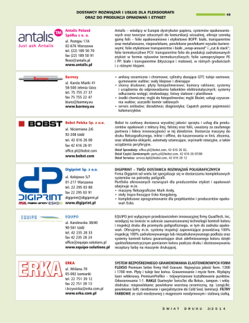 Dostawcy rozwiązań i usług dla fleksografii oraz do produkcji opakowań i etykiet Antalis Poland Spółka z o. o. 49 ul. Postępu 17A 02-676 Warszawa tel. (22) 189 50 70 fax (22) 189 50 91 [email protected] www.antalis.pl Antalis – wiodący w Europie dystrybutor papieru, systemów opakowaniowych oraz tworzyw sztucznych do komunikacji wizualnej, oferuje szeroką gamę folii – folie opakowaniowe i etykietowe BOPP: białe, transparentne oraz metalizowane, niepowlekane, powlekane powłokami wysoko barierowymi; folie etykietowe transparentne i białe „wrap-around” i „cut & stack”; folie termokurczliwe PCV: transparentne folie do produkcji zadrukowanych etykiet w formie rękawów termokurczliwych; folie samoprzylepne PE i PP: białe i transparentne (błyszczące i matowe), w różnych grubościach i z różnymi klejami. Barmey • aniloxy ceramiczne i chromowe; cylindry dozujące GTT; tuleje rastrowe; ul. Karola Miarki 41 58-500 Jelenia Góra tel. 75 755 27 37 fax 75 755 22 47 [email protected] www.barmey.eu Bobst Polska Sp. z o.o. ul. Niciarniana 2/6 92-208 Łódź tel. 42 616 26 00 fax 42 616 26 01 [email protected] www.bobst.com Digiprint Sp. z o.o. ul. Kolejowa 5/7 01-217 Warszawa tel. 22 295 03 80 fax 22 295 03 91 [email protected] www.digiprint.pl EQUIPO ul. Karolewska 38/40 90-561 Łódź tel. 42 235 28 33 fax 42 235 28 24 [email protected] www.equipo-solutions.pl ERKA ul. Wiślana 70 05-092 Łomianki tel. 22 751 39 12 fax 22 751 39 13 [email protected] www.erka.com.pl gumowanie wałów; wały klejowe i zbierające • sleevy drukowe; płyty fotopolimerowe; komory raklowe; systemy i urządzenia do odprowadzania ładunków elektrostatycznych; systemy odkurzania wstęgi; stroboskopy; listwy stalowe i plastikowe • środki chemiczne; myjki do fotopolimerów; myjki BioJet; usługi czyszczenia wałów; uszczelki komór raklowych • serwis aniloxów; doradztwo; diagnostyka; Capatch pomiar pojemności kałamarzyków. Bobst to czołowy dostawca wysokiej jakości sprzętu i usług dla producentów opakowań z tektury litej, falistej oraz folii, uważany za zaufanego partnera i lidera innowacyjności w tej dziedzinie. Dostarcza maszyny do druku fleksograficznego, inline i offline, do kaszerowania w linii, złocenia, oraz składarko-sklejarki, automaty sztancujące, wycinarki rotacyjne, a także urządzenia peryferyjne. Dział Sprzedaży: [email protected], 42 616 26 02, Dział Części Zamiennych: [email protected], 42 616 26 07/08 Dział Serwisu: [email protected], 42 616 26 12 DIGIPRINT – TWÓJ DOSTAWCA ROZWIĄZAŃ POLIGRAFICZNYCH Firma Digiprint od wielu lat specjalizuje się w dostarczaniu kompleksowych systemów na potrzeby poligrafii. Portfolio oferowanych rozwiązań dla producentów etykiet i opakowań obejmuje m.in. • maszyny fleksograficzne Mark Andy, • stoły tnąco-frezujące Esko Kongsberg, • kompleksowe oprogramowanie dla projektantów i producentów opakowań Esko. EQUIPO jest wyłącznym przedstawicielem innowacyjnej firmy QuadTech, Inc, wiodącej na świecie w zakresie zaawansowanej technologii kontroli koloru i inspekcji druku dla przemysłu poligraficznego, w tym do zadruku opakowań. Oferujemy m.in. systemy inspekcji zapewniające prawdziwą 100% inspekcję 100% zadrukowywanego lub niezadrukowywanego podłoża oraz systemy kontroli koloru gwarantujące druk zdefiniowanego koloru dzięki spektrofotometrycznym pomiarom koloru podczas druku i dostosowywaniu receptury farby na maszynie drukującej. SYSTEM BEZPOŚREDNIEGO GRAWEROWANIA ELASTOMEROWYCH FORM FLEKSO Premium Setter firmy Hell Gravure. Najwyższa jakość form. 1300 i 1700 mm. Płyty i tuleje bez końca. Grawerowanie i mycie form. Wydajny laser włóknowy. PremiumProfiler – trójwymiarowe kształtowanie punktów. Odwzorowanie 1:1. RAKLE Daetwyler SwissTec dla flekso-, tampon- i wklęsłodruku: niepowlekane; powlekane warstwą ceramiczną, np. LongLife; powlekane Soft; nierdzewne i specjalistyczne do Cold Seal, laminacji. FILTRY FARBOWE ze stali nierdzewnej z magnesem neodymowym i stalową siatką. ś W I A T D R U K U 3/2 0 1 4 Dostawcy rozwiązań i usług dla fleksografii oraz do produkcji opakowań i etykiet 50 EUROSTICK ul. 3-go Maja 8 05-800 Pruszków tel. 22 738 34 69 22 738 34 60 fax 22 738 34 62 [email protected] www.eurostick.pl Konfekcjonowanie i sprzedaż w rolach i arkuszach: materiałów samoprzylepnych, podłoży syntetycznych, papierów satynowanych, kartonów termicznych i termotransferowych. Projektowanie i produkcja form wtryskowych, tłoczników i innych narzędzi. Usługi obróbki precyzyjnej z wykorzystaniem pionowych centrów obróbczych CNC 3-osiowego i 5-osiowego oraz elektrodrążarek, drutowej i wgłębnej. EyeC Polska Marcin Weksler EyeC - wiodący producent systemów kontroli jakości i zgodności opakowań dedykowanych dla branży poligraficznej, farmaceutycznej, kosmetycznej i FMCG. Systemy EyeC weryfikują wydrukowane użytki, arkusze i wstęgi: 55-093 Kiełczów etykiet kartoników, ulotek i folii. Weryfikacji podlegają: grafika, teksty, kolory, ul. Platynowa 20 kody 1D, kody 2D, zapis Braille’a. Oferowane systemy zabezpieczają cały protel. +48 512 354 354 ces produkcji od prepress przez press do postpress. W ofercie EyeC znajdują e-mail: [email protected] się systemy Offline oraz systemy Inline na maszyny drukujące (wąska i szeroka www.eyecpolska.pl wstęga, offset arkuszowy i rolowy), składarko-sklejarki oraz przewijarki. Flexcon to innowacyjna firma powstała w 1956 roku, oferująca szeroki FLEXcon Europe Ltd. wybór materiałów takich jak poliester, poliolefiny, polietylen czy winyl. Przedstawicielstwo w Polsce na Europę centralną i wschodnią Główne segmenty rynku, w których znajdują zastosowanie nasze materiały, to elektronika, przemysł medyczny, rynek opakowań, filmy graficzne, matetel. 660 542986 riały security, taśmy montażowe, membrany, filmy ochronne. Przywiązujemy [email protected] dużą wagę do długoterminowych relacji z kli