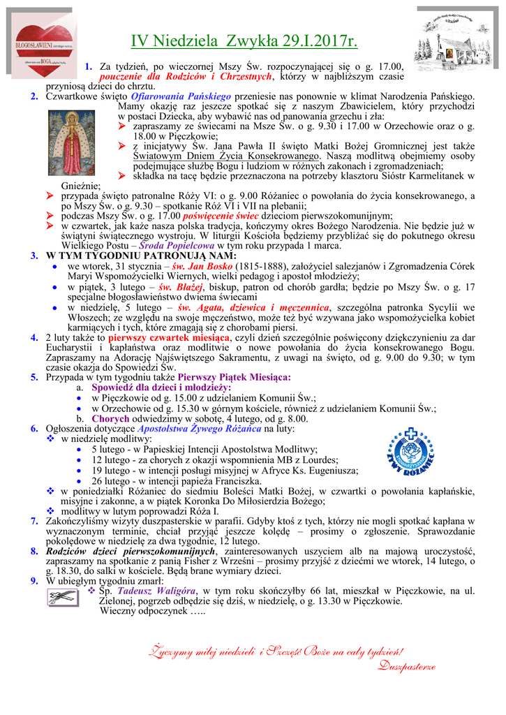 IV Niedziela Zwykła 29.I.2017r. 2. 3. 4. 5. 6. 7. 8. 9. 1. Za tydzień, po wieczornej Mszy Św. rozpoczynającej się o g. 17.00, pouczenie dla Rodziców i Chrzestnych, którzy w najbliższym czasie przyniosą dzieci do chrztu. Czwartkowe święto Ofiarowania Pańskiego przeniesie nas ponownie w klimat Narodzenia Pańskiego. Mamy okazję raz jeszcze spotkać się z naszym Zbawicielem, który przychodzi w postaci Dziecka, aby wybawić nas od panowania grzechu i zła: zapraszamy ze świecami na Msze Św. o g. 9.30 i 17.00 w Orzechowie oraz o g. 18.00 w Pięczkowie; z inicjatywy Św. Jana Pawła II święto Matki Bożej Gromnicznej jest także Światowym Dniem Życia Konsekrowanego. Naszą modlitwą obejmiemy osoby podejmujące służbę Bogu i ludziom w różnych zakonach i zgromadzeniach; składka na tacę będzie przeznaczona na potrzeby klasztoru Sióstr Karmelitanek w Gnieźnie; przypada święto patronalne Róży VI: o g. 9.00 Różaniec o powołania do życia konsekrowanego, a po Mszy Św. o g. 9.30 – spotkanie Róż VI i VII na plebanii; podczas Mszy Św. o g. 17.00 poświęcenie świec dzieciom pierwszokomunijnym; w czwartek, jak każe nasza polska tradycja, kończymy okres Bożego Narodzenia. Nie będzie już w świątyni świątecznego wystroju. W liturgii Kościoła będziemy przybliżać się do pokutnego okresu Wielkiego Postu – Środa Popielcowa w tym roku przypada 1 marca. W TYM TYGODNIU PATRONUJĄ NAM: we wtorek, 31 stycznia – św. Jan Bosko (1815-1888), założyciel salezjanów i Zgromadzenia Córek Maryi Wspomożycielki Wiernych, wielki pedagog i apostoł młodzieży; w piątek, 3 lutego – św. Błażej, biskup, patron od chorób gardła; będzie po Mszy Św. o g. 17 specjalne błogosławieństwo dwiema świecami w niedzielę, 5 lutego – św. Agata, dziewica i męczennica, szczególna patronka Sycylii we Włoszech; ze względu na swoje męczeństwo, może też być wzywana jako wspomożycielka kobiet karmiących i tych, które zmagają się z chorobami piersi. 2 luty także to pierwszy czwartek miesiąca, czyli dzień szczególnie poświęcony dziękczynieniu za dar Eucharystii i kapłaństwa oraz modlitwie o nowe powołania do życia konsekrowanego Bogu. Zapraszamy na Adorację Najświętszego Sakramentu, z uwagi na święto, od g. 9.00 do 9.30; w tym czasie okazja do Spowiedzi Św. Przypada w tym tygodniu także Pierwszy Piątek Miesiąca: a. Spowiedź dla dzieci i młodzieży: w Pięczkowie od g. 15.00 z udzielaniem Komunii Św.; w Orzechowie od g. 15.30 w górnym kościele, również z udzielaniem Komunii Św.; b. Chorych odwiedzimy w sobotę, 4 lutego, od g. 8.00. Ogłoszenia dotyczące Apostolstwa Żywego Różańca na luty: w niedzielę modlitwy: 5 lutego - w Papieskiej Intencji Apostolstwa Modlitwy; 12 lutego - za chorych z okazji wspomnienia MB z Lourdes; 19 lutego - w intencji posługi misyjnej w Afryce Ks. Eugeniusza; 26 lutego - w intencji papieża Franciszka. w poniedziałki Różaniec do siedmiu Boleści Matki Bożej, w czwartki o powołania kapłańskie, misyjne i zakonne, a w piątek Koronka Do Miłosierdzia Bożego; modlitwy w lutym poprowadzi Róża I. Zakończyliśmy wizyty duszpasterskie w parafii. Gdyby ktoś z tych, którzy nie mogli spotkać kapłana w wyznaczonym terminie, chciał przyjąć jeszcze kolędę – prosimy o zgłoszenie. Sprawozdanie pokolędowe w niedzielę za dwa tygodnie, 12 lutego. Rodziców dzieci pierwszokomunijnych, zainteresowanych uszyciem alb na majową uroczystość, zapraszamy na spotkanie z panią Fisher z Wrześni – prosimy przyjść z dziećmi we wtorek, 14 lutego, o g. 18.30, do salki w kościele. Będą brane wymiary dzieci. W ubiegłym tygodniu zmarł: Śp. Tadeusz Waligóra, w tym roku skończyłby 66 lat, mieszkał w Pięczkowie, na ul. Zielonej, pogrzeb odbędzie się dziś, w niedzielę, o g. 13.30 w Pięczkowie. Wieczny odpoczynek ….. Życzymy miłej niedzieli i Szczęść Boże na cały tydzień! Duszpasterze Intencje Mszalne 29.I. – 5.II.2017r. IV Niedziela Zwykła 29 stycznia 7.30 Za Parafian 9.30 †Stefan Misterski – 10 rocz. śm. oraz Zmarli Rodzice i Teść 10.45 †Józef i Katarzyna Dominik – 50 rocz. śm. 12.00 †Wiesław Andrzejewski – 3 rocz. śm. oraz Genowefa, Franciszek i Bolesław Nowiccy 17.00 †Dariusz Zięty – z okazji urodzin - od koleżanek i kolegów syna Marka z klasy ze Szkoły Podstawowej Kazanie na górze Poniedziałek 17.00 †Daniela Grala – 1 rocz. śm. 30 stycznia Wtorek 31 stycznia Środa 1 lutego Czwartek 2 luty Matki Boskiej Gromnicznej Pięczkowo Piątek 3 lutego Sobota 4 lutego V Niedziela Zwykła 5 lutego Wy jesteście solą ziemi 17.00 †Irena Gogolkiewicz - od wnuka Mateusza z Karoliną i wnuczki Angeliki †Zygmunt Zakrzewicz - od rodziny Ziętych †Józef Nowak - od Jadwigi Stachowiak z Rodziną †Henryk Budasz - od wnuczki Natalii z mężem Waldemarem i synem Wiktorem †Helena Zaworska - od rodziny Tomalków 17.00 †Wincenty i Aniela Budasz oraz Zmarli z Rodziny 17.00 †Stanisława Czarnula (o) - od bratanka Mariusza z Rodziną 9.30 W intencjach Apostolstwa Żywego Różańca, za Zmarłe Członkinie: †Helena Dzieciuchowicz - od Matek Różańcowych Róży VII †Janina Matuszewska - od Matek Różańcowych Róży VII †Łucja Dudek - od Matek Różańcowych Róży III †Helena Janiszewska - od Róży VI Żywego Różańca i Apostolstwa Dobrej Śmierci 10.45 (Pięczkowo) †Stefania i Ludwik Kaczmarek, Maria i Józef Talarscy, Kazimierz Grabowski oraz Zmarli z rodzin Kaczmarków i Wasielewskich 17.00 †Maria Nowak – z okazji imienin 18.00 †Józef Gołębniak – 7 rocz. śm. oraz Zmarli z Rodziny †Andrzej Ratajczak – z okazji imienin - od Mariana Pawlaczyka †Czesława Śmigaj - od rodzin Łachów, Frąckowiaków i Hetmańczyków †Zofia Jędrzak - od Pelczyków z Nowego Miasta, Woźniaków z Orzechowa, Wiśniewskich i Osińskich ze Środy Wlkp., Roszaków i Chojnackich z Krzykos, Ewy Pelczyk z Rodziną z Krzykos i Krystyny 
