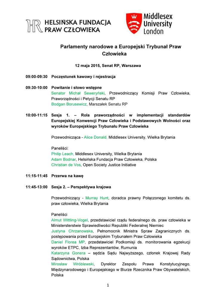 Parlamenty narodowe a Europejski Trybunał Praw Człowieka 12 maja 2015, Senat RP, Warszawa 09:00-09:30 Poczęstunek kawowy i rejestracja 09:30-10:00 Powitanie i słowo wstępne Senator Michał Seweryński, Przewodniczący Komisji Praw Człowieka, Praworządności i Petycji Senatu RP Bodgan Borusewicz, Marszałek Senatu RP 10:00-11:15 Sesja 1. – Rola praworządności w implementacji standardów Europejskiej Konwencji Praw Człowieka i Podstawowych Wolności oraz wyroków Europejskiego Trybunału Praw Człowieka Przewodnicząca - Alice Donald, Middlesex University, Wielka Brytania Paneliści: Philip Leach, Middlesex University, Wielka Brytania Adam Bodnar, Helsińska Fundacja Praw Człowieka, Polska Christian de Vos, Open Society Justice Initiative 11:15-11:45 Przerwa na kawę 11:45-13:00 Sesja 2. – Perspektywa krajowa Przewodniczący - Murray Hunt, doradca prawny Połączonego komitetu ds. praw człowieka, Wielka Brytania Paneliści Almut Wittling-Vogel, przedstawiciel rządu federalnego ds. praw człowieka w Ministersterstwie Sprawiedliwości Republiki Federalnej Niemiec Justyna Chrzanowska, Pełnomocnik Ministra Spraw Zagranicznych ds. postępowania przed Europejskim Trybunałem Praw Człowieka Daniel Florea MP, przedstawiciel Podkomisji ds. monitorowania egzekucji wyroków ETPC, Izba Reprezentantów, Rumunia Katarzyna Gonera – sędzia Sądu Najwyższego, członek Krajowej Rady Sądownictwa, Polska Mirosław Wróblewski, Dyrektor Zespołu Prawa Konstytucyjnego, Międzynarodowego i Europejskiego w Biurze Rzecznika Praw Obywatelskich, Polska 1 13:00-14:00 Obiad 14:00-15:15 Sesja 3. – Implementacja wyroków ETPC: rola organów Rady Europy i ich relacje z parlamentami krajowymi Przewodnicząca – Dominika Bychawska-Siniarska, Helsińska Fundacja Praw Człowieka, Polska Paneliści Andrew Drzemczewski, Dyrektor Sekretariatu Komitetu Spraw Prawnych i Praw Człowieka Zgromadzenia Parlamentarnego Rady Europy Fredrik Sundberg, Dyrektor Departamentu yykonywania wyroków Europejskiego Trybunału Praw Człowieka, Rada Europy Başak Çalı, Profesor na Uniwerystecie Koç, Turcja Robert Biedron, były poseł na Sejm RP i były przedstawiciel delegacji polskiej do Zgromadzenia Parlamentarnego Rady Europy 15:15-15:45 Przerwa na herbatę 15:45-17:00 Sesja 4. – Parlamenty i Europejski Trybunał Praw Człowieka Przewodniczący: Philip Leach, Middlesex University Paneliści: Murray Hunt, doradca prawny Połączonego komitetu ds. praw człowieka, Wielka Brytania Zdravka Kaladjieva, była sędzia Europejskiego Trybunału Praw Człowieka, Bułgaria Egbert Myjer, były sędzia Europejskiego Trybunału Praw Człowieka, Holandia Lech Garlicki, były sędzia Europejskiego Trybunału Praw Człowieka, Polska 17:00-17:30 Uwagi końcowe – debata zamykająca Alice Donald, Middlesex University 2