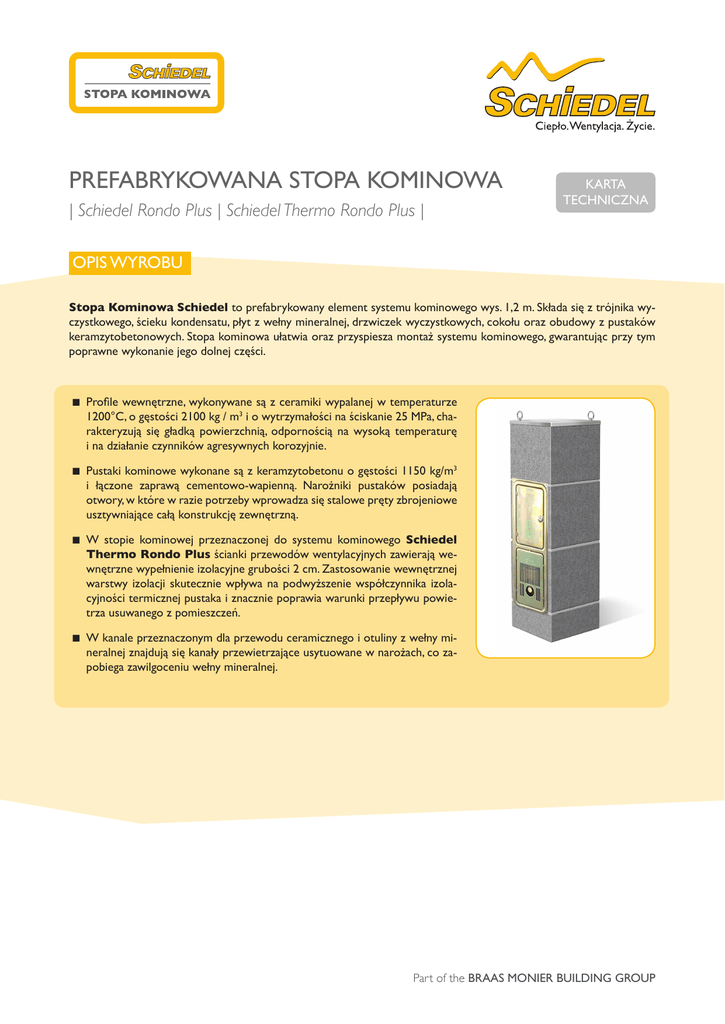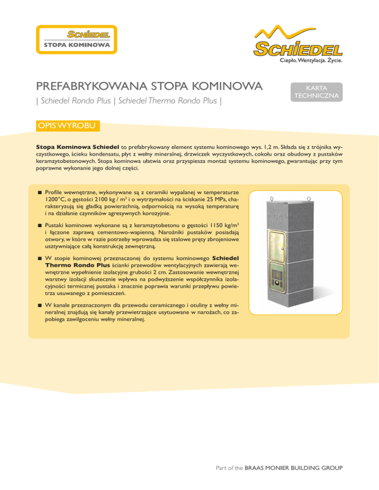 PREFABRYKOWANA STOPA KOMINOWA | Schiedel Rondo Plus | Schiedel Thermo Rondo Plus | KARTA TECHNICZNA OPIS WYROBU Stopa Kominowa Schiedel to prefabrykowany element systemu kominowego wys. 1,2 m. Składa się z trójnika wyczystkowego, ścieku kondensatu, płyt z wełny mineralnej, drzwiczek wyczystkowych, cokołu oraz obudowy z pustaków keramzytobetonowych. Stopa kominowa ułatwia oraz przyspiesza montaż systemu kominowego, gwarantując przy tym poprawne wykonanie jego dolnej części. n Profile wewnętrzne, wykonywane są z ceramiki wypalanej w temperaturze 1200°C, o gęstości 2100 kg / m3 i o wytrzymałości na ściskanie 25 MPa, charakteryzują się gładką powierzchnią, odpornością na wysoką temperaturę i na działanie czynników agresywnych korozyjnie. n Pustaki kominowe wykonane są z keramzytobetonu o gęstości 1150 kg/m3 i łączone zaprawą cementowo-wapienną. Narożniki pustaków posiadają otwory, w które w razie potrzeby wprowadza się stalowe pręty zbrojeniowe usztywniające całą konstrukcję zewnętrzną. n W stopie kominowej przeznaczonej do systemu kominowego Schiedel Thermo Rondo Plus ścianki przewodów wentylacyjnych zawierają wewnętrzne wypełnienie izolacyjne grubości 2 cm. Zastosowanie wewnętrznej warstwy izolacji skutecznie wpływa na podwyższenie współczynnika izolacyjności termicznej pustaka i znacznie poprawia warunki przepływu powietrza usuwanego z pomieszczeń. n W kanale przeznaczonym dla przewodu ceramicznego i otuliny z wełny mineralnej znajdują się kanały przewietrzające usytuowane w narożach, co zapobiega zawilgoceniu wełny mineralnej. Part of the BRAAS MONIER BUILDING GROUP KARTA TECHNICZNA PRZEZNACZENIE, ZAKRES I WARUNKI STOSOWANIA Zastosowanie prefabrykowanej stopy kominowej znacznie przyspiesza montaż całego systemu kominowego. Rozwiązanie to ogranicza ryzyko popełnienia błędów montażowych i gwarantuje poprawne ułożenie ceramiki oraz kompletność dolnej części komina. Stopa Kominowa Schiedel eliminuje również konieczność czasochłonnego wykonania cokołu. Konstrukcja stopy zapewnia skuteczne przewietrzenie warstwy wełny mineralnej, a także umożliwia odprowadzenie kondensatu. Stopa Kominowa Schiedel może być wykorzystywana do budowy kominów znajdujących się wewnątrz jak i na zewnątrz budynku. Jest ona przeznaczona do systemu kominowego Schiedel Rondo Plus oraz Schiedel Thermo Rondo Plus. Stopa Kominowa Schiedel posiada uchwyty umożliwiające przenoszenie jej za pomocą dźwigu. WYKONANIE Montaż stopy kominowej powinien odbyć się na wcześniej przygotowanym fundamencie zgodnie z instrukcją montażu oraz zasadami sztuki budowlanej i BHP. W przypadku przerw w montażu komina należy zabezpieczyć jego wnętrze przed zawilgoceniem. Przewody kominowe wykonuje się jako konstrukcje samonośne, oddzielone od elementów nośnych budynków. Elementy ceramiczne łączone są specjalnym kitem kwasoodpornym Schiedel Rapid. Pustaki zewnętrzne łączone są zaprawą cementowo – wapienną marki nie mniejszej niż 3,0 MPa. Montaż przeprowadzać w temperaturach otoczenia od +5 do + 30oC. PROGRAM DOSTAWCZY Rodzaj komina średnica w cm wymiar zewnętrzny w cm wymiar wentylacji w cm waga w kg 18 36 x 36 - 110 20 36 x 36 - 117 18+W 36 x 50 10 x 26 148 20+W 36 x 50 10 x 26 155 18+W 36 x 58 10,5 x 17 158 20+W 36 x 58 10,5 x 17 165 Schiedel Sp. z o.o., Centrala, ul. Wschodnia 24, 45-449 Opole, T (77) 455 59 49, F (77) 455 59 47. Dział sprzedaży: T (77) 456 83 10, T (77) 456 93 48, T (77) 451 74 60. Dział techniczny: T (77) 456 83 11 n Schiedel Sp. z o.o., Biuro Północ, ul. Małgorzatowo 3c, 87-162 Lubicz Dolny. Dział techniczny: T (56) 674 48 25 www.schiedel.pl Part of the BRAAS MONIER BUILDING GROUP