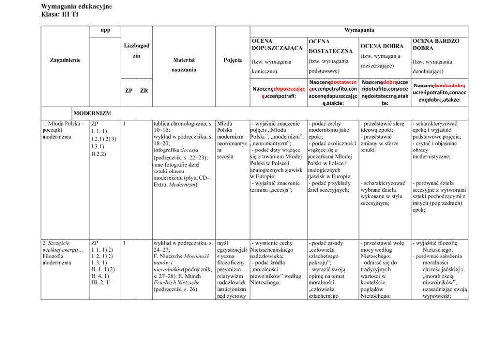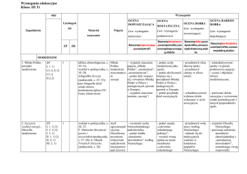 Wymagania edukacyjne Klasa: III Ti npp Wymagania Liczbagod zin Zagadnienie Materiał Pojęcia nauczania ZP OCENA DOPUSZCZAJĄCA OCENA (tzw. wymagania (tzw. wymagania konieczne) podstawowe) DOSTATECZNA OCENA DOBRA OCENA BARDZO DOBRA (tzw. wymagania rozszerzające) (tzw. wymagania dopełniające) Naocenędostateczn Naocenędobrąucze Naocenębardzodobrą Naocenędopuszczając ąuczeńpotrafito,con ńpotrafito,conaoce uczeńpotrafito,conaoc ąuczeńpotrafi: aocenędopuszczając nędostateczną,atak enędobrą,atakże: ą,atakże: że: ZR MODERNIZM 1. Młoda Polska – początki modernizmu 2. Szczęście wielkiej energii… Filozofia modernizmu ZP I. 1. 1) I.2.1) 2) 3) I.3.1) II.2.2) ZP I. 1. 1) 2) I. 2. 1) 2) I. 3. 1) II. 1. 1) 2) II. 4. 1) III. 2. 1) 1 1 tablica chronologiczna, s. 10–16; wykład w podręczniku, s. 18–20; infografika Secesja (podręcznik, s. 22–23); wybrane fotografie dzieł sztuki okresu modernizmu (płyta CDExtra, Modernizm) Młoda Polska modernizm neoromantyz m secesja wykład w podręczniku, s. 24–27; F. Nietzsche Moralność panów i niewolników(podręcznik, s. 27–28); E. Munch Friedrich Nietzsche (podręcznik, s. 26) myśl egzystencjali styczna filozoficzny pesymizm relatywizm nadczłowiek intuicjonizm pęd życiowy - wyjaśnić znaczenie pojęcia „Młoda Polska”, „modernizm”, „neoromantyzm”; - podać daty wiążące się z trwaniem Młodej Polski w Polsce i analogicznych zjawisk w Europie; - wyjaśnić znaczenie terminu „secesja”; - podać cechy modernizmu jako epoki; - podać okoliczności wiążące się z początkami Młodej Polski w Polsce i analogicznych zjawisk w Europie; - podać przykłady dzieł secesyjnych; - przedstawić sferę ideową epoki; - przedstawić zmiany w sferze sztuki; - scharakteryzować epokę i wyjaśnić podstawowe pojęcia; - czytać i objaśniać obrazy modernistyczne; - scharakteryzować wybrane dzieła wykonane w stylu secesyjnym; - porównać dziela secesyjne z wytworami sztuki pochodzącymi z innych (poprzednich) epok; - wymienić cechy Nietzscheańskiego nadczłowieka; - podać źródła „moralności niewolników” według Nietzschego; - podać zasady „człowieka szlachetnego pokroju”; - wyrazić swoją opinię na temat moralności „człowieka szlachetnego - przedstawić wolę mocy według Nietzschego; - odnieść się do tradycyjnych wartości w kontekście poglądów Nietzschego; - wyjaśnić filozofię Nietzschego; - porównać założenia moralności chrześcijańskiej z „moralnością niewolników”, uzasadniając swoją wypowiedź; (élanvital) witalizm anarchizm - przedstawić genezę nihilizm utworu; naturalizm - wypowiedzieć się na etyczny temat bohaterów i ich immoralizm postaw; (amoralizm) inteligencja 3. Jedna śmierć w zamian za sto istnień… Credo rosyjskiego nihilisty ZP I. 1. 1) I. 2. 1) 2) I. 3. 1) II. 1. 1) 2) II. 2. 1) 2) 4) 5) II. 3. 1) 2) 3) 4) II. 4. 1) 2) 3) III. 1. 1) III. 2. 1) 1 wykład w podręczniku, s. 29–30; F. Dostojewski Zbrodnia i kara (podręcznik, s. 31– 32 oraz całość powieści); P. FiedotowEncore, jeszcze raz, encore! (podręcznik, s. 30); I. Repin Student nihilista (podręcznik, s. 32) 4. Po prostu zabiłem…Nowocze sna literacka psychologia zbrodni ZP I. 1. 1) I. 2. 1) 2) I. 3. 1) II. 1. 1) 2) II. 2. 1) 2) 4) 5) 1 wykład w podręczniku, s. premedytacja - zrelacjonować 35; motywacja rozmyślania F. Dostojewski Zbrodnia Raskolnikowa i kara (podręcznik, s. 35– dotyczące zbrodni; 37 oraz całość powieści); - opisać zachowanie, T. GéricaultMonoman odczucia i myśli kradzieży, Monomanka bohatera po dokonaniu pokroju”; - wskazać zasadnicze tezy artykułu; - opisać wątpliwości moralne studenta i oficera; - przedstawić motyw - wyjaśnić związek zbrodni; poglądów - odnieść poglądy Raskolnikowa z bohaterów do pojęć jego planem immoralizmu i zbrodni; naturalizmu - zestawić postawy etycznego; moralne bohaterów - osądzić z zasadami Raskolnikowa; moralności - porównać postawę chrześcijańskiej; ideową - nakreślić portret Raskolnikowa z Raskolnikowa jako poglądami Łużyna i rosyjskiego Liebiezatnikowa; inteligenta XIX w.; - ocenić, czy Raskolnikow jest nihilistą, uzasadniając swój sąd; - osądzić Raskolnikowa, biorąc pod uwagę wszelkie okoliczności jego działania; - odnieść się do całości utworu; - porównać tezy artykułu Raskolnikowa z poglądami Nietzschego; - przygotować mowę oskarżycielską przeciw Raskolnikowowi; - wskazać sens - wyjaśnić, dlaczego - ocenić, czy zestawienia zbrodni Raskolnikow nie Raskolnikowa i choroby; odnosi do siebie można uznać za - wymienić motywy wniosków człowieka z zbrodni bohatera; dotyczących zaburzeniami - przedstawić linię zaburzeń psychicznymi, obrony psychicznych; uzasadniając swoją II. 3. 1) 2) 3) 4) II. 4. 1) 2) 3) III. 1. 1) III. 2. 1) 5. Czymże byłabym bez Boga? Sonia Marmieładowa – grzesznica i święta ZP I. 1. 1) I. 2. 1) 2) I. 3. 1) II. 1. 1) 2) II. 2. 1) 2) 4) 5) II. 3. 1) 2) 3) 4) II. 4. 1) 2) 3) III. 1. 1) III. 2. 1) 1 hazardu (podręcznik, s. 36) zabójstwa; Raskolnikowa; - wskazać czynniki prowadzące do moralnej degeneracji człowieka; wykład w podręczniku, s. agape 39–40; grzech F. Dostojewski Zbrodnia i kara (podręcznik, s. 40– 42 oraz całość powieści); I. LewitanNad wiecznym pokojem (podręcznik, s. 39); J. BéraudMaria Magdalena u faryzeusza (podręcznik, s. 41) - wypowiedzieć się na temat postępowania Soni; - opisać emocje bohaterów w trakcie czytania fragmentów Ewangelii; - podać przyczyny wstąpienia Soni na „drogę grzechu”; - przedstawić grzeszność Soni i Raskolnikowa; - odnieść się do wypowiedzi Soni Czymże ja bym była bez Boga?; - określić wrażliwość emocjonalną i moralną oraz refleksyjność bohatera; - wskazać pułapki nihilizmu; opinię; - wyrazić swoją opinię dotyczącą motywów zbrodni dokonanej przez bohatera; - rozstrzygnąć, czy nędza może być usprawiedliwiony m 
