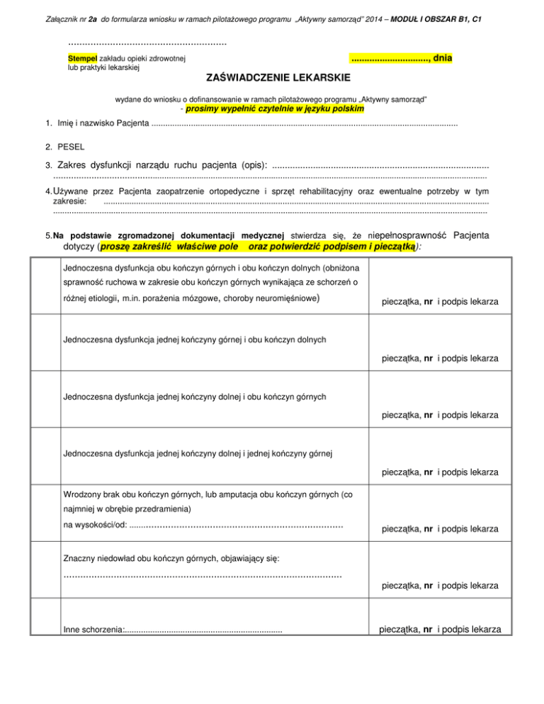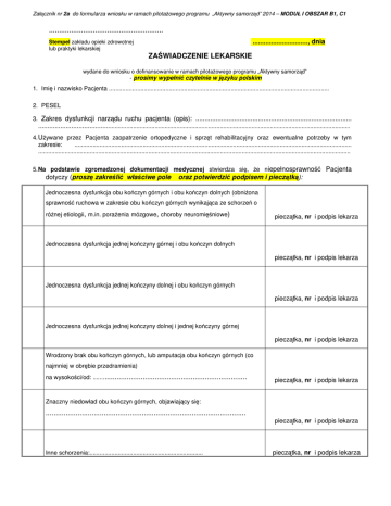 Załącznik nr 2a do formularza wniosku w ramach pilotażowego programu „Aktywny samorząd” 2014 – MODUŁ I OBSZAR B1, C1 ......................................................... .............................., dnia Stempel zakładu opieki zdrowotnej lub praktyki lekarskiej ZAŚWIADCZENIE LEKARSKIE wydane do wniosku o dofinansowanie w ramach pilotażowego programu „Aktywny samorząd” - prosimy wypełnić czytelnie w języku polskim 1. Imię i nazwisko Pacjenta .................................................................................................................................... 2. PESEL 3. Zakres dysfunkcji narządu ruchu pacjenta (opis): ..................................................................................... ....................................................................................................................................................................................... 4. Używane przez Pacjenta zaopatrzenie ortopedyczne i sprzęt rehabilitacyjny oraz ewentualne potrzeby w tym zakresie: ...................................................................................................................................................................... ........................................................................................................................................................................................... 5. Na podstawie zgromadzonej dokumentacji medycznej stwierdza się, że niepełnosprawność Pacjenta dotyczy (proszę zakreślić właściwe pole oraz potwierdzić podpisem i pieczątką): Jednoczesna dysfunkcja obu kończyn górnych i obu kończyn dolnych (obniżona sprawność ruchowa w zakresie obu kończyn górnych wynikająca ze schorzeń o różnej etiologii, m.in. porażenia mózgowe, choroby neuromięśniowe) pieczątka, nr i podpis lekarza Jednoczesna dysfunkcja jednej kończyny górnej i obu kończyn dolnych pieczątka, nr i podpis lekarza Jednoczesna dysfunkcja jednej kończyny dolnej i obu kończyn górnych pieczątka, nr i podpis lekarza Jednoczesna dysfunkcja jednej kończyny dolnej i jednej kończyny górnej pieczątka, nr i podpis lekarza Wrodzony brak obu kończyn górnych, lub amputacja obu kończyn górnych (co najmniej w obrębie przedramienia) na wysokości/od: .............................................................................. pieczątka, nr i podpis lekarza Znaczny niedowład obu kończyn górnych, objawiający się: .................................................................................................... pieczątka, nr i podpis lekarza Inne schorzenia:.................................................................... pieczątka, nr i podpis lekarza Str. 2 załącznika nr 2a do formularza wniosku – dotyczy formularzy wniosków – MODUŁ I OBSZAR C1 6. Ponadto (pole obowiązkowe w przypadku Pacjenta ubiegającego się o dofinansowanie w ramach OBSZARU C 1) - na podstawie zgromadzonej dokumentacji medycznej stwierdza się, że: proszę zakreślić właściwe pola 1. Pacjent może poruszać się na wózku inwalidzkim o napędzie ręcznym: tak nie 2. Korzystanie z wózka o napędzie elektrycznym jest niewskazane, gdyż może spowodować wstrzymanie lub pogorszenie procesu rehabilitacji lub wpłynie niekorzystnie na sprawność kończyn górnych: tak nie 3. Przeciwwskazania do korzystania z wózka o napędzie elektrycznym (np. utraty przytomności, epilepsja): .................................................................. ....................................................................................................................................... ............................................ ............................... …………………………………………………………………………………………… 4. brak przeciwwskazań pieczątka, nr i podpis lekarza Dotyczy wyłącznie Wnioskodawców ubiegających się o zwiększenie kwoty dofinansowania na zakup wózka inwalidzkiego o napędzie elektrycznym Pacjent z uwagi na ograniczenia funkcjonalne, stan i zakres dysfunkcji narządu ruchu powodującej niepełnosprawność wymaga zakupu wózka inwalidzkiego o napędzie elektrycznym z ponadstandardowym wyposażeniem, w tym: (proszę zakreślić właściwe pola i wpisać właściwe *) niestandardowe sterowniki umożliwiające sterowanie wózkiem za pomocą jedynie władnych części ciała jak np.: ręki, palca, brody, stopy, warg lub wdechu i wydechu powietrza* itp.). jakie: …………………………………………………………….. urządzenia umożliwiające prowadzenie wózka także przez osobę towarzyszącą (hamulec, sterownik *itp.) jakie: pieczątka, nr i podpis lekarza ……………………………………………………………… niestandardowe siedzisko (np. z windą podnoszącą, rehabilitacyjne, zapewniające maksymalną stabilizację, przeciwodleżynowe*, itp.) jakie: pieczątka, nr i podpis lekarza …………………………… specjalne, regulowane (w tym elektrycznie i w różnych płaszczyznach): podnóżki, podłokietniki lub oparcia nadgarstków* ) jakie: pieczątka, nr i podpis lekarza ……………………………………… kliny zapobiegające zsuwaniu się Pacjenta z wózka lub podpórki boczne, peloty piersiowe* jakie: pieczątka, nr i podpis lekarza pieczątka, nr i podpis lekarza …………………………………………………………………. zagłówek stabilizujący głowę i szyję (w kształcie litery U) pieczątka, nr i podpis lekarza specjalne pasy bezpieczeństwa (np. dwupunktowe zapinane na biodrach, pieczątka, nr i podpis lekarza czteropunktowe*) jakie: …………………………………………………………… taki sposób, aby wózek był indywidualnie dopasowany do sylwetki Pacjenta (np. w przypadku niestandardowego wzrostu czy wagi Pacjenta*) jakie: pieczątka, nr i podpis lekarza …………….. inne elementy i urządzenia (n