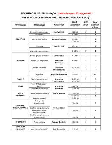 REKRUTACJA UZUPEŁNIAJĄCA / zaktualizowano 20 lutego 2017 / WYKAZ WOLNYCH MIEJSC W POSZCZEGÓLNYCH GRUPACH ZAJĘĆ Forma zajęć PLASTYKA Wiek uczestnika Ilość grup Ilość wolnych miejsc Jan Wiślicki 8-20 lat 7-20 lat 2 1 1 1 Witraż i ceramika Tadeusz Jończyk 7-10 lat 11-15 lat 2 3 1 Plastyka Paweł Zaraś 6-9 lat 2 1 6-10 lat 2 0 Rodzaj zajęć Nauczyciel Rysunek, malarstwo, ceramika warsztaty ceramiczne Nauka gry na pianinie Anna Ramos 7-18 lat 2 0 Nauka gry na gitarze Wiesław Koczywąs 8-20 lat 2 0 Studio Piosenki Wojciech Wielechowski 10-20 lat 1 0 Rytmika Krystyna Zaremba 3-latki 1 0 TANIEC Taniec nowoczesny Stanisław Skibniewski 10-13 lat 15-20 lat 2 0 0 TEATR Teatr Młodzieżowy „PARK” Warsztaty teatralne Stanisław Dembski 16-20 lat 13-18 lat 1 1 0 0 średniozaawansowany Janusz Tryzno 11-15 lat 13-20 lat 13-20 lat 1 1 1 0 0 7-20 lat 1 0 7-20 lat 1 0 7-20 lat 2 MUZYKA JĘZYK NIEMIECKI GRAFIKA KOMPUTEROWA zaawansowany Fotografia i multimedia Grafika komputerowa i tworzenie stron internetowych Grafika komputerowa i multimedia Dariusz Zaraś SPORTOWE Tenis stołowy Andrzej Zieliński 8-20 lat 1 0 EKOLOGIA I ZABAWA „W krainie fantazji” Ewa Zawadzka 4- 5 lat 1 0 0
