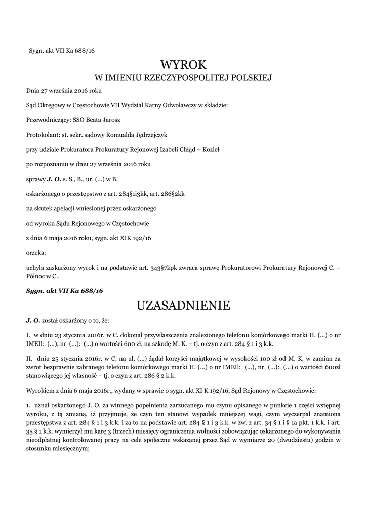 Sygn. akt VII Ka 688/16 WYROK W IMIENIU RZECZYPOSPOLITEJ POLSKIEJ Dnia 27 września 2016 roku Sąd Okręgowy w Częstochowie VII Wydział Karny Odwoławczy w składzie: Przewodniczący: SSO Beata Jarosz Protokolant: st. sekr. sądowy Romualda Jędrzejczyk przy udziale Prokuratora Prokuratury Rejonowej Izabeli Chłąd – Kozieł po rozpoznaniu w dniu 27 września 2016 roku sprawy J. O. s. S., B., ur. (...) w B. oskarżonego o przestępstwo z art. 284§1i3kk, art. 286§2kk na skutek apelacji wniesionej przez oskarżonego od wyroku Sądu Rejonowego w Częstochowie z dnia 6 maja 2016 roku, sygn. akt XIK 192/16 orzeka: uchyla zaskarżony wyrok i na podstawie art. 343§7kpk zwraca sprawę Prokuratorowi Prokuratury Rejonowej C. – Północ w C.. Sygn. akt VII Ka 688/16 UZASADNIENIE J. O. został oskarżony o to, że: I. w dniu 23 stycznia 2016r. w C. dokonał przywłaszczenia znalezionego telefonu komórkowego marki H. (...) o nr IMEIl: (...), nr (...): (...) o wartości 600 zł. na szkodę M. K. – tj. o czyn z art. 284 § 1 i 3 k.k. II. dniu 25 stycznia 2016r. w C. na ul. (...) żądał korzyści majątkowej w wysokości 100 zł od M. K. w zamian za zwrot bezprawnie zabranego telefonu komórkowego marki H. (...) o nr IMEIl: (...), nr (...): (...) o wartości 600zł stanowiącego jej własność – tj. o czyn z art. 286 § 2 k.k. Wyrokiem z dnia 6 maja 2016r., wydany w sprawie o sygn. akt XI K 192/16, Sąd Rejonowy w Częstochowie: 1. uznał oskarżonego J. O. za winnego popełnienia zarzucanego mu czynu opisanego w punkcie 1 części wstępnej wyroku, z tą zmianą, iż przyjmuje, że czyn ten stanowi wypadek mniejszej wagi, czym wyczerpał znamiona przestępstwa z art. 284 § 1 i 3 k.k. i za to na podstawie art. 284 § 1 i 3 k.k. w zw. z art. 34 § 1 i § 1a pkt. 1 k.k. i art. 35 § 1 k.k. wymierzył mu karę 3 (trzech) miesięcy ograniczenia wolności zobowiązując oskarżonego do wykonywania nieodpłatnej kontrolowanej pracy na cele społeczne wskazanej przez Sąd w wymiarze 20 (dwudziestu) godzin w stosunku miesięcznym; 2. uznał oskarżonego J. O. za winnego popełnienia zarzucanego mu czynu opisanego w punkcie 2 części wstępnej wyroku, wyczerpującego znamiona przestępstwa z art. 286 § 2 k.k. i za to na podstawie art. 286 § 2 k.k. w zw. z art. 34 § 1 i § 1a pkt. 1 k.k. i art. 35 § 1 k.k. przy zast. art. 37a k.k. wymierzył mu karę 5 (pięciu) miesięcy ograniczenia wolności zobowiązując oskarżonego do wykonywania nieodpłatnej kontrolowanej pracy na cele społeczne wskazanej przez Sąd w wymiarze 20 (dwudziestu) godzin w stosunku miesięcznym; 3. na mocy art. 85 § 1 k.k. i art. 85a k.k. oraz art. 86 § 3 k.k. połączył orzeczone w punktach 1 i 2 wyroku kary ograniczenia wolności i wymierzył mu karę łączną ograniczenia wolności w wymiarze 6 (sześciu) miesięcy zobowiązując oskarżonego do wykonywania nieodpłatnej kontrolowanej pracy na cele społeczne wskazanej przez Sąd w wymiarze 20 (dwudziestu) godzin w stosunku miesięcznym; 4. na mocy art. 63 § 1 k.k. na poczet orzeczonej kary łącznej ograniczenia wolności zaliczył oskarżonemu okres zatrzymania w dniu 25.01.2016 roku przyjmując, że jeden dzień zatrzymania równy jest dwóm dniom kary ograniczenia wolności; 5. na podstawie art. 627 k.p.k. i art. 2 ust. 1 pkt. 1 i ust. 2 ustawy z dnia 23.06.1973r. o opłatach w sprawach karnych zasądził od oskarżonego na rzecz Skarbu Państwa opłatę w kwocie 60 (sześćdziesięciu) złotych oraz wydatki w kwocie 70 (siedemdziesięciu) złotych. Osobistą apelację w sprawie złożył oskarżony (tytułując ją mylnie jako zażalenie). Podał, że nie zgadza się z zapadłym wyrokiem, gdyż znalazł on telefon komórkowy i chciał go oddać. Nadto wskazał, że jest wdowcem i że jego pracodawca nie pozwoli mu na nie pracowanie w jednym miesiącu przez tyle godzin, a ma na utrzymaniu nieletniego syna. Nałożenie obowiązku wykonywania pracy wiązałoby się dla niego z utratą posiadanej pracy. Dodał, że nie był nigdy karany. Wniósł o złagodzenie wyroku. Sąd Okręgowy zważył, co następuje: Apelacja wniesiona w sprawie okazała się zasadna i skutkiem jej wniesienia było uchylenie zaskarżonego wyroku i zwrócenie sprawy Prokuratorowi Prokuratury Rejonowej C. – Północ w C.. Na wstępie zaznaczyć trzeba, że z treści apelacji wynika, że skarżący zarzuca wyrokowi naruszenie prawa materialnego, a także zrzut niewspółmierności orzeczonej kary. Skarżący nie zakwestionował on bowiem ustalonego stanu faktycznego sprawy. Podkreślił natomiast, że jego intencją było oddanie telefonu właścicielce, w istocie zatem podniósł zarzut naruszenia prawa materialnego, a to art. 284 § 1 i 3 k.k. i art. 286 § 2 k.k. Sąd Rejonowy ustalił w sprawie następujący stan faktyczny. M. K. utraciła należący do niej telefon komórkowy w nieznanych okolicznościach. Gdy zdała sobie z tego sprawę zaczęła wykonywać połączenia na swój numer telefonu, których jednak nikt nie odbierał, a po pewnym czasie połączenie zostało przerwane. M. K. zablokowała wtedy telefon komórkowy w sieci P.. Oskarżony J. O., który znalazł telefon uruchomił go następnego dnia i zadzwonił do mamy właścicielki. Powiedział że telefon znalazła jego żona oraz że chciałby go zwrócić właścicielce. Zaznaczył, że za zwrot telefonu oczekuje „niezłej sumki”. Oskarżony spotkał się z M. K. i zażądał 100 zł. Najpierw zaproponowała mu ona 50 zł, następnie 60 zł, a później dołożyła jeszcze monety. J. O. wziął 60 zł i w tym momencie funkcjonariusze Policji zatrzymali oskarżonego. Na podstawie powyższego, niekwestionowanego stanu faktycznego oskarżonemu przypisano popełnienie przestępstw z art. 284 § 1 i 3 k.k. oraz z art. 286 § 2 k.k., a więc przywłaszczenia rzeczy oraz żądania korzyści majątkowej w zamian za zwrot bezprawnie zabranej rzeczy. Przede wszystkim zauważyć należy, co było wystarczającą przyczyną 