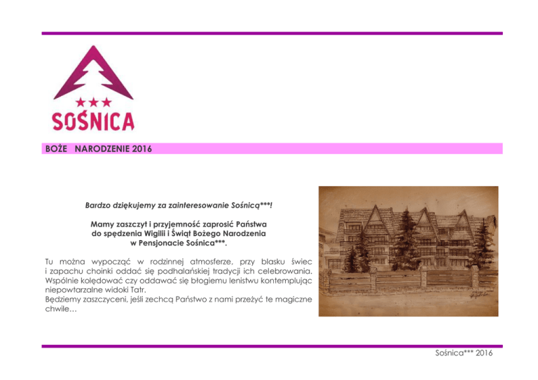 . BOŻE NARODZENIE 2016 Bardzo dziękujemy za zainteresowanie Sośnicą***! Mamy zaszczyt i przyjemność zaprosić Państwa do spędzenia Wigilii i Świąt Bożego Narodzenia w Pensjonacie Sośnica***. Tu można wypocząć w rodzinnej atmosferze, przy blasku świec i zapachu choinki oddać się podhalańskiej tradycji ich celebrowania. Wspólnie kolędować czy oddawać się błogiemu lenistwu kontemplując niepowtarzalne widoki Tatr. Będziemy zaszczyceni, jeśli zechcą Państwo z nami przeżyć te magiczne chwile… . Sośnica*** 2016 . UWAGI WSTĘPNE Wychodząc naprzeciw oczekiwaniom naszych zacnych Gości, przygotowaliśmy kompletny pakiet świąteczny, skierowany głównie do rodzin z dziećmi pragnących zarówno oddać się słodkiemu lenistwu jak i skorzystać z atrakcji okolicy. Dzięki naszemu zaangażowaniu sprawimy, że będzie to nie tylko możliwe, ale i absolutnie komfortowe! W sezonie zima 2016 / 2017 proponujemy unikalną atmosferę wspaniałych bezpiecznych chwil spędzanych w obiektach wypoczynkowych lat 80-tych. W historycznych pokojach i epokowych wnętrzach. Ale z najwyższej jakości obsługą i bogatym pakietem usług dodatkowych w nowej już bawialni czy stylowym nowoczesnym basenie z zapleczem SPA. Ten mix pozwoli nam zaspokoić zarówno zwolenników klasyki jak i poszukujących komfortu turystów. Ideą przyświecającą nam podczas tworzenia niniejszego pakietu była chęć zapewnienia maksymalnie kompleksowej obsługi ciągle zapracowanym rodzicom, dając im czas na odetchnięcie i nie zmuszając Ich do zajmowania się organizacją czasu dla całych rodzin podczas wakacji. A przy tym dostarczenie jak najszerszego wachlarza emocji dzieciom. Emocji rodem z Podhala! Zawarte w pakiecie elementy to starannie wyselekcjonowane tradycyjne podhalańskie i tatrzańskie atrakcje, zakładające zapoznanie naszych Gości z historią i kulturą regionu, podtrzymujące tradycje a i edukujące. . Sośnica*** 2016 . PROGRAM Dzień 1. 23.12.2016: Od godziny 15.00 możliwość zakwaterowania. Gorrrące przywitanie w podhalańskim stylu. Oscypki grillowane z żurawiną i przedni grzaniec podhalański na miłe rozpoczęcie wspólnej świątecznej przygody. 18:00 – 20:00 - obiadokolacja Po kolacji wszystkie dzieci, i nie tylko, zapraszamy do kina świątecznego. Korzystając z wielkoformatowego ekranu oraz profesjonalnego nagłośnienia, nie zapominając o popcornie, obejrzymy jeden z aktualnych hitów dziecięcych. Dla niezaineresowanych pokazem filmowym do dyspozycji nasz bar… . Sośnica*** 2016 . Dzień 2. 24.12.2016: 8:00 – 10:00 – śniadanie w formie bufetu 10:00 – 12:00 – strojenie choinki. Aby zbudować odpowiednią atmosferę, wszystkich chętnych zaprosimy do wspólnego dekorowania choinki. Zadbamy oczywiście o ozdoby, a także nastrój i ciepłe napoje. 12:00 – 13:00 – przekąska postna. Podhalański bufet serowy i moskole z masełkiem czosnkowym 14:00 – 16:00 – malowanie bombek. Wszyscy uczestnicy otrzymają bombki i farby, dla najlepszych oczekiwać będą nagrody. . Sośnica*** 2016 . 17:00 – Wieczerza Wigilijna. Z eklektycznym acz tradycyjnym menu, wyborem klasycznych potraw z różnych regionów Polski, bogatym bufetem domowych ciast i słodkości a także czymś na trawienie. Wspólne kolędowanie w klimacie góralskim i nie tylko, i ostatecznie prezentów pod choinką… Wspólne biesiadowanie do godziny 20.00. odwiedziny Mikołaja oraz szukanie 23:30 – dla chętnych transport na pasterkę do Sanktuarium Matki Boskiej Fatimskiej. . Sośnica*** 2016 . Dzień 3. 25.12.2016: 8:00 – 10:00 - śniadanie w formie bufetu 10:00 – 12:00 – pieczenie i dekoracja pierników. W pierwszej kolejności wspólne wyrabianie ciasta i wycinanie kształtów, w międzyczasie muzyka świąteczna i przerwa kawowa. Następnie dekoracja zgromadzonymi dodatkami i wyłonienie najlepszych cukierników. 12:00 – 13:00 – przekąska świąteczna. Tradycyjny bigos podhalski i bufet ciast świątecznych. 14:00 – 16:00 – rzeźbienie w lodzie. Dla każdej z rodzin przygotujemy odpowiedni blok śniegowo – lodowy i zestaw niezbędnych narzędzi. Po zmroku dodatkowo podświetlimy każdą z rzeźb i wyłonimy zwycięską rodzinę artystów. 18:00 – 20:00 – obiadokolacja Przy odrobine szczęścia podczas kolacji pojawią się kolędnicy. . Sośnica*** 2016 . Dzień 4. 26.12.2016: 8:00 – 10:00 – śniadanie w formie bufetu 10:00 – 12:00 – Wielka rodzinna wyprawa w głąb Tatr – do Doliny Ku Dziurze. Połączona z animacjami dla dzieci i zakończona odwiedzinami w jaskini zbójnika Wojtka … 12:00 – 13:00 – przekąska świąteczna. placki po harnasiowemu 16:00 – 18:00 – świąteczny kulig z pochodniami i gorącym grzańcem. W wypadku braku sprzyjającej aury przejazd wozami drabiniastymi po Zakopanem. 18:00 – 20:00 – obiadokolacja . Sośnica*** 2016 . Dzień 5. 27.12.2016: 8:00 –10:00 – śniadanie w formie bufetu Do godziny 11:00 wykwaterowanie. Na drogę kawa i ciasto świąteczne. . Sośnica*** 2016 . CENNIK osoba dorosła pierwsze dziecko do lat 5 Kolejne dziecko do lat 5 (maksymalnie 2) Dziecko 5 – 12 lat Dziecko 12 – 18 lat 1588,00 PLN 50,00 PLN* 290,00 PLN* 390,00 PLN 490,00 PLN *przy minimum dwóch pełnopłatnych osobach w pokoju Cena zawiera: 4 noclegi; 4 x śniadania bufetowe; 3 x obiadokolacje; Przywitanie oscypkiem i grzańcem; Przekąska postna; Przekąska świąteczna x 2; Uroczysta kolacja Wigilijna z Mikołajem; Animacje wg programu; Drobne prezenty; basen; siłownię; saunę; parking; wifi; opłatę klimatyczną (2 PLN za osobę za dobę); pakiet dostępny w okresie od 23.12.2016 do 27.12.2016 po uprzednim potwierdzeniu dostępności; Ceny obowiązują w wypadku wykupienia pakietu wg powyższego programu; Istnieje możliwość skorzystania z pakietu przy mniejszej/większej ilości dni pobytu. Cena do ustalenia indywidualnie; . Sośnica*** 2016 . Dodatkowe rabaty dla osób pozostających dłużej niż 4 doby; Żaden