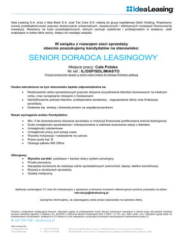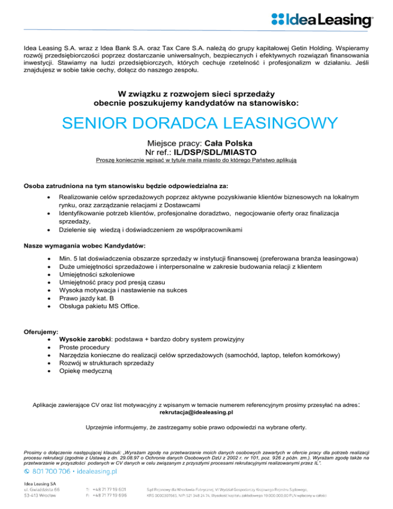 Idea Leasing S.A. wraz z Idea Bank S.A. oraz Tax Care S.A. należą do grupy kapitałowej Getin Holding. Wspieramy rozwój przedsiębiorczości poprzez dostarczanie uniwersalnych, bezpiecznych i efektywnych rozwiązań finansowania inwestycji. Stawiamy na ludzi przedsiębiorczych, których cechuje rzetelność i profesjonalizm w działaniu. Jeśli znajdujesz w sobie takie cechy, dołącz do naszego zespołu. W związku z rozwojem sieci sprzedaży obecnie poszukujemy kandydatów na stanowisko: SENIOR DORADCA LEASINGOWY Miejsce pracy: Cała Polska Nr ref.: IL/DSP/SDL/MIASTO Proszę koniecznie wpisać w tytule maila miasto do którego Państwo aplikują Osoba zatrudniona na tym stanowisku będzie odpowiedzialna za: Realizowanie celów sprzedażowych poprzez aktywne pozyskiwanie klientów biznesowych na lokalnym rynku, oraz zarządzanie relacjami z Dostawcami Identyfikowanie potrzeb klientów, profesjonalne doradztwo, negocjowanie oferty oraz finalizacja sprzedaży, Dzielenie się wiedzą i doświadczeniem ze współpracownikami Nasze wymagania wobec Kandydatów: Min. 5 lat doświadczenia obszarze sprzedaży w instytucji finansowej (preferowana branża leasingowa) Duże umiejętności sprzedażowe i interpersonalne w zakresie budowania relacji z klientem Umiejętności szkoleniowe Umiejętność pracy pod presją czasu Wysoka motywacja i nastawienie na sukces Prawo jazdy kat. B Obsługa pakietu MS Office. Oferujemy: Wysokie zarobki: podstawa + bardzo dobry system prowizyjny Proste procedury Narzędzia konieczne do realizacji celów sprzedażowych (samochód, laptop, telefon komórkowy) Rozwój w strukturach sprzedaży Opiekę medyczną Aplikacje zawierające CV oraz list motywacyjny z wpisanym w temacie numerem referencyjnym prosimy przesyłać na adres : [email protected] Uprzejmie informujemy, że zastrzegamy sobie prawo odpowiedzi na wybrane oferty. Prosimy o dołączenie następującej klauzuli: „Wyrażam zgodę na przetwarzanie moich danych osobowych zawartych w ofercie pracy dla potrzeb realizacji procesu rekrutacji (zgodnie z Ustawą z dn. 29.08.97 o Ochronie danych Osobowych DzU z 2002 r. nr 101, poz. 926 z późn. zm.). Wyrażam zgodę także na przetwarzanie w przyszłości podanych w CV danych w celu związanym z przyszłymi procesami rekrutacyjnymi realizowanymi przez IL”.