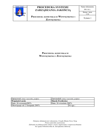 PROCEDURA SYSTEMU ZARZĄDZANIA JAKOŚCIĄ Urząd Miasta Nowy Targ Numer dokumentu: PW-10.1. Strona / stron 1/10 PROCEDURA KOMUNIKACJI WEWNĘTRZNEJ I ZEWNĘTRZNEJ PROCEDURA KOMUNIKACJI WEWNĘTRZNEJ I ZEWNĘTRZNEJ Opracował: (imię i nazwisko, podpis) Wojciech Lorek Data: 26 wrzesnia2007r. Obowiązuje od: 2 listopada 2007r. Zatwierdził: (imię i nazwisko, podpis) Marek Fryźlewicz Data: 26 września 2007r. Nr egz.: Niniejszy dokument jest własnością Urzędu Miasta Nowy Targ. Prawa autorskie zastrzeżone. Zabrania się dokonywania zmian w treści, kopiowania i rozpowszechniania bez zgody Pełnomocnika ds. Zarządzania Jakością Wydanie: I PROCEDURA SYSTEMU ZARZĄDZANIA JAKOŚCIĄ Urząd Miasta Nowy Targ Numer dokumentu: PW-10.1. Strona / stron 2/10 PROCEDURA KOMUNIKACJI WEWNĘTRZNEJ I ZEWNĘTRZNEJ Wydanie: I KARTA ZMIAN Lp. Wprowadzono Anulowano Data zmiany Wprowadzający zmianę ROZDZIELNIK Lp. 1. 2. 3. 4. 5. 6. 7. 8. 9. 1 0. 1 1. 1 2. 1 3. 1 4. 1 5. 1 Otrzymujący procedurę Pełnomocnik ds. Zarządzania Jakością Burmistrz Miasta Zastępca Burmistrza Zastępca Burmistrza Skarbnik Miasta Naczelnik Wydziału Gospodarki Nieruchomościami i Planowania Przestrzennego Naczelnik Wydziału Organizacyjnego Naczelnik Wydziału Gospodarki Komunalnej i Drogownictwa Naczelnik Wydziału Rozwoju i Inwestycji Naczelnik Wydziału Infrastruktury Społecznej i Promocji Nr egz. 1 2 3 4 5 6 7 8 9 10 Naczelnik Wydziału Spraw Obywatelskich 11 Naczelnik Wydziału Oświaty 12 Kierownik Urzędu Stanu Cywilnego 13 Kierownik Referatu d.s. Zamówień Publicznych Kierownik Referatu d.s. Ochrony Środowiska Audytor Wewnętrzny Data otrzymania 14 15 16 Niniejszy dokument jest własnością Urzędu Miasta Nowy Targ. Prawa autorskie zastrzeżone. Zabrania się dokonywania zmian w treści, kopiowania i rozpowszechniania bez zgody Pełnomocnika ds. Zarządzania Jakością Podpis PROCEDURA SYSTEMU ZARZĄDZANIA JAKOŚCIĄ Urząd Miasta Nowy Targ Numer dokumentu: PW-10.1. Strona / stron 3/10 PROCEDURA KOMUNIKACJI WEWNĘTRZNEJ I ZEWNĘTRZNEJ 1 Pełnomocnik d.s. Rozwoju Lokalnego 7. 1 Komendant Straży Miejskiej 8. 1 Przewodniczący Rady Miasta 9. Wydanie: I 17 18 19 SPIS TREŚCI 1. CEL I PRZEDMIOT PROCEDURY.................................................................................................................... 4 2. ZAKRES OBOWIĄZYWANIA...........................................................................................................................4 3. TERMINOLOGIA I SKRÓTY............................................................................................................................. 4 4. WŁAŚCICIEL PROCEDURY............................................................................................................................. 5 5. ODPOWIEDZIALNOŚĆ I KOMPETENCJE...................................................................................................... 5 6. SZCZEGÓŁOWE ZASADY POSTĘPOWANIA................................................................................................ 6 6.1. Postanowienia ogólne...................................................................................................... 6 6.2. Komunikacja wewnętrzna................................................................................................6 6.3. Komunikacja zewnętrzna................................................................................................. 7 6.3.1. Komunikacja zewnętrzna Urząd – Klient (pośrednia).............................................. 7 6.3.2. Komunikacja zewnętrzna Urząd – Klient (bezpośrednia)........................................ 8 6.3.3. Komunikacja zewnętrzna Klient – Urząd (skargi i wnioski Klientów).................... 9 6.4. Inne formy komunikacji...................................................................................................9 7. ZAPISY................................................................................................................................................................. 9 8. WYKAZ FORMULARZY I ZAŁĄCZNIKÓW...................................................................................................9 9. DOKUMENTY ZWIĄZANE............................................................................................................................. 10 Niniejszy dokument jest własnością Urzędu Miasta Nowy Targ. Prawa autorskie zastrzeżone. Zabrania się dokonywania zmian w treści, kopiowania i rozpowszechniania bez zgody Pełnomocnika ds. Zarządzania Jakością PROCEDURA SYSTEMU ZARZĄDZANIA JAKOŚCIĄ Urząd Miasta Nowy Targ 1. Numer dokumentu: PW-10.1. Strona / stron 4/10 PROCEDURA KOMUNIKACJI WEWNĘTRZNEJ I ZEWNĘTRZNEJ Wydanie: I CEL I PRZEDMIOT PROCEDURY Niniejszą procedurą Burmistrz Miasta Nowy Targ określa obowiazujące zasady komunikacji wewnątrz urzędu, umozliwiające przekazywanie informacji niezbędnych do prawidłowego funkcjonowania Urzędu oraz jak najlepszego wykonywania zadań przez pracowników. Procedura okresla również formy komunikacji zewnętrznej polegajacej na przekazywaniu informacji do społeczności lokalnej dla zapewnienia własciwego dostępu do informacji oraz możliwości zgłaszania wniosków, postulatów, uwag oraz skarg. 2. ZAKRES OBOWIĄZYWANIA Niniejsza procedura obowiązuje wszystkich pracowników Urzędu Miasta Nowy Targ. 3. TERMINOLOGIA I SKRÓTY UMNT – Urząd Miasta Nowy Targ. BOM – Biuro Obsługi Mieszkańców. BIP – Biuletyn Informacji Publicznej. JRWA – Jednolity Rzeczowy Wykaz Akt. Komunikacja – proces polegający na odbieraniu, przetwarzaniu i przesyłaniu informacji od i do Klienta. Komunikacja pionowa – przepływ informacji niezbędnej do wzajemnego zaspokojenia potrzeb informacyjnych kierowników (decydentów ) i wykonawców (urzędników na niższych szczeblach). Komunikacja pozioma – przepływ informacji między komórkami realizującymi zadania. Klient – osoby fizyczne, osoby prawne i in