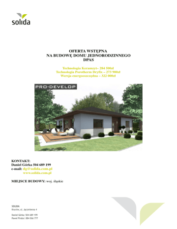 OFERTA WSTĘPNA NA BUDOWĘ DOMU JEDNORODZINNEGO DPAS Technologia Keramzyt– 284 500zł Technologia Porotherm Dryfix – 273 900zł Wersja energooszczędna – 322 000zł KONTAKT: Daniel Górka 504 689 199 e-mail: [email protected] www.solida.com.pl MIEJSCE BUDOWY: woj. śląskie Zalety naszej oferty, które mogą zadecydować o podjęciu przez Państwa decyzji o rozpoczęciu własnej inwestycji to: • • • • fachowa obsługa i doradztwo techniczne profesjonalne, sprawne i sprawdzone ekipy budowlane terminowe rozpoczęcie i zakończenie prac budowlanych na życzenie klienta, pomoc w wyborze projektu tak, aby był on zgodny z wyznaczonym budżetem na budowę domu. WARUNKI REALIZACJI W cenie budowy zostały ujęte: • prowadzenie dokumentacji budowlanej, • nadzór Kierownika Budowy, • wywóz nieczystości. Podane ceny są cenami netto (należy doliczyć 8% VAT). PŁYTA FUNDAMENTOWA Zakres prac obejmuje: · badanie geotechniczne gruntu, · wytyczenie geodezyjne budynku, · wykonanie projektu zamiennego płyty fundamentowej, · usunięcie warstwy nienośnej gruntu o grubości 30 cm z odwozem do 20 m, · wykonanie odpowiednio zagęszczonej podbudowy płyty fundamentowej z podsypki żwirowo -piaskowej (zgodnie z projektem płyty) w uprzednio przygotowanym wykopie, · wykonanie podkładu z chudego betonu, · wykonanie izolacji przeciwwilgociowej z podwójnej warstwy folii ochronnej, · wykonanie zewnętrznego krawędziowego docieplenia płyty ze styropianu EPS 200 o grub. 10 cm, · wykonanie zewnętrznego obwodowego docieplenia (opaski) płyty ze styropianu EPS 200 o grub. 10 cm, · wykonanie uszczelnienia styropianowych elementów brzegowych pianką uszczelniającą, · ułożenie podejść kanalizacyjnych (do 5szt.) i wyprowadzenie instalacji kanalizacyjnej poza obręb płyty (ok.1,0m), · ułożenie i wyprowadzenie instalacji powietrznej kominka poza obręb płyty (1 szt.), · ułożenie i wyprowadzenie przepustu instalacji przyłącza wody w płycie wraz z wyprowadzeniem instalacji poza obręb płyty (1 szt.), · ułożenie i wyprowadzenie przepustu instalacji elektrycznej i multimedialnej w płycie (1 szt.), · wbudowanie betonu za pomocą pompy, · zawibrowanie powierzchni listwą wibracyjną i wyrównanie powierzchni płyty fundamentowej; · pielęgnacja płyty poprzez zabezpieczenie folią (zależnie od warunków atmosferycznych) Do oferty przyjęto posadowienie płyty na gruntach zaliczanych do I kategorii geotechnicznej. Nie uwzględniono zabezpieczeń na szkody górnicze. Przyjęto 50 cm grubości podbudowy pod fundamentem, w przypadku warunków gruntowych wymagających grubszej podbudowy, np. na skutek znacznego nachylenia terenu, koszty etapu mogą wzrosnąć. Koszt dodatkowej podbudowy 75zł/m3. ŚCIANY ZEWNĘTRZNE i WEWNĘTRZNE Zakres prac obejmuje: · adaptacja ścian do projektu budowlanego, · prefabrykacja ścian wraz z transportem na plac budowy, · montaż prefabrykatów, · zazbrojenie konstrukcji wraz z wypełnieniem zamków betonem C16/20, · wykonanie kosmetyki połączeń (wykonywana po zamknięciu budynku). GWARANCJA NA ŚCIANY 50 LAT DACH WRAZ Z ORYNNOWANIEM, KOMINY SPALINOWE I WENTYLACYJNE Zakres prac obejmuje: · wykonanie konstrukcji drewnianej dachu · pokrycie połaci folią dachową, łacenie, · wykonanie przewodów spalinowych (2 sztuki – do kotła i kominka) i wentylacyjnych z systemowych kształtek kominowych SCHIEDEL i kominków wentylacyjnych DuroVent, · wykonanie czapek kominowych, · wykończenie kominów płytkami klinkierowymi ponad połacią dachu, · pokrycie dachówką cementową BRAAS, typ Celtycka w jednym z 5 podstawowych kolorów, · obróbki: wykonanie koszy, pasa nadrynnowego i opierzenia komina, · montaż ławy kominiarskiej i wyłazu dachowego wg projektu, · orynnowanie z PCV w jednym z podstawowych kolorów oferowanych przez producenta oraz montaż rur spustowych pionowych, zakończonych na dole kolanem jednokielichowym, · wykonanie podbitek z listew drewnianych sosnowych lub świerkowych, malowanych gr. 12 mm. (wykonywane na etapie elewacji ) PRODUCENT UDZIELA 30 LETNIEJ GWARANCJI NA DACHÓWKĘ. DACH WYKONANY NA PEŁNYM SYSTEMIE BRAAS (bez zamienników). Zakres prac nie obejmuje odprowadzenia deszczówki spod rur spustowych. STOLARKA OKIENNA Z PVC Zakres prac obejmuje: · dostawa i montaż okien według projektu: stolarka okienna PVC firmy EUROCOLOR, w kolorze 1-str okleinowanym: profil 7-komorowy, DRZWI ZEWNĘTRZNE Zakres prac obejmuje: · dostawa i montaż drzwi wejściowych PVC EUROCOLOR U=0,7, z pełnym wyposażeniem, kolorystyka wg palety producenta (wymiary standardowe, bez doświetleń bocznych i górnych). INSTALACJA WOD-KAN Zakres prac obejmuje: · wykonanie podejść kanalizacyjnych i wodociągowych wg projektu za wodomierzem, wewnątrz budynku rurami PP i PCV. Uwaga: Zakres prac nie obejmuje wykonania przyłącza wody do budynku oraz „białego montażu”. INSTALACJA ELEKTRYCZNA I TELETECHNICZNA Zakres prac obejmuje: · wykonanie punktów instalacji elektrycznej (gniazd 230v) wewnątrz budynku wg projektu, · wykonanie punktów instalacji oświetlenia wewnątrz budynku wg projektu, · wyprowadzenie instalacji pod dzwonek · wykonanie w obrębie domu instalacji telewizyjnej i teletechnicznej 4 punkty wraz z wyprowadzeniem na zewnątrz budynku · wykonanie jednego gniazda siłowego 400V zabezpieczonego samodzielnie, · dodatkowe zabezpieczenie kuchni, łazienek, garażu linką 4 mm2 (listwa ekwipotencjalna) · wykonanie uziemienia instalacji za pomocą bednarki lub szpilki uziemiającej, · wykonanie tablicy bezpiecznikowej (wyłączniki różnicowoprądowe- 2 szt., zabezpieczenie nadprądowe -1 szt. na max. 8 punktów) Wycena obejmuje osprzęt firmy MOELLER lub LEGRAND. Zakres prac nie obejmuje wykonania przyłącza energii elektrycznej do budynku oraz przyłącza telefonii oraz „białego montażu”. Zakres prac nie obejmuje wykonania instalacji odgromowej. INSTALACJA C.O. Zakres prac obejmuje: · wykonanie