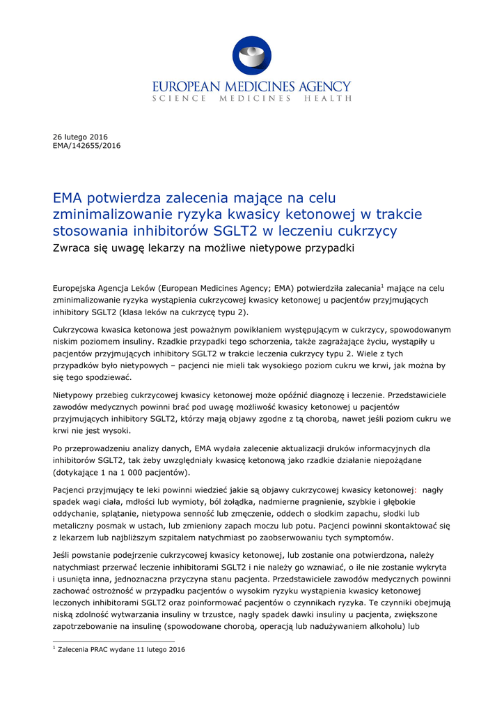 26 lutego 2016 EMA/142655/2016 EMA potwierdza zalecenia mające na celu zminimalizowanie ryzyka kwasicy ketonowej w trakcie stosowania inhibitorów SGLT2 w leczeniu cukrzycy Zwraca się uwagę lekarzy na możliwe nietypowe przypadki Europejska Agencja Leków (European Medicines Agency; EMA) potwierdziła zalecania1 mające na celu zminimalizowanie ryzyka wystąpienia cukrzycowej kwasicy ketonowej u pacjentów przyjmujących inhibitory SGLT2 (klasa leków na cukrzycę typu 2). Cukrzycowa kwasica ketonowa jest poważnym powikłaniem występującym w cukrzycy, spowodowanym niskim poziomem insuliny. Rzadkie przypadki tego schorzenia, także zagrażające życiu, wystąpiły u pacjentów przyjmujących inhibitory SGLT2 w trakcie leczenia cukrzycy typu 2. Wiele z tych przypadków było nietypowych – pacjenci nie mieli tak wysokiego poziom cukru we krwi, jak można by się tego spodziewać. Nietypowy przebieg cukrzycowej kwasicy ketonowej może opóźnić diagnozę i leczenie. Przedstawiciele zawodów medycznych powinni brać pod uwagę możliwość kwasicy ketonowej u pacjentów przyjmujących inhibitory SGLT2, którzy mają objawy zgodne z tą chorobą, nawet jeśli poziom cukru we krwi nie jest wysoki. Po przeprowadzeniu analizy danych, EMA wydała zalecenie aktualizacji druków informacyjnych dla inhibitorów SGLT2, tak żeby uwzględniały kwasicę ketonową jako rzadkie działanie niepożądane (dotykające 1 na 1 000 pacjentów). Pacjenci przyjmujący te leki powinni wiedzieć jakie są objawy cukrzycowej kwasicy ketonowej: nagły spadek wagi ciała, mdłości lub wymioty, ból żołądka, nadmierne pragnienie, szybkie i głębokie oddychanie, splątanie, nietypowa senność lub zmęczenie, oddech o słodkim zapachu, słodki lub metaliczny posmak w ustach, lub zmieniony zapach moczu lub potu. Pacjenci powinni skontaktować się z lekarzem lub najbliższym szpitalem natychmiast po zaobserwowaniu tych symptomów. Jeśli powstanie podejrzenie cukrzycowej kwasicy ketonowej, lub zostanie ona potwierdzona, należy natychmiast przerwać leczenie inhibitorami SGLT2 i nie należy go wznawiać, o ile nie zostanie wykryta i usunięta inna, jednoznaczna przyczyna stanu pacjenta. Przedstawiciele zawodów medycznych powinni zachować ostrożność w przypadku pacjentów o wysokim ryzyku wystąpienia kwasicy ketonowej leczonych inhibitorami SGLT2 oraz poinformować pacjentów o czynnikach ryzyka. Te czynniki obejmują niską zdolność wytwarzania insuliny w trzustce, nagły spadek dawki insuliny u pacjenta, zwiększone zapotrzebowanie na insulinę (spowodowane chorobą, operacją lub nadużywaniem alkoholu) lub 1 Zalecenia PRAC wydane 11 lutego 2016 okoliczności, które mogą prowadzić do ograniczenia przyjmowanej żywności lub do poważnego odwodnienia. Dodatkowo, EMA zaleca tymczasowe zaprzestanie podawania inhibitorów SGLT2 pacjentom przechodzącym poważne operacje lub znajdującym się w szpitalu ze względu na poważną chorobę. Na koniec, EMA przypomina przedstawicielom zawodów medycznych, że inhibitory SGLT2 nie są dopuszczone do leczenia cukrzycy typu 1, zwracając uwagę, że przypadki kwasicy ketonowej występowały w przypadku podawania leku poza wskazaniami i w badaniach klinicznych w przypadkach cukrzycy typu 1. Korzyści ze stosowania tych leków nadal przeważają nad ryzykiem w leczeniu cukrzycy typu 2. Zalecenia EMA opierają się na wstępnym przeglądzie przeprowadzonym prze Komitet ds. Oceny Ryzyka w Ramach Nadzoru nad Bezpieczeństwem Farmakoterapii (Pharmacovigilance Risk Assessment Committee; PRAC). Zalecenia przesłano Komitetowi ds. Produktów Leczniczych Stosowanych u Ludzi (Committee for Medicinal Products for Human Use; CHMP), który potwierdził je i wydał ostateczną opinię Agencji. Opinia CHMP zostanie przekazana Komisji Europejskiej w celu podjęcia decyzji obwiązującej we wszystkich państwach członkowskich UE. Informacje dla pacjentów • Rzadkie przypadki cukrzycowej kwasicy ketonowej wystąpiły u osób z cukrzycą typu 2 przyjmujących inhibitory SGLT2. • Cukrzycowa kwasica ketonowa jest poważnym powikłaniem choroby cukrzycowej. Objawy obejmują utratę wagi ciała, mdłości i wymioty, ból żołądka, nadmierne pragnienie, szybie i głębokie oddychanie, nadzwyczajną senność lub zmęczenie, oddech o słodkim zapachu, słodki lub metaliczny posmak w ustach, lub zmianę zapachu moczu lub potu. • Niektóre przypadki cukrzycowej kwasicy ketonowej u osób przyjmujących inhibitory SGLT2 nie wykazały wysokiego poziomu cukru we krwi, co zazwyczaj jest łączone z tym stanem. • W przypadku wystąpienia któregokolwiek z powyższych objawów w trakcie przyjmowania inhibitorów SGLT2, należy natychmiast skontaktować się z lekarzem lub najbliższym szpitalem, nawet jeśli poziom cukru nie jest szczególnie wysoki. Może być konieczne leczenie ratunkowe i może być konieczna zmiana leków przeciwcukrzycowych. • Inhibitory SGLT2 w UE są dostępne pod następującymi nazwami: Ebymect, Edistride, Forxiga, Invokana, Jardiance, Synjardy, Vokanamet i Xigduo. Informacje dla przedstawicieli zawodów medycznych • U pacjentów przyjmujących inhibitory SGLT2 w leczeniu cukrzycy typu 2 wystąpiły rzadkie przypadki cukrzycowej kwasicy ketonowej, włącznie z zagrożeniem życia. Niektóre z tych przypadków były nietypowe, kiedy u pacjentów występowało tylko nieznaczne podwyższenie poziomu cukru we krwi, a niektóre z nich miały miejsce w czasie stosowania poza wskazaniami i w trakcie badań klinicznych u pacjentów z cukrzycą typu 1. • Zawsze należy brać pod uwagę możliwość cukrzycowej kwasicy ketonowej u pacjentów przyjmujących inhibitory SGLT2, u których występują nieswoiste objawy takie jak mdłości, wymiotowanie, anoreksja, ból brzucha, nadmierne pragnienie, trudności w oddychaniu, splątanie, zmęczenie lub senność. • Pacjentów należy poinformować o oznakach i objawach cukrzycowej kwasicy ketonowej i wskazać im