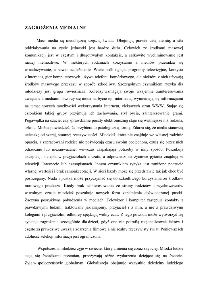ZAGROśENIA MEDIALNE Mass media są nieodłączną częścią świata. Obejmują prawie całą ziemię, a siła oddziaływania na Ŝycie jednostki jest bardzo duŜa. Człowiek ze środkami masowej komunikacji jest w częstym i długotrwałym kontakcie, a całkowite wyeliminowanie jest raczej niemoŜliwe. W niektórych rodzinach korzystanie z mediów przeradza się w naduŜywanie, a nawet uzaleŜnienie. Wiele osób ogląda programy telewizyjne, korzysta z Internetu, gier komputerowych, uŜywa telefonu komórkowego, ale niektóre z nich uŜywają środków masowego przekazu w sposób szkodliwy. Szczególnym czynnikiem ryzyka dla młodzieŜy jest grupa rówieśnicza. Koledzy wzmagają swoje wzajemne zainteresowania związane z mediami. Tworzy się moda na bycie np. internautą, wymieniają się informacjami na temat nowych moŜliwości wykorzystania Internetu, ciekawych stron WWW. Stając się członkiem takiej grupy przyjmują ich zachowania, styl bycia, zainteresowanie grami. Pogawędka na czacie, czy sprawdzanie poczty elektronicznej staje się waŜniejsze niŜ rodzina, szkoła. MoŜna powiedzieć, Ŝe przybiera to patologiczną formę. Zdarza się, Ŝe media stanowią ucieczkę od szarej, smutnej rzeczywistości. MłodzieŜ, która nie znajduje we własnej rodzinie oparcia, a zapracowani rodzice nie poświęcają czasu swoim pociechom, czują się przez nich odrzucane lub niezauwaŜane, wówczas zaspakajają potrzeby w inny sposób. Poszukują akceptacji i ciepła w przyjaciołach z czatu, a odpowiedzi na Ŝyciowe pytania znajdują w telewizji, Internecie lub czasopismach. Innym czynnikiem ryzyka jest zaniŜone poczucie własnej wartości i brak samoakceptacji. W sieci kaŜdy moŜe się przedstawić tak jak chce być postrzegany. Nuda i pustka moŜe przyczyniać się do szkodliwego korzystania ze środków masowego przekazu. Kiedy brak zainteresowania ze strony rodziców i wychowawców w wolnym czasie młodzieŜ poszukuje nowych form zapełnienia doświadczanej pustki. Zaczyna poszukiwać pobudzenia w mediach. Telewizor i komputer zastępują kontakty z prawdziwymi ludźmi, traktowany jak znajomy, przyjaciel i z nim, a nie z prawdziwymi kolegami i przyjaciółmi odbiorcy spędzają wolny czas. Z tego powodu moŜe wytworzyć się sytuacja zagroŜenia szczególnie dla dzieci, gdyŜ one nie potrafią racjonalizować faktów i często za prawdziwe uwaŜają zdarzenia filmowe a nie realny rzeczywisty świat. PoniewaŜ ich zdolność selekcji informacji jest ograniczona. Współczesna młodzieŜ Ŝyje w świecie, który zmienia się coraz szybciej. Młodzi ludzie stają się świadkami przemian, przeŜywają róŜne wydarzenia dziejące się na świecie. śyją w społeczeństwie globalnym. Globalizacja obejmuje wszystkie dziedziny ludzkiego Ŝycia, jednym z najistotniejszych czynników jest zmiana społeczna i kulturowa wynikająca z gwałtownego rozwoju technologii, w szczególności informacyjnej, rozwoju nowych elektronicznych mediów i multimediów. Charakter i nowy wymiar środowiska, w którym Ŝyje dziś młodzieŜ polska wyznaczają dziś media. Kontakt dzieci i młodzieŜy z telewizją, komputerem, Internetem ma charakter codzienny i często wielogodzinny. Media elektroniczne wypełniają im czas wolny i często teŜ czas zajęć obowiązkowych. Przekazy medialne, które młodzieŜ odbiera charakteryzują się zróŜnicowaną tematyką ze względu na treści oraz formy przekazu. Nowa jakość Ŝycia młodzieŜy związana jest z moŜliwością korzystania przez nią z komputera, Internetu, telefonu komórkowego, rzeczywistości wirtualnej, telewizji. Cechą charakterystyczną relacji człowiek - komputer jest to, Ŝe nie tylko człowiek odpowiada na sygnały komputera, ale równieŜ komputer reaguje na sygnały: pytania, problemy młodego człowieka. Zmiany, jakie zachodzą w obszarze funkcjonowania mediów stwarzają nowe problemy i zagroŜenia. Nieracjonalne, nie właściwe korzystanie z mediów prowadzi do nieprawidłowych relacji pomiędzy mediami a odbiorcą. Treści o bardzo zróŜnicowanej wymowie moralnej, społecznej, tworząc mieszankę faktów, sloganów reklamowych, skrótów myślowych, powodują, Ŝe świat fikcji staje się dla dziecka bardziej realny niŜ rzeczywistość. Telewizja i inne media elektroniczne poprzez oddziaływanie na uczucia młodzieŜy wywołują silne przeŜycia. Wyjątkowo niebezpieczne jest uczenie się z ekranu zachowań agresywnych przez obserwację i naśladowanie. Szczególnym zagroŜeniem są gry komputerowe, e-mailowe korespondencje, rzeczywistość wirtualna, zjawisko uzaleŜnienia od komputera, Internetu. Wielogodzinne spędzanie czasu przed komputerem, telewizorem prowadzi do uzaleŜnienia od nich. Tradycyjne komunikowanie oparte na słowie zostaje zastąpione komunikacją obrazkową. W rezultacie odbiorca nie jest w stanie rozróŜnić dobro od zła, prawdy od fałszu, staje się biernym narzędziem w rękach nadawcy mogącego sterować jego działaniem. Perswazja, a nawet manipulacja, atakująca podświadomość, wielogodzinne sugestie płynące z ekranu skutecznie eliminują obiektywizm i ciekawość poznawczą, kreują nowe wzorce osobowe. Mass media widzą w odbiorcach przyszłych konsumentów nie myślących samodzielnie i krytycznie. Świat obrazu jest na pewno pociągający i atrakcyjny, kolorowy i łatwy w odbiorze, trochę naiwny i dający się kreować za pomocą pilota. Skutecznie „zabija” wyobraźnię, przekształca widza w konsumenta nie dokonującego samodzielnych wyborów. Nowe pokolenia mają coraz słabszą wyobraźnię, są nadpobudliwi, bardziej skłonni do zachowań agresywnych, rozchwiani emocjonalnie. Tematem dnia są doniesienia o morderstwach i rozbojach dokonywanych przez coraz młodszych przestępców. MłodzieŜ Ŝyjąc w wyimaginowanym wirtualnym świecie, tracą poczucie rzeczywistości. Rosnący wpływ mediów na rozwój cywilizacyjny, a zwłaszcza na mentalność i postawy człowieka budzi zarówno nadz