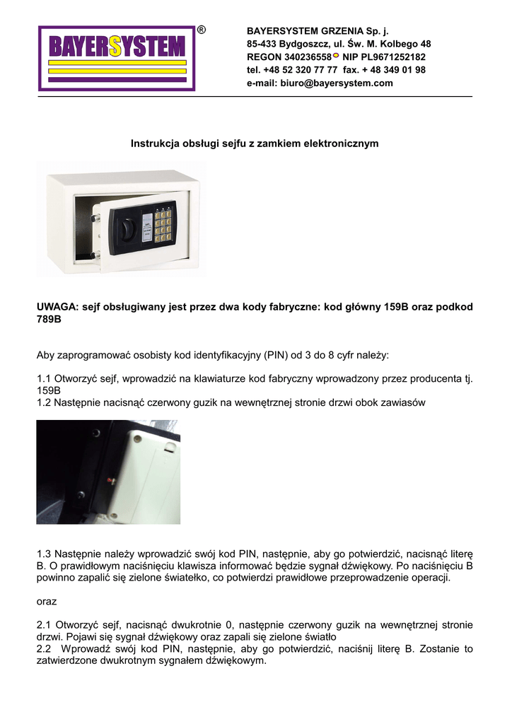 BAYERSYSTEM GRZENIA Sp. j. 85-433 Bydgoszcz, ul. Św. M. Kolbego 48 REGON 340236558 NIP PL9671252182 tel. +48 52 320 77 77 fax. + 48 349 01 98 e-mail: [email protected] Instrukcja obsługi sejfu z zamkiem elektronicznym UWAGA: sejf obsługiwany jest przez dwa kody fabryczne: kod główny 159B oraz podkod 789B Aby zaprogramować osobisty kod identyfikacyjny (PIN) od 3 do 8 cyfr należy: 1.1 Otworzyć sejf, wprowadzić na klawiaturze kod fabryczny wprowadzony przez producenta tj. 159B 1.2 Następnie nacisnąć czerwony guzik na wewnętrznej stronie drzwi obok zawiasów 1.3 Następnie należy wprowadzić swój kod PIN, następnie, aby go potwierdzić, nacisnąć literę B. O prawidłowym naciśnięciu klawisza informować będzie sygnał dźwiękowy. Po naciśnięciu B powinno zapalić się zielone światełko, co potwierdzi prawidłowe przeprowadzenie operacji. oraz 2.1 Otworzyć sejf, nacisnąć dwukrotnie 0, następnie czerwony guzik na wewnętrznej stronie drzwi. Pojawi się sygnał dźwiękowy oraz zapali się zielone światło 2.2 Wprowadź swój kod PIN, następnie, aby go potwierdzić, naciśnij literę B. Zostanie to zatwierdzone dwukrotnym sygnałem dźwiękowym. –2– ABY SEJF BYŁ OBSŁUGIWANY JEDNYM KODEM, OBA POWYŻSZE PRZEKODOWANIA NALEŻY WYKONAĆ WPROWADZAJAĆ TEN SAM INDYWIDUALNY KOD PIN PROSIMY ZAPAMIĘTAĆ SWÓJ NOWO WPROWADZONY KOD PIN Użytkowanie sejfu: 1. Aby otworzyć sejf, należy wprowadzić swój kod PIN, następnie nacisnąć klawisz z literką B. Przekręcić rączkę/gałkę umieszczoną na klawiaturze, zgodnie z ruchem wskazówek zegara, co spowoduje otwarcie sejfu. 2. Po wprowadzeniu kodu PIN, użytkownik ma 5 sekund na otwarcie sejfu, jeśli jednak nastąpi zamknięcie, wówczas należy ponownie wprowadzić kod PIN. Prosimy nie zapominać o naciśnięciu klawisza oznaczonego literką B, po każdorazowym wprowadzeniu kodu PIN użytkownika. UWAGA: jeśli nastąpi nieautoryzowane wejście lub sam użytkownik wprowadzi nieprawidłową ilość cyfr, wówczas sejf się nie otworzy i zapali się żółte światełko umieszczone na klawiaturze. Trzykrotne wprowadzenie nieprawidłowego kodu PIN powoduje zawieszenie funkcji otwierania na czas 20 sekund. WAŻNE – AWARYJNE OTWIERANIE 1. Jeśli użytkownik zapomni swój kod PIN, wówczas może skorzystać z awaryjnego otwierania ręcznego. UWAGA: NIE WOLNO PRZECHOWYWAĆ KLUCZA DO AWARYJNEGO OTWIERANIA W SEJFIE !!! Aby przeprowadzić awaryjne otwieranie ręczne należy usunąć logo umieszczone e centrum tablicy rozdzielczej zamka i włożyć w odkryty otwór klucz. Klucz należy przekręcić przeciwnie do ruchu wskazówek zegara. Wówczas nastąpi otwarcie sejfu. 2. Prosimy o zanotowanie następujących informacji i przechowywać je w niezależnym od sejfu miejscu: numer klucza i numer sejfu (numer sejfu znajduje się na małej naklejce ponad wejściem do otwierania awaryjnego, jak i na wewnętrznej stronie drzwi sejfu). 3. Czerwone światło świecące w górnej prawej części klawiatury wskazuje na wyładowanie baterii. UWAGA: wymiany baterii dokonuje się poprzez wysunięcie zasuwki przykrywającej baterie, która znajduje się na tylnej ścianie drzwi i ponowne jej zasunięcie po wymianie baterii. Zaleca się jednorazową wymianę wszystkich baterii.