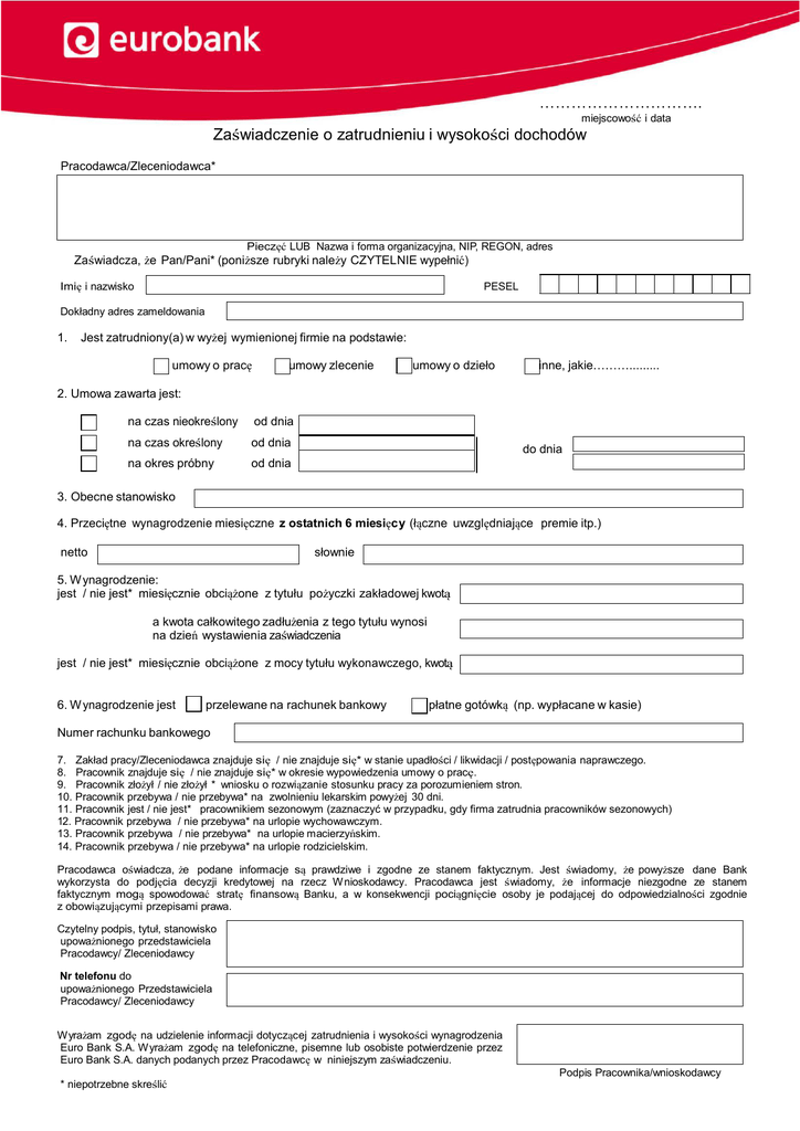 …………………………. miejscowość i data Zaświadczenie o zatrudnieniu i wysokości dochodów Pracodawca/Zleceniodawca* Pieczęć LUB Nazwa i forma organizacyjna, NIP, REGON, adres Zaświadcza, że Pan/Pani* (poniższe rubryki należy CZYTELNIE wypełnić) Imię i nazwisko PESEL Dokładny adres zameldowania 1. Jest zatrudniony(a) w wyżej wymienionej firmie na podstawie: umowy o pracę umowy zlecenie umowy o dzieło inne, jakie………......... 2. Umowa zawarta jest: na czas nieokreślony od dnia na czas określony od dnia na okres próbny od dnia do dnia do dnia 3. Obecne stanowisko 4. Przeciętne wynagrodzenie miesięczne z ostatnich 6 miesięcy (łączne uwzględniające premie itp.) netto słownie 5. W ynagrodzenie: jest / nie jest* miesięcznie obciążone z tytułu pożyczki zakładowej kwotą a kwota całkowitego zadłużenia z tego tytułu wynosi na dzień wystawienia zaświadczenia jest / nie jest* miesięcznie obciążone z mocy tytułu wykonawczego, kwotą 6. W ynagrodzenie jest przelewane na rachunek bankowy płatne gotówką (np. wypłacane w kasie) Numer rachunku bankowego 7. Zakład pracy/Zleceniodawca znajduje się / nie znajduje się* w stanie upadłości / likwidacji / postępowania naprawczego. 8. Pracownik znajduje się / nie znajduje się* w okresie wypowiedzenia umowy o pracę. 9. Pracownik złożył / nie złożył * wniosku o rozwiązanie stosunku pracy za porozumieniem stron. 10. Pracownik przebywa / nie przebywa* na zwolnieniu lekarskim powyżej 30 dni. 11. Pracownik jest / nie jest* pracownikiem sezonowym (zaznaczyć w przypadku, gdy firma zatrudnia pracowników sezonowych) 12. Pracownik przebywa / nie przebywa* na urlopie wychowawczym. 13. Pracownik przebywa / nie przebywa* na urlopie macierzyńskim. 14. Pracownik przebywa / nie przebywa* na urlopie rodzicielskim. Pracodawca oświadcza, że podane informacje są prawdziwe i zgodne ze stanem faktycznym. Jest świadomy, że powyższe dane Bank wykorzysta do podjęcia decyzji kredytowej na rzecz W nioskodawcy. Pracodawca jest świadomy, że informacje niezgodne ze stanem faktycznym mogą spowodować stratę finansową Banku, a w konsekwencji pociągnięcie osoby je podającej do odpowiedzialności zgodnie z obowiązującymi przepisami prawa. Czytelny podpis, tytuł, stanowisko upoważnionego przedstawiciela Pracodawcy/ Zleceniodawcy Nr telefonu do upoważnionego Przedstawiciela Pracodawcy/ Zleceniodawcy Wyrażam zgodę na udzielenie informacji dotyczącej zatrudnienia i wysokości wynagrodzenia Euro Bank S.A. W yrażam zgodę na telefoniczne, pisemne lub osobiste potwierdzenie przez Euro Bank S.A. danych podanych przez Pracodawcę w niniejszym zaświadczeniu. Podpis Pracownika/wnioskodawcy * niepotrzebne skreślić