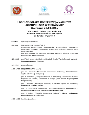 I OGÓLNOPOLSKA KONFERENCJA NAUKOWA „KOMUNIKACJA W MEDYCYNIE” Warszawa 22.10.2016 Warszawski Uniwersytet Medyczny Centrum Biblioteczno-Informacyjne ul. Żwirki i Wigury 63 8.00–9.00 rejestracja uczestników 9.00–9.40 OTWARCIE KONFERENCJI (sala 8) wystąpienia przedstawicieli organizatorów: Warszawskiego Uniwersytetu Medycznego, Polskiego Towarzystwa Komunikacji Medycznej, Zespołu Języka Medycznego PAN wręczenie nagrody dla zwycięzcy konkursu „Dialog na zdrowie – znaczenie komunikacji w procesie leczenia” 9.40–10.40 prof. Wolf Langewitz (Universitätspital Basel), The informed patient – both necessity and illusion? 10.40–11.00 przerwa kawowa 11.00–13.00 SESJA PLENARNA (sala 8) prof. T. Pasierski (Warszawski Uniwersytet Medyczny), Komunikowanie ryzyka interwencji medycznej prof. R. Ossowski (Collegium Medicum w Bydgoszczy Uniwersytetu Mikołaja Kopernika w Toruniu), Rozmowa z chorym jako proces diagnostycznoterapeutyczny prof. J. Barański (Uniwersytet Medyczny im. Piastów Śląskich we Wrocławiu), Rozmowy w bliskości śmierci prof. P. Zaborowski (Uniwersytet Warmińsko-Mazurski), Komunikacja z pacjentem w codziennym życiu praktykującego lekarza prof. J. Dąbała (Katolicki Uniwersytet Lubelski), Ukryte preliminaria komunikowania w medycynie 13.00–14.00 lunch i sesja plakatowa SESJA PLAKATOWA Foldery informacyjne jako forma komunikacji z pacjentem, Monika Hoppers (Uniwersytet Wrocławski) Znaczenie komunikacji w praktyce położniczej, Joanna Popławska (Collegium Medicum im. L .Rydygiera w Bydgoszczy UMK w Toruniu) Środki intermedialne w komunikacji – pacjent w przestrzeniach oddziaływań arteterapii, Kamil Wnuk (Uniwersytet Adama Mickiewicza w Poznaniu) Czy warto nauczać przyszłych farmaceutów dobrej komunikacji z pacjentem? Magdalena Cerbin-Koczorowska (Uniwersytet Medyczny w Poznaniu), Magdalena Witt (Uniwersytet Medyczny w Poznaniu), Aleksandra Bojarska (University Hospital of South Manchester), Patrycja Marciniak-Stępak (Uniwersytet Medyczny w Poznaniu) Komunikacja z pacjentem z rozpoznaną chorobą nowotworową, Sebastian Zdończyk (Akademia Pomorska) 14.00–16.00 SESJA PLENARNA: Nauczanie komunikacji na kierunkach medycznych – doświadczenia i perspektywy (sala 8) Nauczanie komunikacji na uczelniach medycznych w Polsce, Antonina Doroszewska (Warszawski Uniwersytet Medyczny), Katarzyna Jankowska (Collegium Medicum w Bydgoszczy Uniwersytetu Mikołaja Kopernika w Toruniu) Wprowadzenie 4-letniego kursu komunikacji jako umiejętności klinicznej w Zakładzie Dydaktyki Medycznej Collegium Medicum UJ – zarys doświadczeń, Stanisław Górski, Łukasz Małecki, Agata Stalmach-Przygoda, Anna Kocurek, Agnieszka Skrzypek, Bogumiła Kowalska, Michał Nowakowski (UJ) Kompetencje miękkie w zawodzie lekarza – doświadczenia Zakładu Psychologii Medycznej w realizacji fakultetów z kompetencji interpersonalnych i społecznych na kierunku lekarskim I WL i II WL Warszawskiego Uniwersytetu Medycznego, Marta Kulpa, Urszula Ziętalewicz, Krzysztof Owczarek (Warszawski Uniwersytet Medyczny) Jak uczyć komunikacji medycznej w kontekście całościowego podejścia do pacjenta?, Aleksandra Bojarska (University Hospital of South Manchester), Magdalena Witt (Uniwersytet Medyczny w Poznaniu), Patrycja Marciniak-Stępak (Klinika Onkologii, Hematologii i Transplantologii Pediatrycznej Uniwersytetu Medycznego w Poznaniu), Magdalena Cerbin-Koczorowska (Uniwersytet Medyczny w Poznaniu) W jaki sposób uczyć studentów różnych kierunków medycznych przekazywania trudnych wiadomości?, Magdalena Witt (Uniwersytet Medyczny w Poznaniu), Aleksandra Bojarska (University Hospital of South Manchester), Patrycja Marciniak-Stępak (Uniwersytet Medyczny w Poznaniu), Magdalena Cerbin-Koczorowska (Uniwersytet Medyczny w Poznaniu) Tanatoedukacja a śmierć dziecka. Jak (nie) mówić o śmierci – zalecenia komunikacyjne dla lekarzy i personelu medycznego w wypadku zgonu noworodka, Agnieszka Janiak (Dolnośląska Szkoła Wyższa we Wrocławiu) Seriale medyczne jako narzędzie wspomagające w nauce sposobu przekazania pacjentowi informacji o chorobie nowotworowej?, Tomira Chmielewska-Ignatowicz (Uniwersytet Kardynała Stefana Wyszyńskiego w Warszawie) 16.00–16.30 przerwa kawowa 16.30–18.15 SESJE RÓWNOLEGŁE SESJA A: Komunikacja medyczna jako interdyscyplinarne: psychologia, język, kultura (sala 8) zagadnienie Wpływ przemian kulturowych na relację pacjent-lekarz, Tadeusz Parnowski (Polskie Towarzystwo Psychogeriatryczne) Empatyczna komunikacja w praktyce medycznej, Ewa Wilczek-Rużyczka (Krakowska Akademia im. Andrzeja Frycza Modrzewskiego) Komunikacja medyczna w pediatrii, Edyta Palka, Katarzyna Jankowska (Collegium Medicum w Bydgoszczy Uniwersytetu Mikołaja Kopernika w Toruniu) Komunikacja w opiece paliatywnej jako dialog społeczny, Urszula Okulska (Uniwersytet Warszawski) Rozmowa z pacjentem o jego seksualności jako szczególny przykład komunikacji lekarz-pacjent, Tomasz Krasuski (Warszawski Uniwersytet Medyczny) Rola metafor w komunikacji lekarz-pacjent, Magdalena Bielenia-Grajewska (Uniwersytet Gdański) SESJA B: Komunikacja medyczna jako przedmiot badań empirycznych (sala 23) Główne bariery komunikacyjne w procesie przekazywania niepomyślnych wiadomości pacjentom onkologicznym , Paulina Zielińska, Magdalena Jarosz, Agnieszka Kwiecińska (Uniwersytet Jagielloński Collegium Medicum w Krakowie, Centrum Onkologii im. Marii Curie-Skłodowskiej Oddział w Krakowie) Komunikacja z dorosłym niemówiącym pacjentem neurologicznym głównie w oddziale intensywnego nadzoru medycznego – propozycja opracowania metod i studium przypadku, Olga Jauer-Niworowska (Uniwersytet Warszawski), Anna Lis (Uniwersytet Warszawski, Szpital Kolejowy sp. z o. o. im. dr. med. W. Roeflera w Pruszkowie) Lekarz i pacjent na emigracji: kultury komunikacji w ochronie zdrowia w Polsce i w Wielkiej Brytanii, Magda Zabielska, Agnieszka Kiełkiewicz-Janowiak (Uniwersytet im. Adama Mickiewic