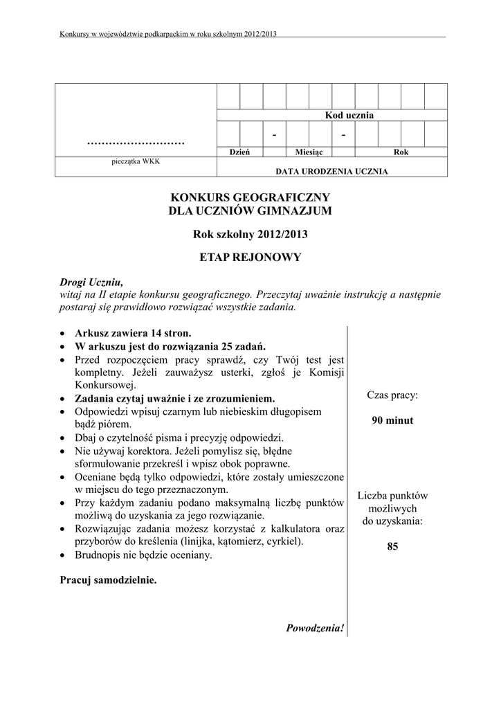 Konkursy w województwie podkarpackim w roku szkolnym 2012/2013 Kod ucznia - ……………………… Dzień Miesiąc Rok pieczątka WKK DATA URODZENIA UCZNIA KONKURS GEOGRAFICZNY DLA UCZNIÓW GIMNAZJUM Rok szkolny 2012/2013 ETAP REJONOWY Drogi Uczniu, witaj na II etapie konkursu geograficznego. Przeczytaj uważnie instrukcję a następnie postaraj się prawidłowo rozwiązać wszystkie zadania. Arkusz zawiera 14 stron. W arkuszu jest do rozwiązania 25 zadań. Przed rozpoczęciem pracy sprawdź, czy Twój test jest kompletny. Jeżeli zauważysz usterki, zgłoś je Komisji Konkursowej. Zadania czytaj uważnie i ze zrozumieniem. Odpowiedzi wpisuj czarnym lub niebieskim długopisem bądź piórem. Dbaj o czytelność pisma i precyzję odpowiedzi. Nie używaj korektora. Jeżeli pomylisz się, błędne sformułowanie przekreśl i wpisz obok poprawne. Oceniane będą tylko odpowiedzi, które zostały umieszczone w miejscu do tego przeznaczonym. Przy każdym zadaniu podano maksymalną liczbę punktów możliwą do uzyskania za jego rozwiązanie. Rozwiązując zadania możesz korzystać z kalkulatora oraz przyborów do kreślenia (linijka, kątomierz, cyrkiel). Brudnopis nie będzie oceniany. Pracuj samodzielnie. Powodzenia! Czas pracy: 90 minut Liczba punktów możliwych do uzyskania: 85 Konkursy w województwie podkarpackim w roku szkolnym 2012/2013 Zadanie 1. (0– 6 pkt) Na siatce kartograficznej zaznaczono punktami i oznaczono literami następujące miasta: Warszawa (52°N, 21°E), Rio de Janeiro (23°S, 43°W), Bangkok (14°N, 101°E), Kapsztad (34°S, 18°E ), Kolombo (06ºN, 79ºE), Nowy Jork (41ºN, 74ºW), Pekin (40ºN, 117ºE), Meksyk (20ºN, 99ºW) a) Podaj nazwy miast oznaczonych literami E i D miasto E ..................................., miasto D ....................................... b) Zaznacz na siatce kartograficznej punktem i literą H miasto Lizbona (39ºN, 9ºW). c) Wyznacz azymut 310º z punktu F. d) W Rio de Janeiro jest południe słoneczne. Zakreskuj obszar Ziemi, na którym Słońce jeszcze nie górowało. e) Spośród miast wymienionych w poleceniu wybierz to, w którym najwcześniej można oglądać wschód Słońca? Odp. ………………………… f) W której strefie oświetlenia Ziemi znajdują się punkty A i F? Odp. ………………………… Zadanie 2. (0–2 pkt) Jezioro Czad ma powierzchnię w porze wilgotnej 22 000 km ² i max. głębokość 12 m. Ile wynosi jego powierzchnia na mapie w skali 1:18 000 000 w porze suchej, kiedy jezioro jest o połowę mniejsze powierzchniowo i trzy razy płytsze. Obliczenia: Odpowiedź: ……………………… Strona 2 z 14 Konkursy w województwie podkarpackim w roku szkolnym 2012/2013 Zadanie 3. (0– 4 pkt) Statek płynął przez Pacyfik z Jokohamy (139°E) do San Francisco (38°N, 122°W). Wypłynął dnia 22 grudnia 2011 roku, kiedy słońce górowało po południowej stronie nieba na wysokości 31°06´. Podróż trwała 5 h i 14 min. a) Oblicz o której godzinie czasu słonecznego statek przypłynął do miasta amerykańskiego. Obliczenia: Odpowiedź: ……………………… b) uwzględniając przekroczenie południka 180°, podaj jaką datę powinien kapitan statku wpisać do dziennika pokładowego w momencie dopłynięcia do San Francisco Odpowiedź: ……………………… c) podaj drugą współrzędną geograficzną miasta japońskiego Odpowiedź: ……………………… Zadanie 4. (0–1 pkt) Zaznacz średnią gęstość zaludnienia Panamy, wiedząc, że na powierzchni 75 tys. km² mieszka 2 miliony 625 tysięcy osób. a) 43 os/km² b) 35 os/km² c) 53 os/km² d) 34 os/km² Odpowiedź: ……………………… Zadanie 5. (0–4 pkt) Uzupełnij rysunek przedstawiający zjawisko powstawania fenu (a-c) a) Wrysuj w odpowiednim miejscu chmury. b) Oblicz i wpisz w odpowiednie miejsca wartości temperatury powietrza uwzględniając sucho adiabatyczny (1°C) i wilgotno adiabatyczny (0,5°C) spadek temperatury wraz z wysokością. c) Podaj dwie cechy wiatru fenowego: 1.……………….………… 2…………………………… Strona 3 z 14 Konkursy w województwie podkarpackim w roku szkolnym 2012/2013 Zadanie 6. (0–3 pkt) Uzupełnij brakujące elementy tabeli ilustrującej współzależność elementów środowiska. Wykorzystaj poniżej zamieszczone nazwy stref klimatycznych, formacji roślinnych i roślin. Strefa klimatyczna subpolarna Roślinność Charakterystyczne 3 rośliny lasy dębowe i makia równikowa Strefy klimatyczne: podrównikowa, zwrotnikowa, podzwrotnikowa, umiarkowana ciepła, umiarkowana chłodna, polarna Formacje roślinne: las równikowy, sawanna, półpustynia, pustynia, dżungla, step, las liściasty, tajga, tundra, pustynia lodowa Rośliny: ostnica Jana, mirt, dębik ośmiopłatkowy, kauczukowiec, wanilia płaskolistna, chrobotek reniferowy, zawilec wielkokwiatowy, cynamonowiec cejloński, oleander, różanecznik, miłek wiosenny, płucnica islandzka, kozłek bulwiasty Zadanie 7. (0–2 pkt) Połącz strzałkami pojęcia z ich uproszczonymi definicjami: Zjawisko tworzenia się kwiatów i owoców wprost na konarach i pniach drzew. A) puna Las lub krzewiasta formacja rosnąca w pasie nadmorskich przypływów i odpływów w strefie gorącej. Rośliny słonolubne z licznymi korzeniami powietrznymi i oddechowymi. B) scrub Rzadki, świetlisty las o niskim drzewostanie, składający się z drzew i krzewów zrzucających liście na okres suszy. W języku portugalskim oznacza „biały las”. C) efemerydy Rośliny, których rozwój odbywa się w ciągu bardzo krótkiego czasu korzystnego dla wegetacji, gdy po deszczach gleba zawiera dostateczną ilość wody. D) katinga (caatinga) Lokalna nazwa wysokogórskiej formacji roślinnej w Andach, składającej się z kępkowatych i poduszkowych traw sucholubnych rosnących na wysokości od 3 do 5 tys. m n.p.m. E) mangrowia Gęste, suchoroślowe zarośla w centralnej Australii. Tworzy zwarty gąszcz krzewów o sinawym uli