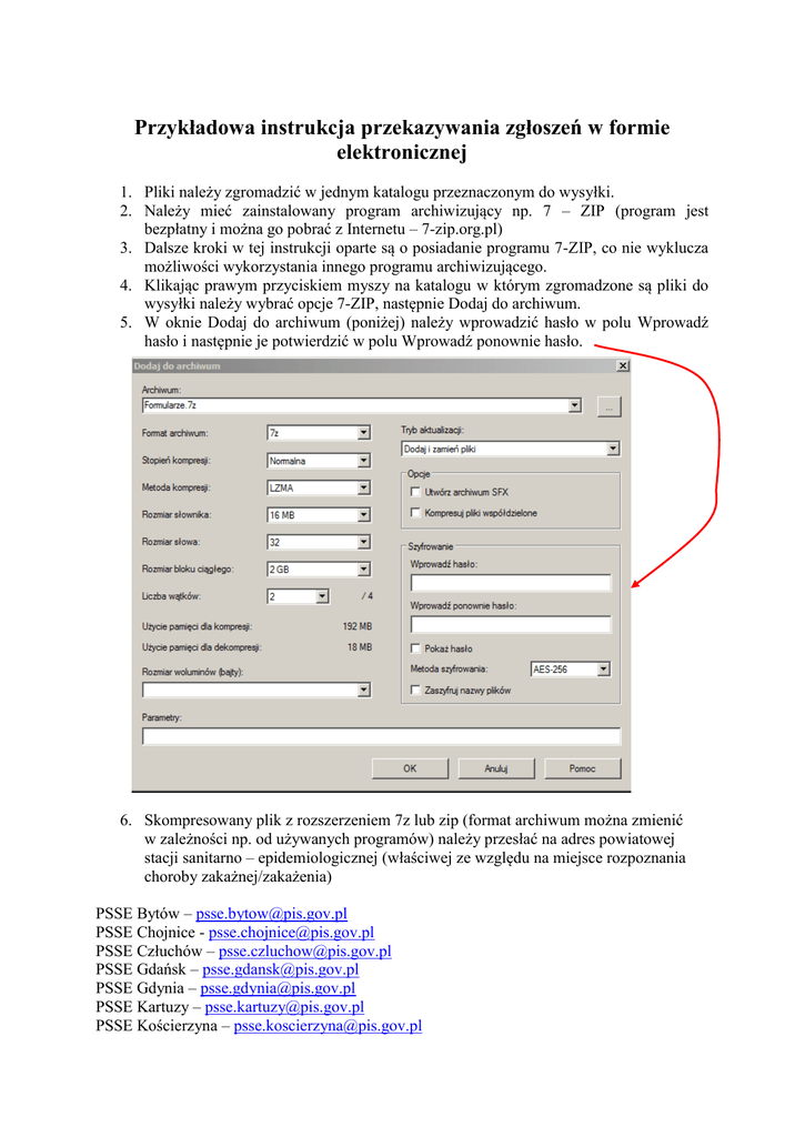 Przykładowa instrukcja przekazywania zgłoszeń w formie elektronicznej 1. Pliki należy zgromadzić w jednym katalogu przeznaczonym do wysyłki. 2. Należy mieć zainstalowany program archiwizujący np. 7 – ZIP (program jest bezpłatny i można go pobrać z Internetu – 7-zip.org.pl) 3. Dalsze kroki w tej instrukcji oparte są o posiadanie programu 7-ZIP, co nie wyklucza możliwości wykorzystania innego programu archiwizującego. 4. Klikając prawym przyciskiem myszy na katalogu w którym zgromadzone są pliki do wysyłki należy wybrać opcje 7-ZIP, następnie Dodaj do archiwum. 5. W oknie Dodaj do archiwum (poniżej) należy wprowadzić hasło w polu Wprowadź hasło i następnie je potwierdzić w polu Wprowadź ponownie hasło. 6. Skompresowany plik z rozszerzeniem 7z lub zip (format archiwum można zmienić w zależności np. od używanych programów) należy przesłać na adres powiatowej stacji sanitarno – epidemiologicznej (właściwej ze względu na miejsce rozpoznania choroby zakażnej/zakażenia) PSSE Bytów – [email protected] PSSE Chojnice - [email protected] PSSE Człuchów – [email protected] PSSE Gdańsk – [email protected] PSSE Gdynia – [email protected] PSSE Kartuzy – [email protected] PSSE Kościerzyna – [email protected] PSSE Kwidzyn – [email protected] PSSE Lębork – [email protected] PSSE Malbork – [email protected] PSSE Nowy Dwór Gdański – [email protected] PSSE Puck – [email protected] PSSE Pruszcz Gdański – [email protected] PSSE Słupsk – [email protected] PSSE Sopot – [email protected] PSSE Starogard Gdański – [email protected] PSSE Tczew – [email protected] PSSE Wejherowo – [email protected] 7. Hasło należy ustalić z Odbiorcą (przedstawicielem Państwowego Powiatowego Inspektora Sanitarnego telefonicznie bądź osobiście. Hasło powinno być bezpieczne i przynajmniej raz w miesiącu powinno być zmieniane. 8. Wiadomość należy zatytułować ZLK–1 - w przypadku podejrzeń lub rozpoznań większości zakażeń i chorób zakaźnych objętych obowiązkiem zgłaszania do PIS, za wyjątkiem zgłaszanych na drukach ZLK-2, ZLK-3, ZLK-4, ZLK–2 - w przypadku podejrzenia lub rozpoznania gruźlicy, ZLK–3 - w przypadku podejrzenia lub rozpoznania zachorowania na chorobę przenoszoną droga płciową, ZLK-4 – w przypadku podejrzenia lub rozpoznania zakażenia HIV/zachorowania na AIDS/zgonu osoby zakażonej HIV/chorej na AIDS, ZLK-5 – w przypadku podejrzenia lub rozpoznania zgonu z powodu zakażenia 9. Wykaz numerów telefonów poszczególnych powiatowych stacji sanitarno – epidemiologicznych znajduje się na stronie www.wsse.gda.pl