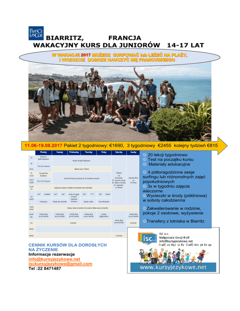 BIARRITZ, FRANCJA WAKACYJNY KURS DLA JUNIORÓW 14-17 LAT 11.06-19.08.2017 Pakiet 2 tygodniowy: €1690, 3 tygodniowy €2455 kolejny tydzień €815 20 lekcji tygodniowo Test na początku kursu Materiały edukacyjne 4 półtoragodzinne sesje surfingu lub różnorodnych zajęć popołudniowych 3x w tygodniu zajęcia wieczorne Wycieczki w środy (półdniowa) w soboty całodzienna Zakwaterowanie w rodzinie, pokoje 2 osobowe, wyżywienie Transfery z lotniska w Biarritz CENNIK KURSÓW DLA DOROSŁYCH NA ŻYCZENIE Informacje rezerwacje [email protected] [email protected] Tel :22 8471487