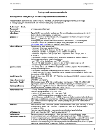 PP.33/7PN/12 Załącznik nr 1 Opis przedmiotu zamówienia Szczegółowa specyfikacja techniczna przedmiotu zamówienia Przedmiotem zamówienia jest dostawa, montaż, uruchomienie sprzętu komputerowego o następujących minimalnych lub równoważnych parametrach: 1. Serwer – 1 szt. Parametry techniczne obudowa procesor płyta główna pamięć ram dyski twarde napęd optyczny kontroler RAID karta graficzna karty sieciowe zasilacz chłodzenie dołączone oprogramowanie wymagane minimum Typu RACK o wysokości maksimum 2U umożliwiająca zainstalowanie min 8 dysków 2,5”, oraz napędu optycznego. Dwa procesory w architekturze x86, osiągające w testach wydajnościowych SPEC____2006 min. 39,1 pkt. Wymagane jest dostarczenie dokumentu z testów SPEC lub wymagana obecność certyfikatu potwierdzającego osiągnięty wynik na stronie: http://www.spec.org/ (wydruk załączony do oferty). Dedykowana płyta serwerowa: - minimum 24 gniazd pamięci RAM. - minimum 2 sloty PCI-Express Gen3 x16 typu low profile, - minimum 5 slotów PCI-Express Gen3 x8 typu low profile, - minimum 10 portów USB (w tym min. 2 z przodu, min. 4 z tyłu, min. 2 w środku), - możliwość instalacji pamięci flash wewnątrz serwera za pośrednictwem dedykowanego złącza na płycie głównej, - port VGA z tyłu, dodatkowo port VGA z przodu, - 1 porty RS-232-C dostępny zarówno dla systemu operacyjnego jak i sprzętowego kontrolera zdalnego zarządzania. - nie mniej niż 32 GB RAM typu registred z korekcją błędów Advanced ECC, funkcje scrubbing i SDDC, - możliwość konfiguracji aktywnej rezerwy i zapisu lustrzanego pamięci - obsadzone min 4 gniazd pamięci w trybie niezależnym możliwość rozbudowy do minimum 768 GB RAM 3 szt. dysków typu SAS 6G HOT PLUG w konfiguracji RAID 5 o pojemności min. 600 GB każdy DVD RW wewnętrzny Obsługujący dyski SAS 6G umożliwiający konfigurację RAID 0,1,5,10,50,60 z pamięcią cache min. 512MB, oraz modułem podtrzymania bateryjnego Zintegrowana, w jednym module z kontrolerem zdalnego zarządzania i pamięcią na płycie głównej, rozdzielczość min. 1600 x 1200 - 2 karty sieciowe typu Ethernet 10/100/1000, - wsparcie dla akceleracji TCP/IP, VT-c, - rozruch PXE przez sieć LAN z serwera PXE, - rozruch iSCSI przez zintegrowaną kartę sieci LAN, - 1 dedykowana karta Ethernet 10/100 wyłącznie dla komunikacji z kontrolerem zdalnego zarządzania,redundancja interfejsu zarządzającego poprzez przejęcie jego funkcjonalności w przypadku usterki przez jedną z dwóch kart Ethernet 10/100/1000. Redundantne dwa zasilacze zgodne ze standardem EPA typu hot-plug, o mocy maksymalnej 450W na 1 zasilacz, o sprawności min. 94% przy typowym obciążeniu 50%. Nadmiarowe chłodzenie – redundantne wentylatory typu hot-plug Min 5 wentylatorów HOT PLUG o redundancji 4+1 Oprogramowanie zarządzające i diagnostyczne wyprodukowane przez producenta serwera umożliwiające konfigurację kontrolera RAID, instalację systemów operacyjnych, zdalne zarządzanie, diagnostykę i przewidywanie awarii w oparciu o informacje dostarczane w ramach zintegrowanego w serwerze systemu umożliwiającego monitoring systemu i środowiska (temperatura, dyski, zasilacze, płyta główna, procesory, pamięć operacyjna itd.). 1 PP.33/7PN/12 zarządzanie certyfikaty producenta gwarancja dodatkowe wymagania Załącznik nr 1 Zintegrowany z płytą główną kontroler zdalnego zarządzania zgodny ze standardem IPMI 2.0 umożliwiający zdalny restart serwera i pełne zarządzanie włącznie z przejęciem zdalnym konsoli tekstowej (możliwość dokupienia opcji przejęcia konsoli graficznej oraz zdalnego podłączenia napędów). Dedykowana karta LAN 10/100 Mb/s do komunikacji wyłącznie z kontrolerem zdalnego zarządzania z możliwością przeniesienia tej komunikacji na inną kartę sieciową współdzieloną z systemem operacyjnym serwera. Umieszczona z przodu chowana karta identyfikacyjna serwera zawierająca nazwę serwera, numer handlowy, numer seryjny, adresy kart sieciowych Certyfikat producenta ISO 9001 w zakresie projektowania, produkcji i serwisu produktów, CE oraz ISO 14001. Min 3 lata w miejscu eksploatacji z gwarantowanym czasem usunięcia usterki najpóźniej w następnym dniu roboczym od zgłoszenia w godzinach pracy zamawiającego Ogólnopolska, telefoniczna infolinia/linia techniczna producenta komputera, (ogólnopolski numer o zredukowanej odpłatności 0-800/0-801, w ofercie należy podać nr telefonu) w czasie obowiązywania gwarancji na sprzęt i umożliwiająca po podaniu numeru seryjnego urządzenia weryfikację: konfiguracji sprzętowej serwera, w tym model i typ dysków twardych, procesora, ilość fabrycznie zainstalowanej pamięci operacyjnej, czasu obowiązywania i typ udzielonej gwarancji. Możliwość aktualizacji i pobrania sterowników do oferowanego modelu serwera w najnowszych certyfikowanych wersjach bezpośrednio z sieci Internet za pośrednictwem strony www producenta komputera, Możliwość weryfikacji czasu obowiązywania i reżimu gwarancji bezpośrednio z sieci Internet za pośrednictwem strony www producenta serwera 2. Serwerowy system operacyjny do serwera: - Microsoft Windows Serwer 2012 standard Academic OPEN – Licencja dla min 2 procesorów fizycznych* - Microsoft SERVER CALACADEMIC OPEN – licencja dostępowa na urządzenie* * Z uwagi na obecny stan zasobów informatycznych zamawiający nie dopuszcza produktów równoważnych. 3. Urządzenie do backupu serwera – 1 szt. Parametry Wymagane minimum techniczne Typu desktop. obudowa Dyski magnetyczne w konfiguracji RAID min 1 o uzyskanej przestrzeni dyskowej nośniki danych interfejsy komunikacyjne gwarancja 2TB. Min. 2 porty LAN 10/100/1000Mb/s, z obsługą protokołu i-scsi. Min. 2 lata. 4. Zasilacz UPS – 1 szt. Parametry Wymagane minimum techniczne Typu RACK o wysokości max. 2U Obudowa Min. 1000 VA / 700 W Maksymalne obciążenie Line Interactive Topologia Min. 4 IEC 320 C13 Gniazda wyjściowe RJ-45 Serial, 