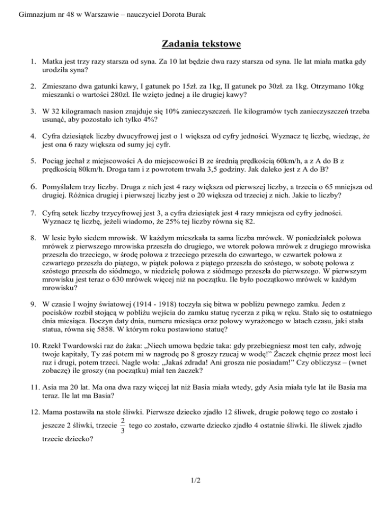 Zadania tekstowe - Gimnazjum nr 48