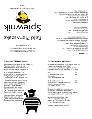 Głuchołazy – Banderoza 2014 Karolina w Hollywood z Aśką nigdy nie było tak samo. Ewelina zimna jak lód, więc na noc umówiłem się z Alą. Wszystko mógłbym Izie dać, tak jak Oli, ale one wcale nie chciały brać Małgorzata, jeden grzech, aż onieśmielała mnie. A Monika była okej. Piękne jak okręt Pod pełnymi żaglami Jak konie w galopie Jak niebo nad nami CG ae Baśka miała fajny biust, G a Ania styl, a Zośka coś co lubię. C G Ela całowała cudnie, nawet tuż po swoim ślubie z Kaśką można było konie kraść chociaż wiem, że chciała przeżyć ze mną swój pierwszy raz. Magda zło, Jolka mnie zagłaskałaby na śmierć a Agnieszka zdradzała mnie. Śpiewnik Rajd Pierwszaka I Liceum Ogólnokształcące im. Jarosława Iwaszkiewicza w Namysłowie 15. Baśka 3. Kocham Cię jak Irlandię 12. Dziewczyna gangstera Mieszkałaś gdzieś w domu nad Wisłą C e Pamiętam to tak dokładnie a d Twoich czarnych oczu bliskość B F Wciąż kocham Cię jak Irlandię C G W twoich włosach szumi bryza letnich burz. a F Twoje nogi dosięgają nieba bram. Twe ramiona wyrzeźbione z górskich skał. Chciałem oddać ci dziś wszystko to, co mam. A Ty się temu nie dziwisz C e Wiesz dobrze co było by dalej a d Jakbyśmy byli szczęśliwi B F Gdybym nie kochał Cię wcale C G C Uuu... uu... Ty wolałaś odejść z nim Uuu... uu... Życie to gangsterski film. Fd aG I przed szczęściem żywisz obawę Z nadzieją, że mi ją skradniesz Wlokę ten ból przez Włocławek Kochając Cię jak Irlandię Gdzieś na ulicy fabrycznej Spotkać nam się wypadnie Lecz takie są widać wytyczne By kochać Cię jak Irlandię Zostawiłaś mnie, bo ja nie mam nic z szemranych spraw, nie używam ostrych słów i nie jeżdżę BMW. aG Fd Czy mi to kiedyś wybaczysz Działałem tak nieporadnie Czy to dla Ciebie coś znaczy Że kocham Cię jak Irlandię Zadzwoniłem później tylko jeden raz. W telefonie usłyszałem męski głos. Zrozumiałem, że już chyba nie mam szans, gdy zapytał krótko, który wole most. Nie mam kumpli w disco night i nie straszę żadnych knajp. Nie chcesz moich słodkich chwil, bo ty wolisz gangsta styl. Dziewczyna gangstera d F C G Wiem dobrze, że synowie ich Też w morze pójdą, kiedy znów Do oczu komuś zajrzy śmierć I wezwie ratowniczą łódź I tylko krwawy słońca dysk Schyliło już po ciężkim dniu, Mrok okrył morze, niebo, brzeg Wiecznego całun ścieląc snu. W naszych rękach dwa i dwa na dnie, G cała reszta zwiała gdzieś. D A jeden z nich zabraliśmy e na starej Anglii brzeg. G D e Na brzegu kobiet niemy szloch, W ramiona ich nie wrócą już. Gdy oceanu twarda pięść Uderzy w ratowniczą łódź! Następny zbliża się do burt, a zwie się 'Róży Pąk'. Plunęliśmy ze wszystkich luf, bardzo szybko szedł na dno. A fale wściekle biły w brzeg, Ryk morza tłumił chłopców krzyk, "Mona" do brygu dzielnie szła Lecz brygu już nie widział nikt. Gdy przyszedł sygnał każdy z nich Wpół dojedzonej strawy dzban Porzucił, by na przystań biec, Wyruszyć w ten dziki z morzem tan! W grudniowy płaszcz okryta śmierć Spod czarnych nieba zeszła chmur. Przy brzegu konał smukły bryg Na pomoc "Mona" poszła mu. Był pięćdziesiąty dziewiąty rok. Pamiętam ten grudniowy dzień Gdy ośmiu mężczyzn zabrał sztorm Gdzieś w oceanu wieczny cień. aGa ae aGa dea aGa ae aea dea No i znów bijatyka, no G znów bijatyka, no G bijatyka cały dzień. G D I porąbany dzień i porąbany łeb, e G razem, bracia, aż po zmierzch! C D e Już pierwszy skrada się do burt, a zwie się 'Goździk' i z Algieru pasza wysłał go, żeby nam upuścił krwi. To dwudziesty czwarty był lutego, G (C) poranna zrzedła mgła. G D Wyszło z niej siedem uzbrojonych kryp, e G Turecki niosły znak. C D e 14. 24 był lutego 1. Mona 13. Hiszpańskie dziewczyny 2. Pożegnanie Liverpoolu Żegnajcie nam dziś hiszpańskie dziewczyny, e C h7 Żegnajcie nam dziś marzenia ze snów. e G D Ku brzegom angielskim już ruszać nam pora, C D e Lecz kiedyś na pewno wrócimy tu znów. e h7 e Żegnaj nam, dostojny, stary porcie, Rzeko Mersey, żegnaj nam! Zaciągnąłem się na rejs do Kalifornii, Byłem tam już nie jeden raz. I smak waszych ust hiszpańskie dziewczyny, e G D W noc ciemną i złą nam będzie się śnił. e G D Leniwie popłyną znów rejsu godziny, C D e Wspomnienie ust waszych przysporzy nam sił. C h7 e A więc żegnaj mi, kochana ma! CGFC Za chwilę wypłyniemy w długi rejs. C G7 Ile miesięcy cię nie będę widział, nie wiem sam, C F C Lecz pamiętać zawsze będę cię. C G7 C Niedługo ujrzymy znów w dali Cap Deadman, I głowę baranią sterczącą wśród wzgórz. I statki stojące na redzie przed Plymouth, Klarować kotwicę najwyższy czas już. Zaciągnąłem się na herbaciany kliper, Dobry statek, choć sławę ma złą. A że kapitanem jest tam stary Burgess, Pływającym piekłem wszyscy go zwą. I smak waszych ust hiszpańskie dziewczyny... Z kapitanem tym płynę już nie pierwszy raz, Znamy się od wielu, wielu lat. Jeśliś dobrym żeglarzem radę sobie dasz, Jeśli nie toś cholernie wpadł. A potem znów żagle na masztach rozkwitną. Kurs szyper wyznaczy do Portland i Wright. I znów stara łajba potoczy się ciężko, Przez fale w kierunku na Beachie Fairlie Land. I smak waszych ust hiszpańskie dziewczyny... Zabłysną nam bielą skał zęby pod Dover, I znów noc w kubryku wśród legend i bajd. Powoli i znojnie tak płynie nam życie, Na wodach i w portach South Foreland Light. I smak waszych ust hiszpańskie dziewczyny... CFC CG CFC CGC Żegnaj nam, dostojny, stary porcie, Rzeko Mersey, żegnaj nam! Wypływamy już na rejs do Kalifornii, Gdy wrócimy opowiemy wam... Myślisz może, że więcej coś znaczysz Bo masz rozum, dwie ręce i chęć Twoje miejsce na Ziemi tłumaczy Zaliczona matura na pięć Są tacy - to nie żart, dla których jesteś wart Krople mgły, w tęczowych kropel pyle Tańczy jacht, po deskach spływa dzień Jutro znów