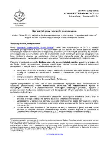 Sąd Unii Europejskiej KOMUNIKAT PRASOWY nr 73/15 Luksemburg, 19 czerwca 2015 r. Kontakty z Mediami i Informacja Sąd przyjął nowy regulamin postępowania W dniu 1 lipca 2015 r. wejdzie w życie nowy regulamin postępowania i nowe akty wykonawcze 1, mające na celu optymalizację przebiegu postępowań przed Sądem Nowy regulamin postępowania Nowy regulamin postępowania przed Sądem2, owoc prac rozpoczętych w 2012 r., zastąpi regulamin postępowania z 1991 r. Na przestrzeni lat ten ostatni akt został poddany licznym nowelizacjom celem dostosowania i ulepszenia przepisów proceduralnych stosownie do potrzeb i zmieniającej się rzeczywistości. Jako że skuteczność takich doraźnych posunięć osiągnęła swój kres, konieczna okazała się całościowa reforma, która otworzyła drogę dla przekształcenia oryginalnego aktu i wprowadzenia nowych przepisów. Pracom tym przyświecały rozliczne cele. Przepisy proceduralne zostały dostosowane do rzeczywistości sporów aktualnie wnoszonych do Sądu, dzięki wprowadzeniu jasnego rozróżnienia między trzema głównymi kategoriami postępowań, z których każda posiada odrębną specyfikę: skarg bezpośrednich, w ramach których kwestie incydentalne, wnioski o dopuszczenie do sprawy w charakterze interwenienta i wnioski o zachowanie poufności są szczególnie liczne; skarg w dziedzinie własności intelektualnej; odwołań od orzeczeń Sądu do spraw Służby Publicznej. Wysiłki podejmowane od wielu lat w celu podniesienia wydajności sądu kontynuowano w dziedzinie proceduralnej celem wzmocnienia zdolności do rozpoznawania spraw w rozsądnym terminie i z poszanowaniem wymogów uczciwego procesu, zgodnie z postanowieniami Karty praw podstawowych Unii Europejskiej3. W tym względzie na podkreślenie zasługuje między innymi : rozszerzenie zakresu zastosowania przepisów dotyczących orzekania przez Sąd w składzie jednego sędziego na sprawy z zakresu własności intelektualnej; uproszczenie, w sprawach z zakresu własności intelektualnej, zasad dotyczących ustalania języka postępowania i przebiegu pisemnego etapu postępowania (jedna wymiana pism procesowych) ; uproszczenie reguł interwencji (nie dopuszcza się już interwencji, jeżeli wniosek został złożony po upływie prawem przewidzianego terminu sześciu tygodni od publikacji w Dzienniku Urzędowym Unii Europejskiej (Dz.U. UE) informacji o wniesieniu skargi); 1 Praktyczne przepisy wykonawcze do regulaminu postępowania przed Sądem, formularz wniosku o przyznanie pomocy prawnej i szereg wykazów kontrolnych. 2 W następstwie zgody udzielonej przez Trybunał Sprawiedliwości, projekt regulaminu postępowania został przekazany Radzie w dniu 14 marca 2014 r., zgodnie z art. 254 akapit piąty TFUE. Po uzyskaniu zgody Rady w dniu 10 lutego 2015 r., regulamin postępowania został przyjęty przez Sąd w dniu 4 marca 2015 r. i opublikowany w Dzienniku Urzędowym Unii Europejskiej w dniu 23 kwietnia 2015 r. (Dz.U. L 105, s. 1). 3 Artykuł 47 Karty. www.curia.europa.eu możliwość wydania przez Sąd rozstrzygnięcia w przedmiocie skarg bezpośrednich z pominięciem ustnego etapu postępowania w sytuacji, gdy żadna ze stron głównych nie wniosła o przeprowadzenie rozprawy; możliwość wydania przez Sąd rozstrzygnięcia w przedmiocie odwołań z pominięciem ustnego etapu postępowania, nawet w sytuacji, gdy jedna ze stron wniosła o przeprowadzenie rozprawy ; wyjaśnienie uprawnień przyznanych interwenientom; przekazanie na rzecz prezesów izb niektórych kompetencji decyzyjnych uprzednio przysługujących izbie i uproszczenie formy niektórych decyzji, poprzez wprowadzenie nowych przypadków, w których nie rozstrzyga się już w drodze postanowienia (na przykład zawieszenie postępowania i połączenie spraw); wskazanie, że w przedmiocie zarzutu niedopuszczalności lub niewłaściwości, wniosku o umorzenie postępowania lub w przedmiocie każdej innej kwestii incydentalnej oraz wniosku o dopuszczenie do sprawy w charakterze interwenienta lub zakwestionowania wniosku o zachowanie poufności Sąd orzeka w możliwie najkrótszym czasie. Dołożono starań, aby zapewnić spójność przepisów proceduralnych regulujących spory wnoszone do sądów Unii Europejskiej, mając na uwadze w szczególności regulamin postępowania przed Trybunałem Sprawiedliwości, który wszedł w życie w dniu 1 listopada 2012 r., przy równoczesnym uwzględnieniu specyfiki postępowań ze skarg bezpośrednich między osobami fizycznymi lub prawnymi lub państwem członkowskim a instytucją Unii. Sąd będzie dysponował przepisami pozwalającymi mu na przyjęcie metody organizacji, jaką uważa za najbardziej właściwą, stosownie do – między innymi – liczby sędziów wchodzących w jego skład oraz przepisami mającymi na celu zapewnienie skuteczności zmiany statutu dotyczącej utworzenia stanowiska wiceprezesa Sądu. Znaleziono rozwiązania dla sytuacji proceduralnych pozostających dotychczas bez odpowiedzi w przepisach proceduralnych, w tym: przesłanki, zgodnie z którymi sprawa może zostać ponownie przydzielona, dostosowanie żądań skargi w toku postępowania lub działania, jakie należy podjąć po tym, jak dokument został złożony w ramach środka dowodowego nakazanego przez Sąd. Ponadto, opracowano nowy, specyficzny mechanizm proceduralny w celu uregulowania przetwarzania w toku postępowania poufnych informacji lub materiałów mających wpływ na bezpieczeństwo Unii, jej państwa członkowskiego lub państw członkowskich lub też na utrzymywanie przez nie stosunków międzynarodowych oraz odstępstw od zasady kontradyktoryjności, które mogą się z nim wiązać. Mechanizm ten, przewidziany w art. 105 regulaminu postępowania, nabierze jednakże mocy dopiero po opublikowaniu decyzji Sądu określającej zasady bezpieczeństwa do celów ochrony tych danych. Dokonano również racjonalizacji niektórych rozwiązań: zniesiono ciążący na adwokacie lub r
