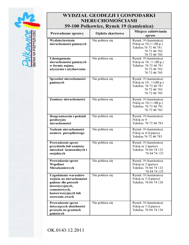 WYDZIAŁ GEODEZJI I GOS»PODARKI NIERUCHOMOŚCIĄ MI 59-100 Polkowice, Rynek 19 ( ramienica) Prowadzone sprawy Opłata skarbowa M iejsce załatwiania spraw Wydzierżawienie nieruchomości gminnych Nie pobiera się Udostępnianie nieruchomości gminnych w formie najmu, użyczenia i użytkowania Nie pobiera się Sprzedaż nieruchomości gminnych Nie pobiera się Rynek 19 (kamienica) Pokój nr 10, 11(111 p.) Telefon: 76 72 46 781 76 72 46 782 76 72 46 785 Zamiany nieruchomości Nie pobiera się Rynek 19 (kamienica) Pokój nr 10,11 (IIIp.) Telefon: 76 72 46 781 76 72 46 782 Rozgraniczenie i podział geodezyjny nieruchomości Nie pobiera się Rynek 19 (kamienica) Pokój nr 4 Telefon: 76 72 46 783 Nadanie nieruchomości numeru porządkowego Nie pobiera się Rynek 19 (kamienica) Pokój nr 4 (I piętro) Telefon:76 72 46 783 Prowadzenie spraw przydziału lub zamiany mieszkań komunalnych i socjalnych Nie pobiera się Rynek 19 (kamienica) Pokój nr 2 (parter) Telefon: 76 84 74 122 76 84 74 123 Prowadzenie spraw Wspólnot Mieszkaniowych Nie pobiera się Uzgadnianie warunków wejścia na nieruchomości gminne dla potrzeb inwestycyjnych, remontowych, konserwacyjnych lub usuwania awarii Nie pobiera się Rynek 19 (kamienica) Pokój nr 2 (parter) Telefon: 76 84 74 122 76 84 74 123 Rynek 19 (kamienica) Pokój nr 3 (I piętro) Telefon: 76 84 74 128 Prowadzenie spraw dotyczących służebności przesyłu na gruntach gminnych Nie pobiera się OK.0143.12.2011 Rynek 19 (kamienica) Pokój nr 10,11 (IIIp.) Telefon:76 72 46 781 76 72 46 782 76 72 46 785 Rynek 19 (kamienica) Pokój nr 10,11 (IIIp.) Telefon: 76 72 46 781 76 72 46 782 76 72 46 785 Rynek 19 (kamienica) Pokój nr 3 (I piętro) Telefon: 76 84 74 128