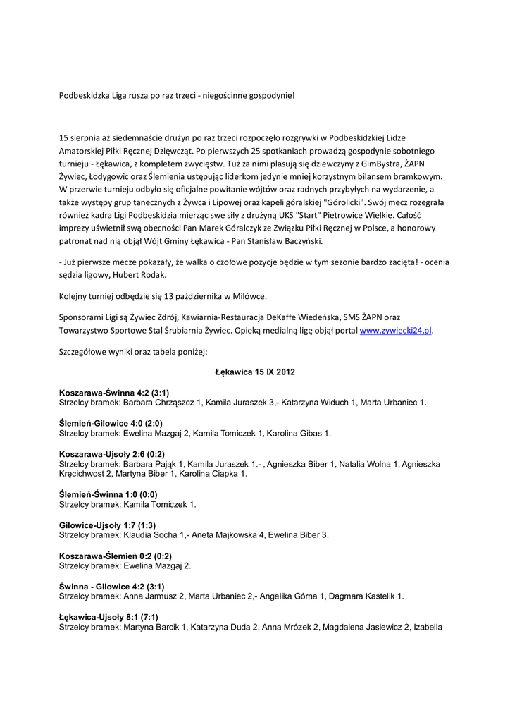 Podbeskidzka Liga rusza po raz trzeci - niegościnne gospodynie! 15 sierpnia aż siedemnaście drużyn po raz trzeci rozpoczęło rozgrywki w Podbeskidzkiej Lidze Amatorskiej Piłki Ręcznej Dzięwcząt. Po pierwszych 25 spotkaniach prowadzą gospodynie sobotniego turnieju - Łękawica, z kompletem zwycięstw. Tuż za nimi plasują się dziewczyny z GimBystra, ŻAPN Żywiec, Łodygowic oraz Ślemienia ustępując liderkom jedynie mniej korzystnym bilansem bramkowym. W przerwie turnieju odbyło się oficjalne powitanie wójtów oraz radnych przybyłych na wydarzenie, a także występy grup tanecznych z Żywca i Lipowej oraz kapeli góralskiej "Górolicki". Swój mecz rozegrała również kadra Ligi Podbeskidzia mierząc swe siły z drużyną UKS "Start" Pietrowice Wielkie. Całość imprezy uświetnił swą obecności Pan Marek Góralczyk ze Związku Piłki Ręcznej w Polsce, a honorowy patronat nad nią objął Wójt Gminy Łękawica - Pan Stanisław Baczyński. - Już pierwsze mecze pokazały, że walka o czołowe pozycje będzie w tym sezonie bardzo zacięta! - ocenia sędzia ligowy, Hubert Rodak. Kolejny turniej odbędzie się 13 października w Milówce. Sponsorami Ligi są Żywiec Zdrój, Kawiarnia-Restauracja DeKaffe Wiedeńska, SMS ŻAPN oraz Towarzystwo Sportowe Stal Śrubiarnia Żywiec. Opieką medialną ligę objął portal www.zywiecki24.pl. Szczegółowe wyniki oraz tabela poniżej: Łękawica 15 IX 2012 Koszarawa-Świnna 4:2 (3:1) Strzelcy bramek: Barbara Chrząszcz 1, Kamila Juraszek 3,- Katarzyna Widuch 1, Marta Urbaniec 1. Ślemień-Gilowice 4:0 (2:0) Strzelcy bramek: Ewelina Mazgaj 2, Kamila Tomiczek 1, Karolina Gibas 1. Koszarawa-Ujsoły 2:6 (0:2) Strzelcy bramek: Barbara Pająk 1, Kamila Juraszek 1.- , Agnieszka Biber 1, Natalia Wolna 1, Agnieszka Kręcichwost 2, Martyna Biber 1, Karolina Ciapka 1. Ślemień-Świnna 1:0 (0:0) Strzelcy bramek: Kamila Tomiczek 1. Gilowice-Ujsoły 1:7 (1:3) Strzelcy bramek: Klaudia Socha 1,- Aneta Majkowska 4, Ewelina Biber 3. Koszarawa-Ślemień 0:2 (0:2) Strzelcy bramek: Ewelina Mazgaj 2. Świnna - Gilowice 4:2 (3:1) Strzelcy bramek: Anna Jarmusz 2, Marta Urbaniec 2,- Angelika Górna 1, Dagmara Kastelik 1. Łękawica-Ujsoły 8:1 (7:1) Strzelcy bramek: Martyna Barcik 1, Katarzyna Duda 2, Anna Mrózek 2, Magdalena Jasiewicz 2, Izabella Strzop 1,- Karolina Ciapka 1. Łodygowice-Twardorzeczka 4:3 (2:1) Strzelcy bramek: Sara Barcik 3, Agnieszka Wojtyła 1,- Patrycja Wiatr 2, Beata Skupień 1. GimBystra-Ujsoły 10:4 (8:1) Strzelcy bramek: Katarzyna Szewczyk 4, Dominika Pach 2, Joanna Harat 1, Weronika Greń 1, Natalia Szymala 1, Martyna Kwaśna 1,- Agnieszka Kręcichwost 2, Karolina Szczotka 1, Karolina Ciapka 1. Łękawica-PTG Sokół w Gminie Czernichów 13:3 (2:2) Strzelcy bramek: Katarzyna Duda 3, Anna Mrózek 2, Magdalena Jasiewicz 6, Izabella Strzop 2,- Marta Grajcarek 3. Twardorzeczka-GimBystra 2:8 (1:3) Strzelcy bramek: Beata Kryszyłowicz 1, Beata Skupień 1,- Katarzyna Szewczyk 1, Dominika Pach 4, Magdalena Kubańda 2, Joanna Harat 1. Łodygowice-PTG Sokół w Gminie Czernichów 7:2 (6:1) Strzelcy bramek: Aleksandra Jachemczyk 1, Sara Barcik 2, Barbara Czernek 1, Agnieszka Wojtyła 3, -Marta Grajcarek 1, Monika Halemska 1. ŻAPN Żywiec-Węgierska Górka 9:6 (4:2) Strzelcy bramek: Patrycja Puchacz 4, Sylwia Libionka 2, Klaudia Kamińska 2, Justyna Sromek 1,- Ela Mieszczak 3, Bożena Pranschke 3. Twardorzeczka-Rajcza 7:4 (4:1) Strzelcy bramek: Beata Kryszyłowicz 1, Beata Skupień 2, Kamila Janota 2, Marlena Staszek 2,- Hutyra Klaudia 1, Magdalena Misiarz 1, Marta Stanik 2. Łodygowice-Wieprz 10:3 ( 8:2) Strzelcy bramek: Aleksandra Jochemczyk 1, Sara Barcik 5, Katarzyna Wisła 2, Klaudia Gruszecka 1, Agnieszka Wojtyła 1,- Judyta Binda 2, Patrycja Hulbój 1. Łękawica-Milówka 20:3 (10:1) Strzelcy bramek: Katarzyna Duda 7, Anna Mrózek 5, Kamila Magiera 1, Kinga Starypan 1, Magdalena Jasiewicz 2, Izabella Strzop 4,- Joanna Misiarz 3. GimBystra-Rajcza 9:2 (4:1) Strzelcy bramek: Dominika Pach 3, Magdalena Kubańda 5, Joanna Harat 1,- Klaudia Hutyra 1, Karolina Szczotka1. ŻAPN Żywiec-Stowarzyszenie 16 Bielsko-Biała 11:5 (5:3) Strzelcy bramek: Patrycja Puchacz 3, Sylwia Libionka 4, Klaudia Kamińska 1, Patrycja Zadora 1, Klaudia Sapeta 2,- Justyna Chełstowska 1, Kinga Klimek 3, Anna Beruś 1. Żywiec-Wieprz 5:4 (1:2) Strzelcy bramek: Angelika Dziedzic 1, Aleksandra Nowak 2, Anna Zarzecka 1, Aleksandra Zarzecka 1, -Judyta Binda 2, Klaudia Kupczak 1, Martyna Borowińska 1. PTG Sokół w Gminie Czernichów-Milówka 9:5 (6:3) Strzelcy bramek: Marta Grajcarek 5, Monika Halemska 2, Magdalena Itzenthaler 1, Joanna Sermak 1, -Joanna Misiarz 4, Patrycja Grygny 1. Żywiec-Węgierska Górka 5:7 (4:4) Strzelcy bramek: Angelika Dziedzic 1, Aleksandra Nowak 3, Wioletta Świergosz 1,- Eliza Stańco 1, Bożena Pranschke 1, Ela Mieszczak 2, Iga Bierońska 3. ŻAPN Żywiec-Wieprz 10:3 (6:1) Strzelcy bramek: Patrycja Puchacz 2, Sylwia Libionka 4, Dominika Zawiślan 1, Klaudia Suwaj 1, Patrycja Zadora 2,- Judyta Binda 3. Węgierska Górka-Stowarzyszenie 16 Bielsko-Biała 2:4 (2:2) Strzelcy bramek: Bożena Pranschke 1, Ela Mieszczak 1,- Maja Janusz 3, Oliwia Mikrut 1. Milówka-Rajcza 1:9 (2:1) Strzelcy bramek: Joanna Misiarz 1,- Dominika Cokot 1, Klaudia Hutyra 3, Klaudia Szczotka 1, Marta Stanik 4. Żywiec-Stowarzyszenie 16 Bielsko-Biała - przełożony. Tabela (mecze, punkty, bramki zdobyte-stracone) 1.Łękawica 3 6 41-7 2.GimBystra 3 6 27-8 3.ŻAPN Żywiec 3 6 30-14 4.Łodygowice 3 6 21-8 5.Ślemień 3 6 7-0 6.Ujsoły 4 4 18-21 7.Żywiec 2 2 10-11 7.Świnna 3 2 6-7 9.Rajcza 3 2 15-17 10.Węgierska Górka 3 2 15-18 11.Koszarawa 3 2 6-10 11.Twardorzeczka 3 2 12-16 11.Stowarzyszenie 16 Bielsko-Biała 2 2 9-13 14.PTG Sokół w Gminie Czernichów 3 2 14-25 15.Gilowice 3 0 3-15 16.Wieprz 3 0 10-25 17.Milówka 3 0 9-38