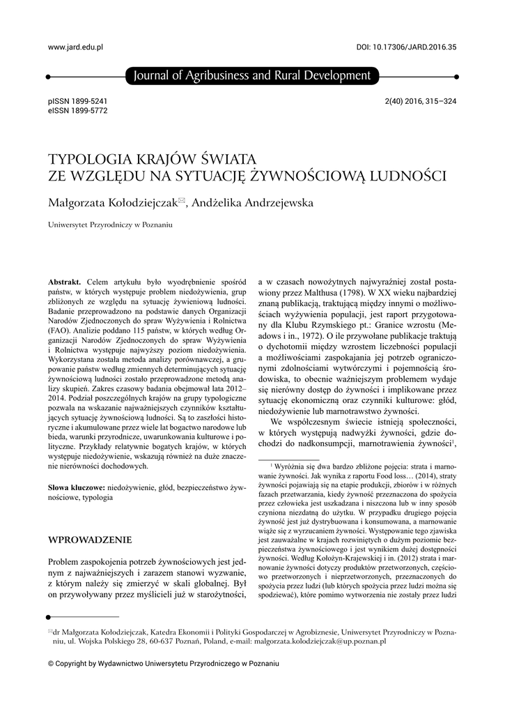 www.jard.edu.pl DOI: 10.17306/JARD.2016.35 Journal of Agribusiness and Rural Development pISSN 1899-5241 eISSN 1899-5772 2(40) 2016, 315–324 TYPOLOGIA KRAJÓW ŚWIATA ZE WZGLĘDU NA SYTUACJĘ ŻYWNOŚCIOWĄ LUDNOŚCI Małgorzata Kołodziejczak, Andżelika Andrzejewska Uniwersytet Przyrodniczy w Poznaniu Abstrakt. Celem artykułu było wyodrębnienie spośród państw, w których występuje problem niedożywienia, grup zbliżonych ze względu na sytuację żywieniową ludności. Badanie przeprowadzono na podstawie danych Organizacji Narodów Zjednoczonych do spraw Wyżywienia i Rolnictwa (FAO). Analizie poddano 115 państw, w których według Organizacji Narodów Zjednoczonych do spraw Wyżywienia i Rolnictwa występuje najwyższy poziom niedożywienia. Wykorzystana została metoda analizy porównawczej, a grupowanie państw według zmiennych determinujących sytuację żywnościową ludności zostało przeprowadzone metodą analizy skupień. Zakres czasowy badania obejmował lata 2012– 2014. Podział poszczególnych krajów na grupy typologiczne pozwala na wskazanie najważniejszych czynników kształtujących sytuację żywnościową ludności. Są to zaszłości historyczne i akumulowane przez wiele lat bogactwo narodowe lub bieda, warunki przyrodnicze, uwarunkowania kulturowe i polityczne. Przykłady relatywnie bogatych krajów, w których występuje niedożywienie, wskazują również na duże znaczenie nierówności dochodowych. Słowa kluczowe: niedożywienie, głód, bezpieczeństwo żywnościowe, typologia WPROWADZENIE Problem zaspokojenia potrzeb żywnościowych jest jednym z najważniejszych i zarazem stanowi wyzwanie, z którym należy się zmierzyć w skali globalnej. Był on przywoływany przez myślicieli już w starożytności, a w czasach nowożytnych najwyraźniej został postawiony przez Malthusa (1798). W XX wieku najbardziej znaną publikacją, traktującą między innymi o możliwościach wyżywienia populacji, jest raport przygotowany dla Klubu Rzymskiego pt.: Granice wzrostu (Meadows i in., 1972). O ile przywołane publikacje traktują o dychotomii między wzrostem liczebności populacji a możliwościami zaspokajania jej potrzeb ograniczonymi zdolnościami wytwórczymi i pojemnością środowiska, to obecnie ważniejszym problemem wydaje się nierówny dostęp do żywności i implikowane przez sytuację ekonomiczną oraz czynniki kulturowe: głód, niedożywienie lub marnotrawstwo żywności. We współczesnym świecie istnieją społeczności, w których występują nadwyżki żywności, gdzie dochodzi do nadkonsumpcji, marnotrawienia żywności1, Wyróżnia się dwa bardzo zbliżone pojęcia: strata i marnowanie żywności. Jak wynika z raportu Food loss… (2014), straty żywności pojawiają się na etapie produkcji, zbiorów i w różnych fazach przetwarzania, kiedy żywność przeznaczona do spożycia przez człowieka jest uszkadzana i niszczona lub w inny sposób czyniona niezdatną do użytku. W przypadku drugiego pojęcia żywność jest już dystrybuowana i konsumowana, a marnowanie wiąże się z wyrzucaniem żywności. Występowanie tego zjawiska jest zauważalne w krajach rozwiniętych o dużym poziomie bezpieczeństwa żywnościowego i jest wynikiem dużej dostępności żywności. Według Kołożyn-Krajewskiej i in. (2012) strata i marnowanie żywności dotyczy produktów przetworzonych, częściowo przetworzonych i nieprzetworzonych, przeznaczonych do spożycia przez ludzi (lub których spożycia przez ludzi można się spodziewać), które pomimo wytworzenia nie zostały przez ludzi 1 dr Małgorzata Kołodziejczak, Katedra Ekonomii i Polityki Gospodarczej w Agrobiznesie, Uniwersytet Przyrodniczy w Poznaniu, ul. Wojska Polskiego 28, 60-637 Poznań, Poland, e-mail: [email protected] © Copyright by Wydawnictwo Uniwersytetu Przyrodniczego w Poznaniu Kołodziejczak, M., Andrzejewska, A. (2016). Typologia krajów świata ze względu na sytuację żywnościową ludności. J. Agribus. Rural Dev., 2(40), 315–324. DOI: 10.17306/JARD.2016.35 jak również do niszczenia wyprodukowanych nadwyżek żywności. Równocześnie jednak istnieją państwa, które zmagają się z problemem niedostatecznej ilości żywności, gdzie ludność żyje w ubóstwie, cierpi głód i niedożywienie2. Dlatego też, jak podaje Kraciuk (2013), przy nadprodukcji żywności w jednych państwach i jej niedoborze w innych problem niewystarczającego bezpieczeństwa żywnościowego stanowi obecnie jedno z największych zagrożeń współczesnego świata. Koniecznością staje się identyfikowanie przyczyn utraty bezpieczeństwa żywnościowego, jak również monitorowanie sytuacji żywnościowej w poszczególnych regionach, krajach i gospodarstwach domowych3, a także szukanie sposobów przeciwdziałania utracie bezpieczeństwa spożyte – nie zostały więc wykorzystane zgodnie z przeznaczeniem. W przypadku strat wynika to z niegospodarności, błędów i nieprawidłowości w przebiegu procesów technologicznych, podczas zbiorów, w przetwórstwie, transporcie czy magazynowaniu, natomiast w przypadku marnotrawstwa z nieprawidłowej dystrybucji żywności, transportu, przechowywania i przygotowywania jej na potrzeby konsumpcji w gospodarstwach domowych i w zakładach gastronomicznych. 2 Głód i niedożywienie związane są z nieodpowiednim poziomem dostarczanej do organizmu żywności. Głód definiowany jest jako występujące w danej chwili poczucie łaknienia lub jako utrzymujący się przez dłuższy czas stan, w większym lub mniejszym stopniu powtarzający się cyklicznie, prowadzący w konsekwencji do wyniszczenia organizmu. Terminu głodu używa się obecnie dla określenia braku około czterdziestu podstawowych składników niezbędnych do utrzymania zdrowia, takich jak aminokwasy, sole mineralne czy witaminy. W ten sposób poszerzono pojęcie głodu o tzw. głód ukryty lub inaczej niedożywienie (Poczta i in., 2008a). Niedożywienie natomiast jest głębszym i szer