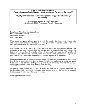 Prof. dr hab. Danuta Hübner Przewodnicząca Komisji Spraw Konstytucyjnych, Parlament Europejski "Wystąpienie podczas ceremonii wręczenia insygniów Oficera Legii Honorowej" Uroczystość wręczenia Legii Honorowej 10 listopada 2014, Ambasada Francji, Warszawa Excellence Monsieur l’Ambassadeur, Mesdames et Messieurs, Distingués invités, Mes chers amis, C’est avec un grand plaisir que je prends la parole. Je tiens à remercier très chaleureusement chacune et chacun de vous pour votre présence. Cette cérémonie est une circonstance très heureuse pour moi. L’ordre national de la Légion d’honneur est une distinction prestigieuse et une des distinctions les plus recherchées. Je pense que la considération qui entoure la Légion d’honneur dans le monde entier est non seulement due au fait qu’elle est décernée pour de mérites éminents, mais dans son fond nous retrouvons toujours les trois valeurs - qui mesurent l’humanité - la liberté, l’égalité et la fraternité. Panie Ambasadorze, te trzy wartości są dzisiaj Europie bardzo potrzebne. Przyjmuję ten Order z poczuciem, że jest to także bodziec do dalszego wysiłku na rzecz budowania oraz bardziej zintegrowanej oraz lepiej służącej obywatelom Europy. Dziękuję Republice Francuskiej za ten wielki zaszczyt. Na zakończenie chciałabym przytoczyć słowa Michela de Montaigne, który jest mi bardzo bliski i który często do mnie powraca w mojej pracy: « Il n'est rien si beau et légitime, que de faire bien l'homme et dûment ». Dziękuję bardzo za uwagę 1