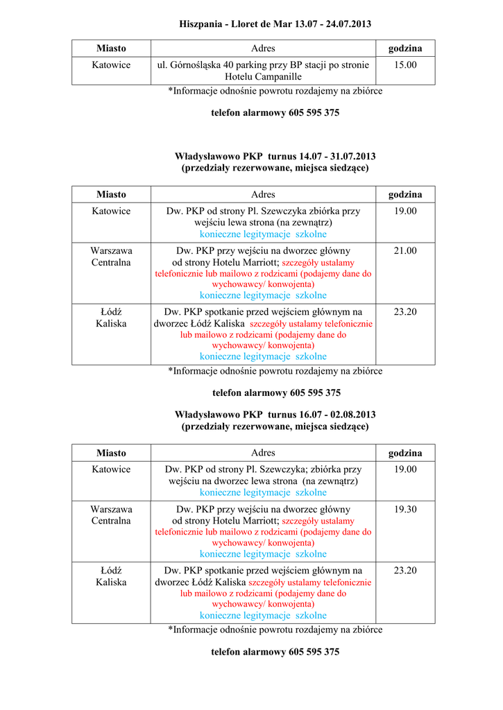 Hiszpania - Lloret de Mar 13.07 - 24.07.2013 Miasto Katowice Adres ul. Górnośląska 40 parking przy BP stacji po stronie Hotelu Campanille *Informacje odnośnie powrotu rozdajemy na zbiórce godzina 15.00 telefon alarmowy 605 595 375 Władysławowo PKP turnus 14.07 - 31.07.2013 (przedziały rezerwowane, miejsca siedzące) Miasto Adres godzina Katowice Dw. PKP od strony Pl. Szewczyka zbiórka przy wejściu lewa strona (na zewnątrz) konieczne legitymacje szkolne 19.00 Warszawa Centralna Dw. PKP przy wejściu na dworzec główny od strony Hotelu Marriott; szczegóły ustalamy 21.00 telefonicznie lub mailowo z rodzicami (podajemy dane do wychowawcy/ konwojenta) konieczne legitymacje szkolne Łódź Kaliska Dw. PKP spotkanie przed wejściem głównym na dworzec Łódź Kaliska szczegóły ustalamy telefonicznie 23.20 lub mailowo z rodzicami (podajemy dane do wychowawcy/ konwojenta) konieczne legitymacje szkolne *Informacje odnośnie powrotu rozdajemy na zbiórce telefon alarmowy 605 595 375 Władysławowo PKP turnus 16.07 - 02.08.2013 (przedziały rezerwowane, miejsca siedzące) Miasto Adres godzina Katowice Dw. PKP od strony Pl. Szewczyka; zbiórka przy wejściu na dworzec lewa strona (na zewnątrz) konieczne legitymacje szkolne 19.00 Warszawa Centralna Dw. PKP przy wejściu na dworzec główny od strony Hotelu Marriott; szczegóły ustalamy 19.30 telefonicznie lub mailowo z rodzicami (podajemy dane do wychowawcy/ konwojenta) konieczne legitymacje szkolne Łódź Kaliska Dw. PKP spotkanie przed wejściem głównym na dworzec Łódź Kaliska szczegóły ustalamy telefonicznie lub mailowo z rodzicami (podajemy dane do wychowawcy/ konwojenta) konieczne legitymacje szkolne *Informacje odnośnie powrotu rozdajemy na zbiórce telefon alarmowy 605 595 375 23.20 Białka Tatrzańska 14.07- 26.07.2013 Miasto Adres godzina Katowice Pl. Sejmu Śląskiego od ul. Jagiellońskiej przy Centrum Kultury 09.00 Kraków ul. Warszawska 24 parking przy Politechnice Krakowskiej 11.00 Kielce ul. Żelazna 18 dworzec busów prywatnych (stanowisko Expressbus) 18.20 Warszawa Centralna Dw. PKP przy wejściu na dworzec główny od strony Hotelu Marriott; szczegóły ustalamy telefonicznie lub mailowo z rodzicami (podajemy dane do wychowawcy/ konwojenta) konieczne legitymacje szkolne *Informacje odnośnie powrotu rozdajemy na zbiórce 05.00 telefon alarmowy 605 595 375 Węgry 14.07- 24.07.2013 Miasto Adres godzina Katowice Pl. Sejmu Śląskiego od ul. Jagiellońskiej przy Centrum Kultury 22.30 Kraków ul. Warszawska 24 parking przy Politechnice Krakowskiej 20.30 Łódź Dworzec Główny PKP wejście główne (przejazd PKP), w Katowicach przesiadka do autokaru docelowego konieczne legitymacje szkolne *Informacje odnośnie powrotu rozdajemy na zbiórce telefon alarmowy 605 595 375 18.30