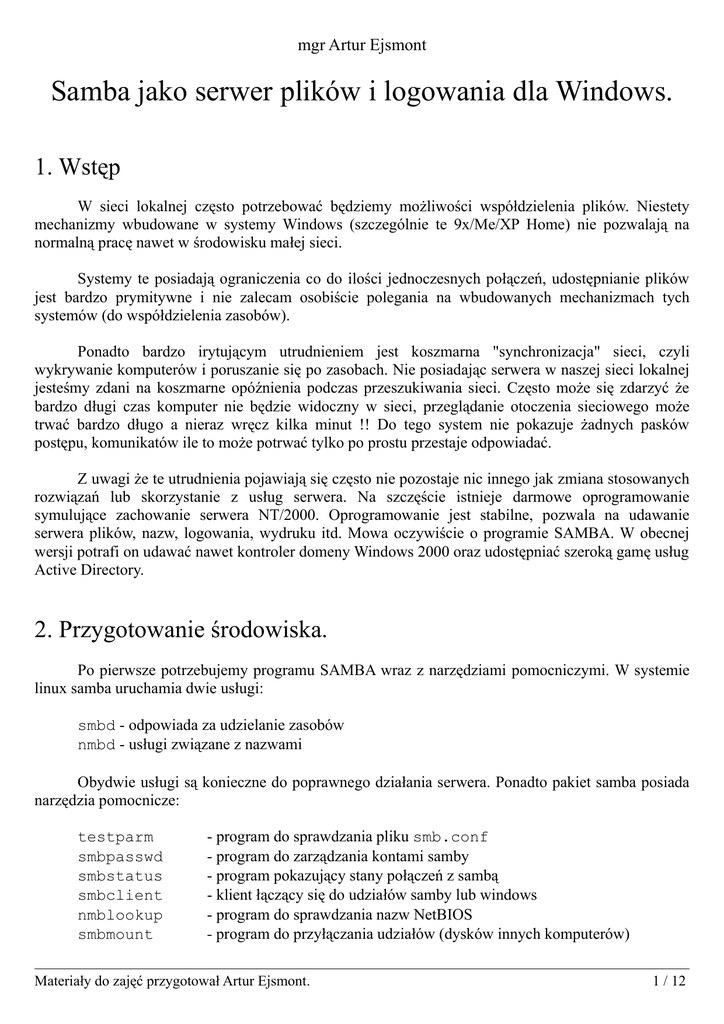 mgr Artur Ejsmont Samba jako serwer plików i logowania dla Windows. 1. Wstęp W sieci lokalnej często potrzebować będziemy możliwości współdzielenia plików. Niestety mechanizmy wbudowane w systemy Windows (szczególnie te 9x/Me/XP Home) nie pozwalają na normalną pracę nawet w środowisku małej sieci. Systemy te posiadają ograniczenia co do ilości jednoczesnych połączeń, udostępnianie plików jest bardzo prymitywne i nie zalecam osobiście polegania na wbudowanych mechanizmach tych systemów (do współdzielenia zasobów). Ponadto bardzo irytującym utrudnieniem jest koszmarna "synchronizacja" sieci, czyli wykrywanie komputerów i poruszanie się po zasobach. Nie posiadając serwera w naszej sieci lokalnej jesteśmy zdani na koszmarne opóźnienia podczas przeszukiwania sieci. Często może się zdarzyć że bardzo długi czas komputer nie będzie widoczny w sieci, przeglądanie otoczenia sieciowego może trwać bardzo długo a nieraz wręcz kilka minut !! Do tego system nie pokazuje żadnych pasków postępu, komunikatów ile to może potrwać tylko po prostu przestaje odpowiadać. Z uwagi że te utrudnienia pojawiają się często nie pozostaje nic innego jak zmiana stosowanych rozwiązań lub skorzystanie z usług serwera. Na szczęście istnieje darmowe oprogramowanie symulujące zachowanie serwera NT/2000. Oprogramowanie jest stabilne, pozwala na udawanie serwera plików, nazw, logowania, wydruku itd. Mowa oczywiście o programie SAMBA. W obecnej wersji potrafi on udawać nawet kontroler domeny Windows 2000 oraz udostępniać szeroką gamę usług Active Directory. 2. Przygotowanie środowiska. Po pierwsze potrzebujemy programu SAMBA wraz z narzędziami pomocniczymi. W systemie linux samba uruchamia dwie usługi: smbd - odpowiada za udzielanie zasobów nmbd - usługi związane z nazwami Obydwie usługi są konieczne do poprawnego działania serwera. Ponadto pakiet samba posiada narzędzia pomocnicze: testparm smbpasswd smbstatus smbclient nmblookup smbmount - program do sprawdzania pliku smb.conf - program do zarządzania kontami samby - program pokazujący stany połączeń z sambą - klient łączący się do udziałów samby lub windows - program do sprawdzania nazw NetBIOS - program do przyłączania udziałów (dysków innych komputerów) Materiały do zajęć przygotował Artur Ejsmont. 1 / 12 testprns swat - program sprawdzający czy drukarki są rozpoznawane przed sambę - program umożliwiający zarządzanie sambą poprzez przeglądarkę W knoppixie mamy to wszystko zainstalowane :-). W zależności od wersji knoppixa pliki konfiguracyjne znajdujące się w katalogu /etc/samba/ mogą być linkami symbolicznymi. Mogą też zawierać różne konfiguracje domyślne. My pracując z knopixem 4.0.2 (12.2005) będziemy mieć wszystko ładnie przygotowane. Wykonaj polecenia su cd /etc/samba/ ls -la Znajdują się tu dwa interesujące nas pliki: /etc/samba/smbpasswd - plik z kontami i hasłami serwera SAMBA /etc/samba/smb.conf - plik a konfiguracją serwera Aby uruchomić serwer SAMBA z domyślnymi ustawieniami wystarczy wykonać następujące polecenia: testparm /etc/init.d/samba stop /etc/init.d/samba start Pierwsze polecenie sprawdzi czy nie popełniliśmy błędów w naszym pliku konfiguracyjnym. Jeśli zrobimy jakieś literówki, wpiszemy złe wartości lub coś poplączemy program powinien w ładny sposób nas o tym poinformować (będziemy wiedzieć w jakim miejscu popełniliśmy błąd). Kolejne polecenia zatrzymują oraz uruchamiają usługę. Warto zawsze zatrzymywać usługę a dopiero potem uruchamiać. To zabezpieczy nas przed próbą ponownego uruchomienia (programy przeważnie i tak sobie z tym radzą). Gdyby usługa była już uruchomiona lepiej ją zatrzymać, usługi pozwalają przeważnie na (reload) przeładowanie plików konfiguracyjnych jednak doświadczenie pokazuje że nie zawsze działa to tak jak trzeba. Teraz gdy udało nam się już uruchomić domyślną konfigurację serwera możemy dodać konto i podłączyć się do serwera. Wykonajmy polecenie: smbpasswd knoppix Podane hasło będzie hasłem dostępu do udziałów samby dla użytkownika knoppix. Hasło w systemie operacyjnym (w naszym linuxie) nie ulegnie zmianie. To hasło nie ma też nic wspólnego z hasłem, jakie użytkownik o tej nazwie, może mieć na komputerze windows. Łącząc się z SAMBĄ jako użytkownik knoppix będzie musiał podać to hasło. Jeśli nasz pracownik Jan Kowalski powinien mieć dostęp do naszego serwera SAMBA dobrze byłoby utworzyć tam jego konto. Samba potrafi udzielać dostępu anonimowego do plików (bez podania hasła), można też założyć jedno konto i wszyscy nasi użytkownicy mogliby łączyć się za jego pomocą. Nie jest to jednak dobre rozwiązanie ze względów praktycznych ani bezpieczeństwa. Skoro nasi pracownicy będą używać serwera to pewnie będą chcieli mieć tam też swoje prywatne pliki. Nie chcemy też by wszyscy mogli kopiować np. filmy do katalogu z materiałami reklamowymi. Aby umożliwić kontrolę dostępu oraz prywatności powinniśmy zakładać osobne konta dla każdego użytkownika windows. Pociąga to za sobą zakładanie kont systemowych dla tych Materiały do zajęć przygotował Artur Ejsmont. 2 / 12 użytkowników jednak bez obaw :-). Dla wygody podczas budowania sieci dobrym zwyczajem byłoby przyjęcie jakiejś konwencji nazw użytkowników. Np można nadawać nazwy wedle wzorca: nazwisko małymi literami bez polskich znakow + 2 litery imienia. Wprowadzenie jakiegoś zwyczaju pozwoli nam łatwiej zakładać i zarządzać kontami zarówno na serwerze SAMBA jak i kontami shellowymi oraz kontami na stacjach roboczych. Aby dodać nowego użytkownika samby, musi on istnieć w systemie naszego linuxa. Musimy więc dodać nowego użytkownika po czym utworzyć nowe konto samby. Dla łatwiejszej kontroli dodamy też nową grupę użytkowników o nazwie dosowi i konta potrzebne sambie będziemy dodawać do tej właś