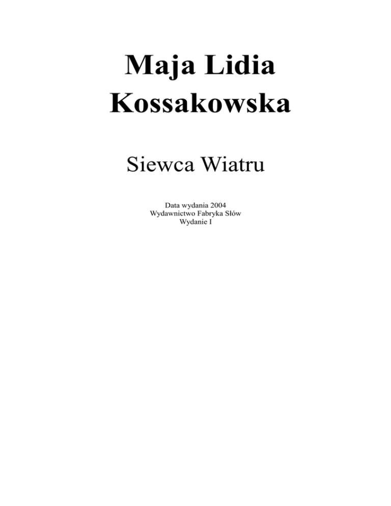 Maja Lidia Kossakowska Siewca Wiatru Data wydania 2004 Wydawnictwo Fabryka Słów Wydanie I “Pokazać piekło w niebie to nie lada wyczyn. Wszystko, co Kossakowska dozowała w swych opowiadaniach, zyskuje pełny wymiar w powieści. Pouczające. Okropne. Ciekawe. A, do diabła z tymi aniołami” Feliks W. Kres Spis treści ..........................................................................................................................4 ..........................................................................................................................6 ..........................................................................................................................7 ..........................................................................................................................47 ..........................................................................................................................89 ..........................................................................................................................123 ..........................................................................................................................169 ..........................................................................................................................197 ..........................................................................................................................216 ..........................................................................................................................257 ..........................................................................................................................296 ..........................................................................................................................334 ..........................................................................................................................373 ..........................................................................................................................403 ..........................................................................................................................426 ..........................................................................................................................480 ..........................................................................................................................514 Drodzy Czytelnicy Oddaję w wasze ręce książkę dla mnie szczególną. Jest ona bowiem jednocześnie Początkiem i Końcem. Ten pozorny paradoks łatwy jest do wytłumaczenia — Siewca Wiatru jest moją pierwszą powieścią i jednocześnie kończy “anielską” serię kilkunastu opublikowanych opowiadań. Książka kontynuuje wykreowany przeze mnie typ bohatera — istoty, pokonującej własne słabości, walecznej, dumnej, wartościowej, bogatej wewnętrznie, a jednocześnie skromnej i zdolnej do poświęceń. Liczne przygody na kilku poziomach bytu pokonuje często kosztem wyrzeczeń, a nawet własnego jestestwa. Dokładałam starań, aby postaci były silnie zarysowane, pełne namiętności: złych, dobrych, ale zawsze wyrazistych. Niezliczone przygody i klimat powieści wprowadzą was w, mam nadzieję, interesujący świat wrażeń. Poznacie wiele odcieni uczuć i postępków i przekonacie się sami, że sympatię kierujecie nie zawsze na utarty szlak, bo nic nie jest jednoznaczne. Na przestrzeni lat 2000-2003 opublikowałam czternaście opowiadań, z czego dziesięć uznać można za “anielskie” i z części których powstał zbiór, cztery o odmiennym charakterze oraz mikropowieść Zwierciadło, która w plebiscycie czytelników Sfinksa zajęła trzecią pozycję wśród nazwisk niebylejakich. Cztery z opowiadań — Sól na pastwiskach niebieskich, Żarna Niebios, Schizma i Beznogi Tancerz — uzyskały nominacje czytelników do Nagrody J. A. Zajdla, a to ostatnie otrzymało nagrodą pisarzy fantastyki Srebrny Glob. Będąc zawodową plastyczką, pragnęłam nasycić barwą kreowane postaci i tym uruchomić waszą wyobraźnię, a jako magister archeologii śródziemnomorskiej starałam się z okruchów przeszłości możliwie najprawdziwiej budować imperia, a nawet całe światy. Czy i jak mi się to udało, ocenicie sami. Z drżeniem serca powierzam wam moją opowieść i mam nadzieję, że tak jak ja polubicie moich skrzydlatych przyjaciół i wrogów. Do książki dołączyłam opracowany przeze mnie Słownik, który ułatwi wam identyfikację terminów i bohaterów. Powiem dość nieskromnie, że na ogół spotykam się z dobrym przyjęciem przez czytelników i dobrymi recenzjami i niczego bardziej nie pragnę, jak by tak się stało i z Siewcą Wiatru. Wielką dla mnie pochwałą i satysfakcją jest to, że zafascynowany moim opowiadaniem Sól na pastwiskach niebieskich pewien czytelnik nie dość, że nauczył się rysować, ale pracuje nad komiksem i robi to wspaniale! Mając głowę pełną nowych pomysłów, z którymi pragnę zapoznać czytelników, postanowiłam na razie pożegnać wykreowane przez siebie światy... No chyba że jeszcze kiedyś Daimon Frey, Drago Gamerin i inni dobrzy znajomi powrócą, aby opowiedzieć mi swoje przygody. Maja Lidia Kossakowska Beznogi Tancerz Powiadają, te w czasach przed Stworzeniem był pośród sylfów tancerz, którego kunszt nie miał sobie równych we wszystkich wszechświatach. Telto, Matka Demonów, dowiedziawszy się o tym, sprowadziła go do swego pałacu, aby zabawiać zmysły jego popisami, jednakże po niedługim czasie tancerz zatęsknił za Podniebną Krainą oraz bliskimi, z którymi zmuszony był się rozstać, i potajemnie opuścił dominium Telto. Matka Demonów, wpadłszy w wielki gniew, rozkazała pojmać uciekiniera i odrąbać mu nogi, aby przed nikim innym nie tańczył ten, kto ośmielił się wzgardzić jej łaskami. Sława tancerza nie zgasła jednak. Przeciwnie, nawet w odległych 